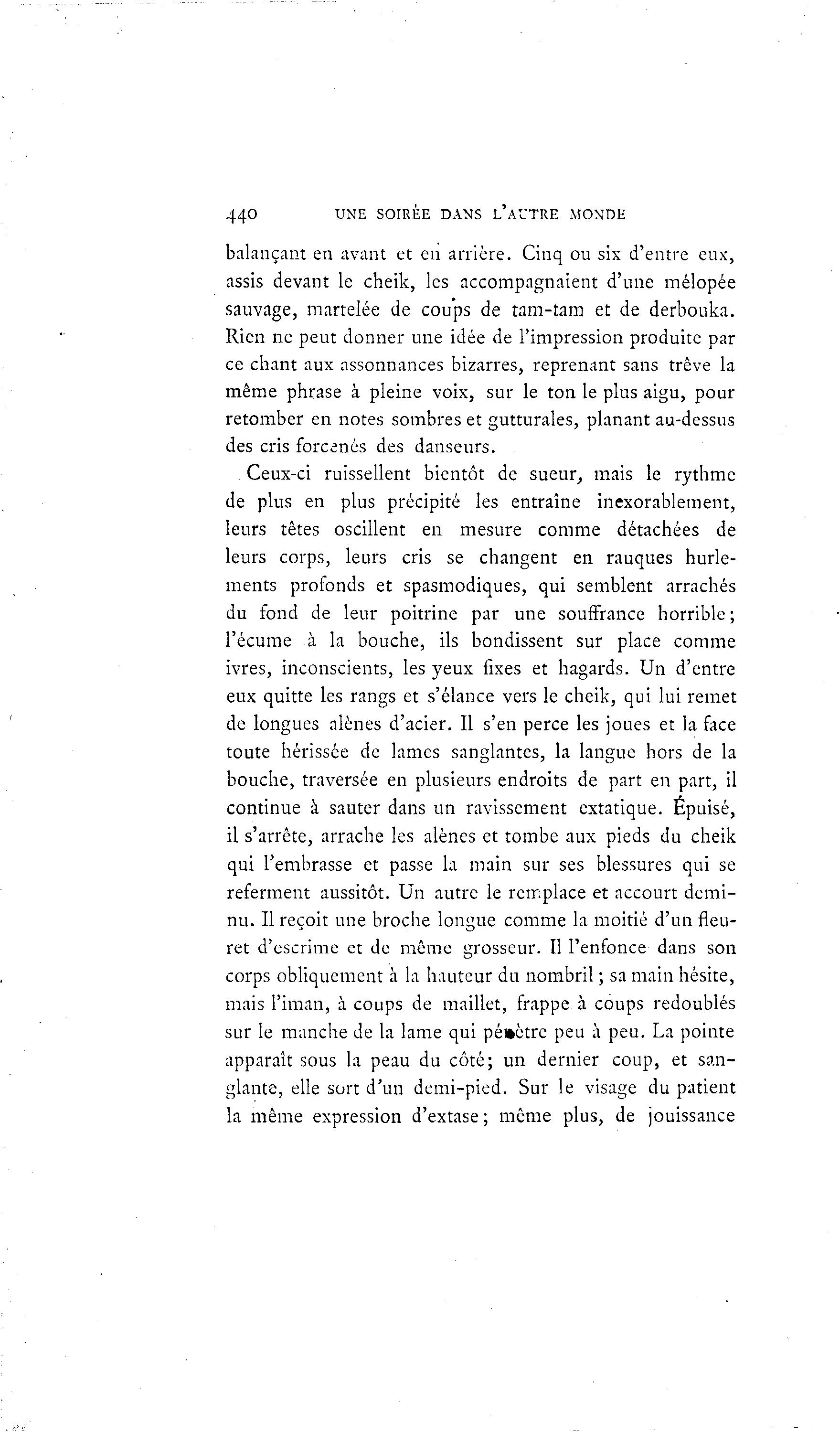 440 UNE SOIRÉE DANS L'AUTRE MONDE balançant en avant et en arrière. Cinq ou six d'entre eux, assis devant le cheik, les accompagnaient d'une mélopée sauvage, martelée de coups de tam-tam et de derbouka. Rien ne peut donner une idée de l'impression produite par ce chant aux assonnances bizarres, reprenant sans trêve la même phrase à pleine voix, sur le ton le plus aigu, pour retomber en notes sombres et gutturales, planant au-dessus des cris forcenés des danseurs. Ceux-ci ruissellent bientôt de sueur, mais le rythme de plus en plus précipité les entraîne inexorablement, leurs têtes oscillent en mesure comme détachées de leurs corps, leurs cris se changent en rauques hurle- ments profonds et spasmodiques, qui semblent arrachés du fond de leur poitrine par une souffrance horrible ; l'écume à la bouche, ils bondissent sur place comme ivres, inconscients, les yeux fixes et hagards. Un d'entre eux quitte les rangs et s'élance vers le cheik, qui lui remet de longues alênes d'acier. Il s'en perce les joues et la face toute hérissée de lames sanglantes, la langue hors de la bouche, traversée en plusieurs endroits de part en part, il continue à sauter dans un ravissement extatique. Épuisé, il s'arrête, arrache les alênes et tombe aux pieds du cheik qui l'embrasse et passe la main sur ses blessures qui se referment aussitôt. Un autre le remplace et accourt demi- nu. Il reçoit une broche longue comme la moitié d'un fleu- ret d'escrime et de même grosseur. Il l'enfonce dans son corps obliquement à la hauteur du nombril ; sa main hésite, mais l'iman, à coups de maillet, frappe à coups redoublés sur le manche de la lame qui pé»ètre peu à peu. La pointe apparaît sous la peau du côté; un dernier coup, et san- glante, elle sort d'un demi-pied. Sur le visage du patient la même expression d'extase ; même plus, de jouissance