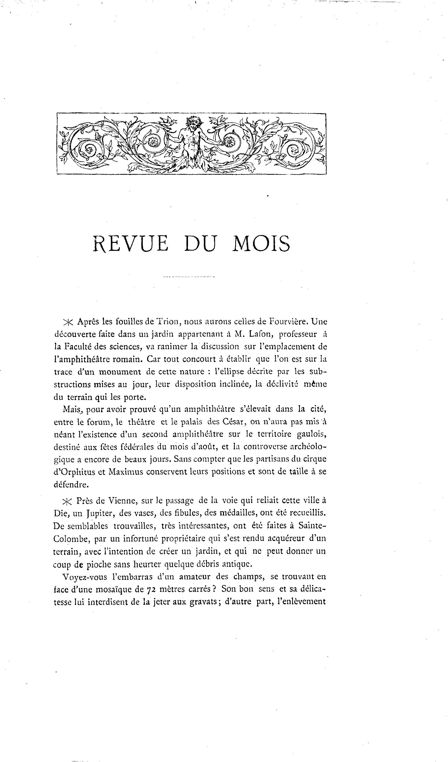 REVUE DU MOIS X Après les fouilles de Trion, nous aurons celles de Fourvière. Une découverte faite dans un jardin appartenant à M. Lafon, professeur à la Faculté des sciences, va ranimer la discussion sur l'emplacement de l'amphithéâtre romain. Car tout concourt à établir que l'on est sur la trace d'un monument de cette nature : l'ellipse décrite par les sub- structions mises au jour, leur disposition inclinée, la déclivité même du terrain qui les porte. Mais, pour avoir prouvé qu'un amphithéâtre s'élevait dans la cité, entre le forum, le théâtre et le palais des César, on n'aura pas mis à néant l'existence d'un second amphithéâtre sur le territoire gaulois, destiné aux fêtes fédérales du mois d'août, et la controverse archéolo- gique a encore de beaux jours. Sans compter que les partisans du cirque d'Orplùtus et Maximus conservent leurs positions et sont de taille à se défendre. >i< Près de Vienne, sur le passage de la voie qui reliait cette ville à Die, un Jupiter, des vases, des fibules, des médailles, ont été recueillis. De semblables trouvailles, très intéressantes, ont été faites à Sainte- Colombe, par un infortuné propriétaire qui s'est rendu acquéreur d'un terrain, avec l'intention de créer un jardin, et qui ne peut donner un coup de pioche sans heurter quelque débris antique. Voyez-vous l'embarras d'un amateur des champs, se trouvant en face d'une mosaïque de 72 mètres carrés ? Son bon sens et sa délica- tesse lui interdisent de la jeter aux gravats; d'autre part, l'enlèvement
