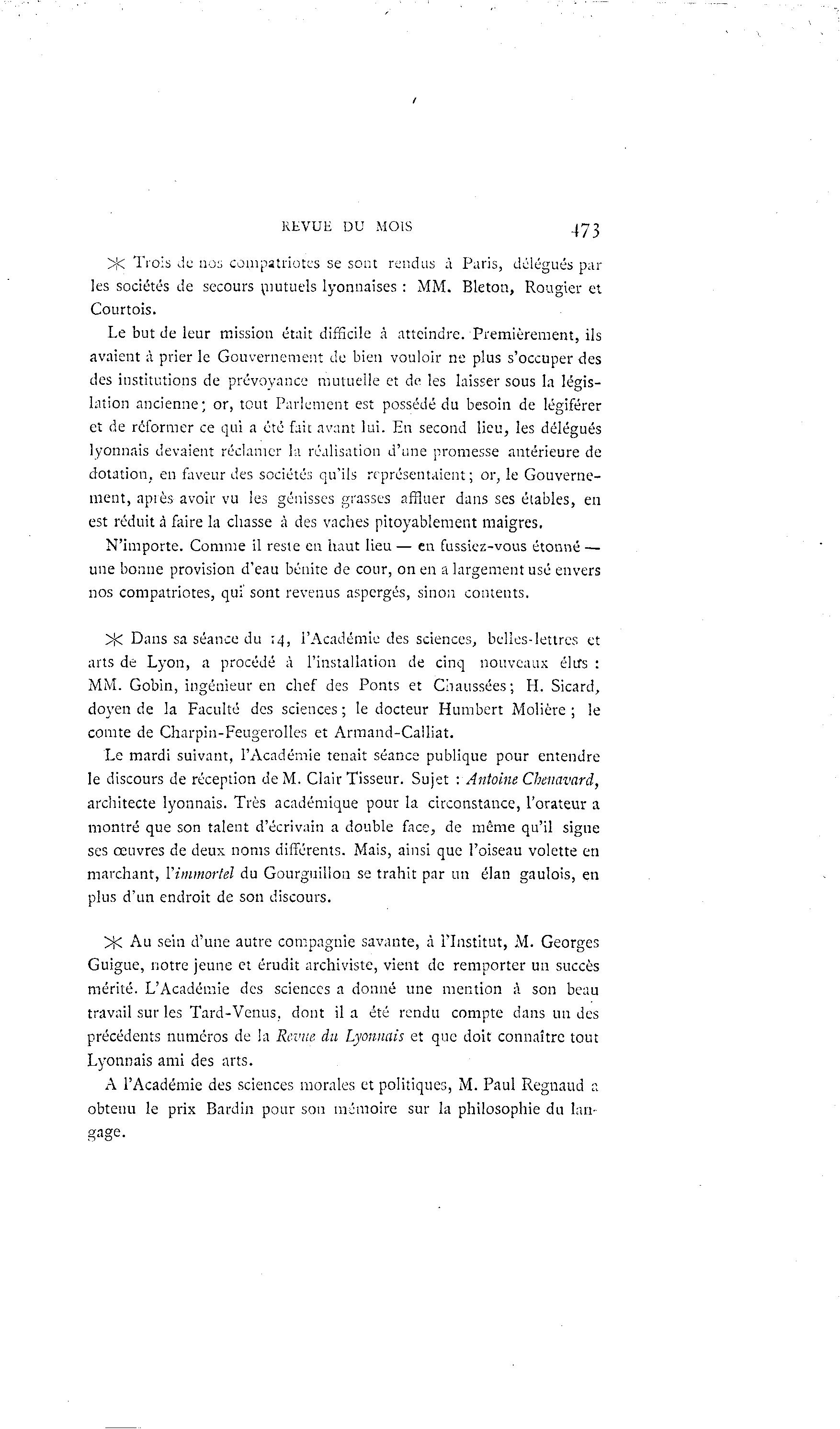 REVUE DU MOIS 473 >f< Trois Je nos compatriotes se sont rendus à Paris, délégués par les sociétés de secours mutuels lyonnaises : MM. Bleton, Rougier et Courtois. Le but de leur mission était difficile à atteindre. Premièrement, ils avaient à prier le Gouvernement de bien vouloir ne plus s'occuper des des institutions de prévoyance mutuelle et de les laisser sous la légis- lation ancienne; or, tout Parlement est possédé du besoin de légiférer et de reformer ce qui a été fait avant lui. En second lieu, les délégués lyonnais devaient réclamer la réalisation d'une promesse antérieure de dotation, en faveur des société:; qu'ils représentaient ; or, le Gouverne- ment, api es avoir vu les génisses grasses affluer dans ses élables, en est réduit à faire la chasse à des vaches pitoyablement maigres. N'importe. Comme il reste en haut lieu — en fussiez-vous étonné — une bonne provision d'eau bénite de cour, on en a largement usé envers nos compatriotes, qui' sont revenus aspergés, sinon contents. >K Dans sa séance du 14, l'Académie des sciences, belles-lettres et arts de Lyon, a procédé à l'installation de cinq nouveaux éltfs : MM. Gobin, ingénieur en chef des Ponts et Chaussées; H. Sicard, doyen de la Faculté des sciences ; le docteur Humbert Molière ; le comte de Charpin-Feugerolles et Armand-Calliat. Le mardi suivant, l'Académie tenait séance publique pour entendre le discours de réception de M. Clair Tisseur. Sujet : Antoine Chenavard, architecte lyonnais. Très académique pour la circonstance, l'orateur a montré que son talent d'écrivain a double face, de même qu'il signe ses œuvres de deux noms différents. Mais, ainsi que l'oiseau volette en marchant, Vimmorlel du Gourguilloa se trahit par un élan gaulois, en plus d'un endroit de son discours. >K Au sein d'une autre compagnie savante, à l'Institut, M. Georges Guigue, notre jeune et érudit archiviste, vient de remporter un succès mérité. L'Académie des sciences a donné une mention à son beau travail sur les Tard-Venus, dont il a été rendu compte dans un des précédents numéros de la Revue du Lyonnais et que doit connaître tout Lyonnais ami des arts. A l'Académie des sciences morales et politiques, M. Paul Regnaud a obtenu le prix Bardai pour sou mémoire sur la philosophie du lan- gage-