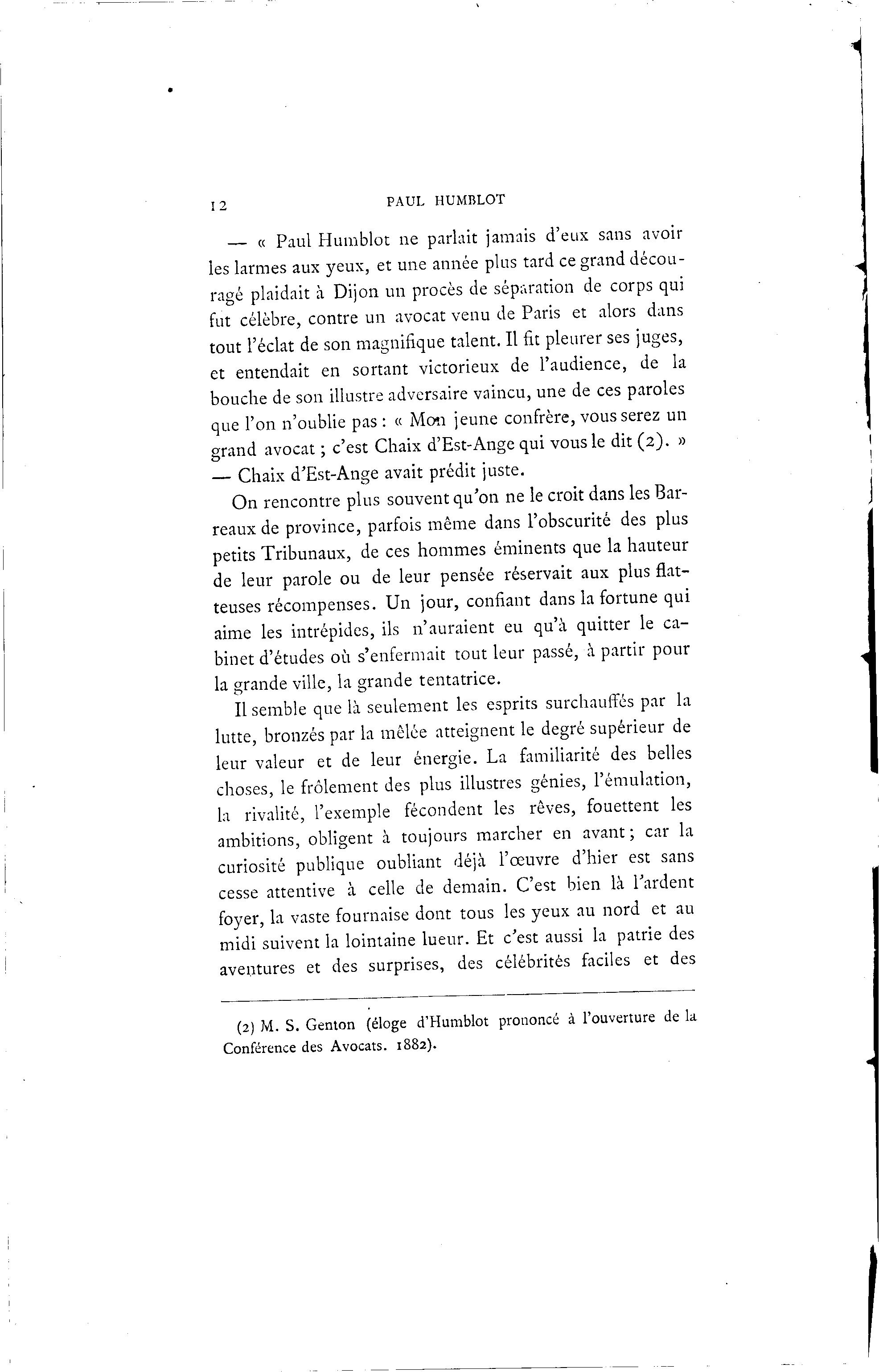 12 PAUL HUMBLOT — « Paul Humblot ne parlait jamais d'eux sans avoir les larmes aux yeux, et une année plus tard ce grand décou- ragé plaidait à Dijon un procès de séparation de corps qui fut célèbre, contre un avocat venu de Paris et alors dans tout l'éclat de son magnifique talent. Il fit pleurer ses juges, et entendait en sortant victorieux de l'audience, de la bouche de son illustre adversaire vaincu, une de ces paroles que l'on n'oublie pas : « Mon jeune confrère, vous serez un grand avocat ; c'est Chaix d'Est-Ange qui vous le dit (2). » — Chaix d'Est-Ange avait prédit juste. On rencontre plus souvent qu'on ne le croit dans les Bar- reaux de province, parfois même dans l'obscurité des plus petits Tribunaux, de ces hommes éminents que la hauteur de leur parole ou de leur pensée réservait aux plus flat- teuses récompenses. Un jour, confiant dans la fortune qui aime les intrépides, ils n'auraient eu qu'à quitter le ca- binet d'études où s'enfermait tout leur passé, à partir pour la grande ville, la grande tentatrice. Il semble que là seulement les esprits surchauffés par la lutte, bronzés par la mêlée atteignent le degré supérieur de leur valeur et de leur énergie. La familiarité des belles choses, le frôlement des plus illustres génies, l'émulation, la rivalité, l'exemple fécondent les rêves, fouettent les ambitions, obligent à toujours marcher en avant; car la curiosité publique oubliant déjà l'œuvre d'hier est sans cesse attentive à celle de demain. C'est bien là Tardent foyer, la vaste fournaise dont tous les yeux au nord et au midi suivent la lointaine lueur. Et c'est aussi la patrie des aventures et des surprises, des célébrités faciles et des (2) M. S. Genton (éloge d'Humblot prononcé à l'ouverture de la Conférence des Avocats. 1882).