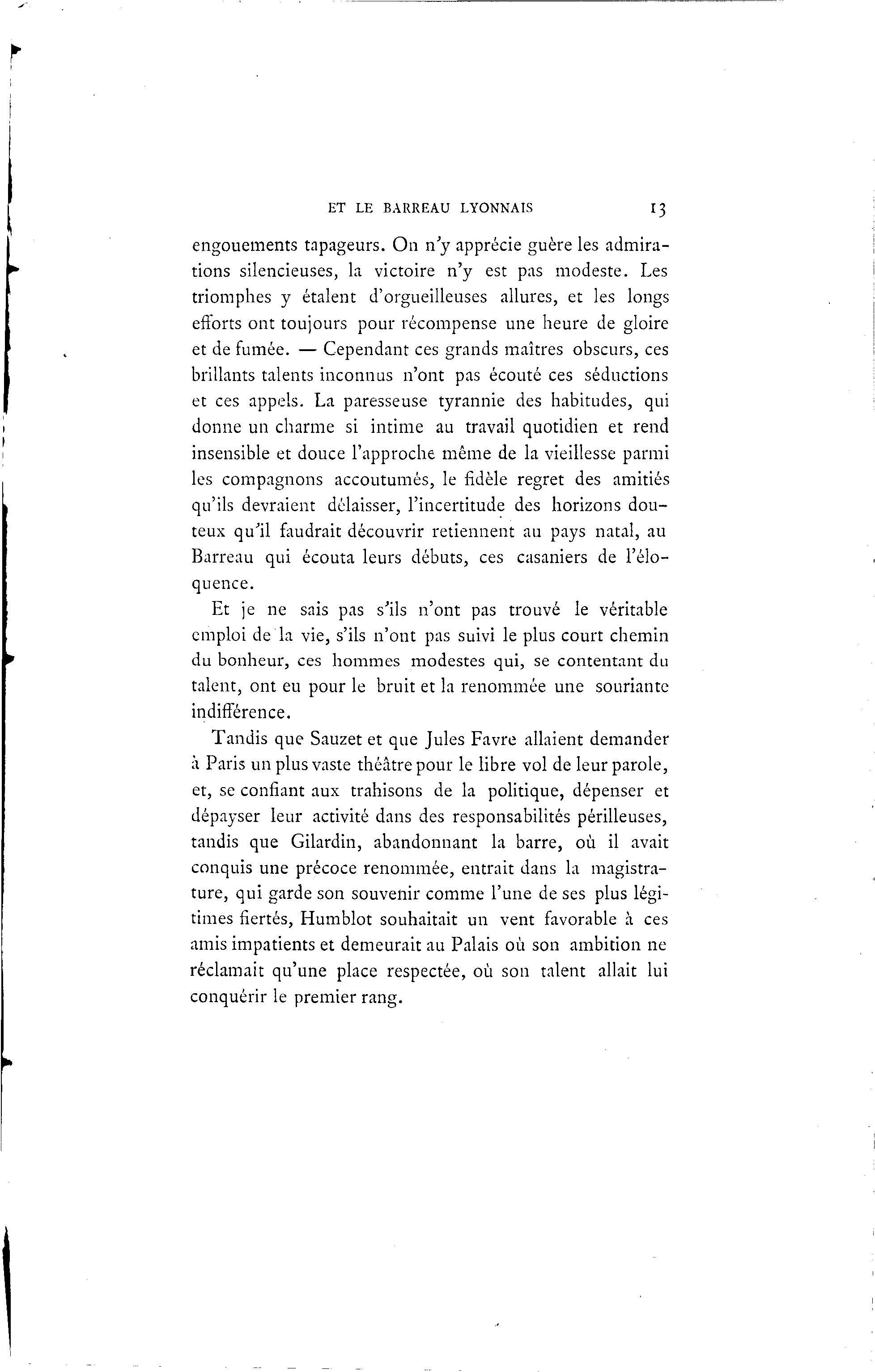ET LE BARREAU LYONNAIS 13 engouements tapageurs. On n'y apprécie guère les admira- tions silencieuses, la victoire n'y est pas modeste. Les triomphes y étalent d'orgueilleuses allures, et les longs efforts ont toujours pour récompense une heure de gloire et de fumée. — Cependant ces grands maîtres obscurs, ces brillants talents inconnus n'ont pas écouté ces séductions et ces appels. La paresseuse tyrannie des habitudes, qui donne un charme si intime au travail quotidien et rend insensible et douce l'approche même de la vieillesse parmi les compagnons accoutumés, le fidèle regret des amitiés qu'ils devraient délaisser, l'incertitude des horizons dou- teux qu'il faudrait découvrir retiennent au pays natal, au Barreau qui écouta leurs débuts, ces casaniers de l'élo- quence. Et je ne sais pas s'ils n'ont pas trouvé le véritable emploi de la vie, s'ils n'ont pas suivi le plus court chemin du bonheur, ces hommes modestes qui, se contentant du talent, ont eu pour le bruit et la renommée une souriante indifférence. Tandis que Sauzet et que Jules Favre allaient demander à Paris un plus vaste théâtre pour le libre vol de leur parole, et, se confiant aux trahisons de la politique, dépenser et dépayser leur activité dans des responsabilités périlleuses, tandis que Gilardin, abandonnant la barre, où il avait conquis une précoce renommée, entrait dans la magistra- ture, qui garde son souvenir comme l'une de ses plus légi- times fiertés, Humblot souhaitait un vent favorable à ces amis impatients et demeurait au Palais où son ambition ne réclamait qu'une place respectée, où son talent allait lui conquérir le premier rang.