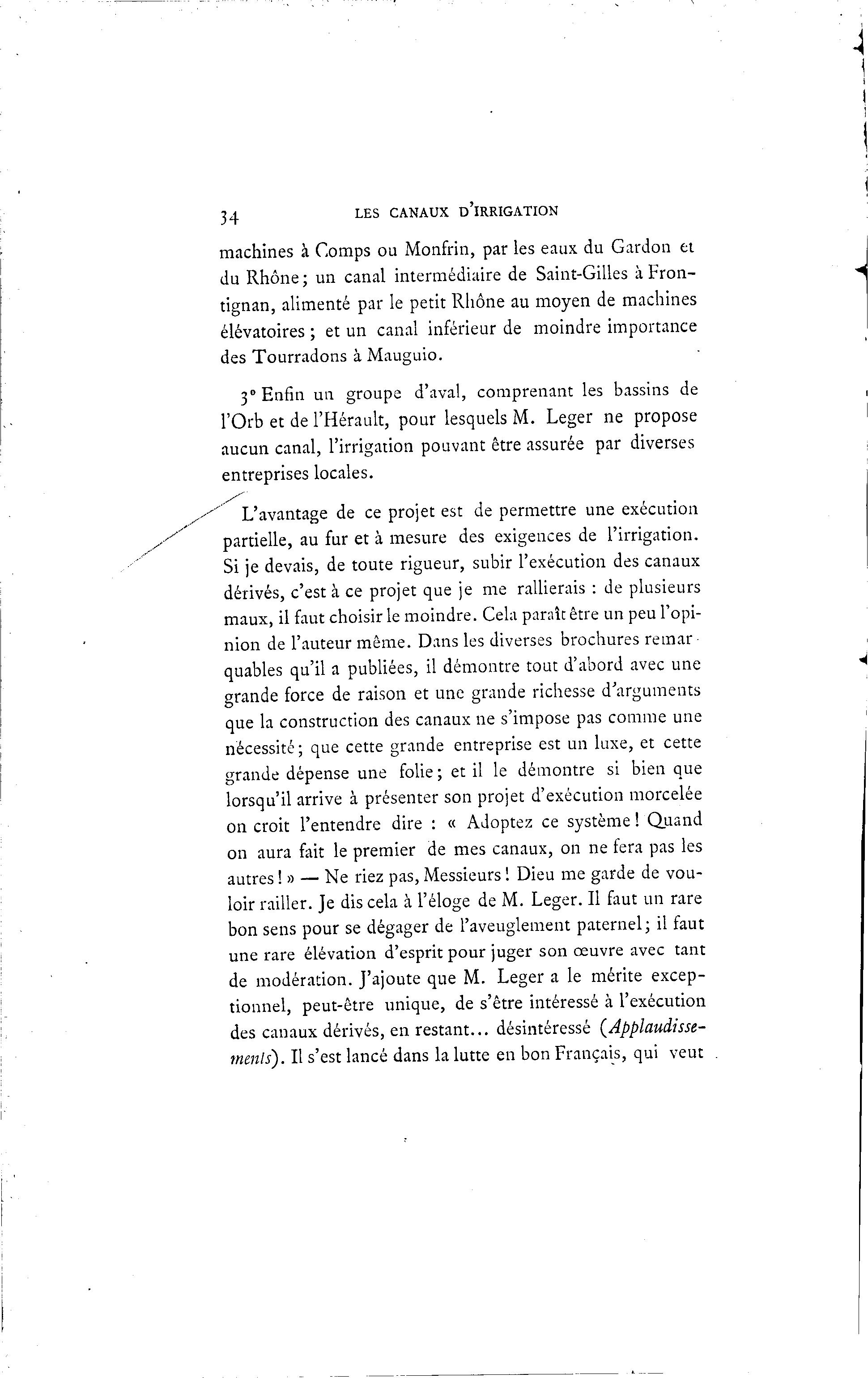34 LES CANAUX D'iRRIGATION machines à Comps ou Monfrin, par les eaux du Gardon et du Rhône ; un canal intermédiaire de Saint-Gilles à Fron- tignan, alimenté par le petit Rhône au moyen de machines élévatoires ; et un canal inférieur de moindre importance des Tourradons à Mauguio. 3° Enfin un groupe d'aval, comprenant les bassins de l'Orb et de l'Hérault, pour lesquels M. Léger ne propose aucun canal, l'irrigation pouvant être assurée par diverses entreprises locales. L'avantage de ce projet est de permettre une exécution partielle, au fur et à mesure des exigences de l'irrigation. Si je devais, de toute rigueur, subir l'exécution des canaux dérivés, c'est à ce projet que je me rallierais : de plusieurs maux, il faut choisir le moindre. Cela paraît être un peu l'opi- nion de l'auteur même. Dans les diverses brochures remar quables qu'il a publiées, il démontre tout d'abord avec une grande force de raison et une grande richesse d'arguments que la construction des canaux ne s'impose pas comme une nécessité; que cette grande entreprise est un luxe, et cette grande dépense une folie ; et il le démontre si bien que lorsqu'il arrive à présenter son projet d'exécution morcelée on croit l'entendre dire : « Adoptez ce système ! Quand on aura fait le premier de mes canaux, on ne fera pas les autres ! » — Ne riez pas, Messieurs ! Dieu me garde de vou- loir railler. Je dis cela à l'éloge de M. Léger. Il faut un rare bon sens pour se dégager de l'aveuglement paternel; il faut une rare élévation d'esprit pour juger son œuvre avec tant de modération. J'ajoute que M. Léger a le mérite excep- tionnel, peut-être unique, de s'être intéressé à l'exécution des canaux dérivés, en restant... désintéressé (Applaudisse- ments). Il s'est lancé dans la lutte en bon Français, qui veut