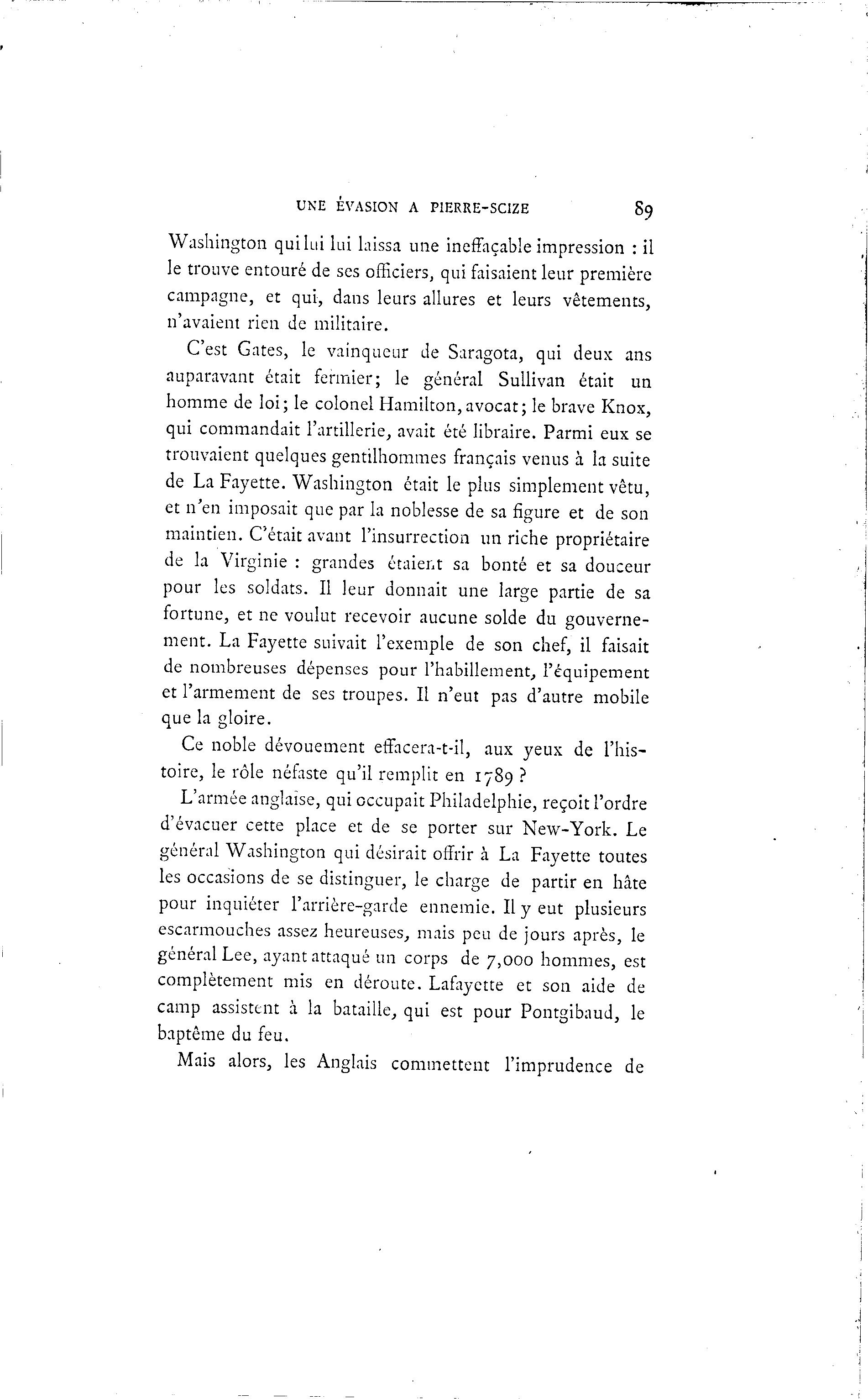 UNE ÉVASION A P1ERRE-SC1ZE 89 Washington qui lui lui laissa une ineffaçable impression : il le trouve entouré de ses officiers, qui faisaient leur première campagne, et qui, dans leurs allures et leurs vêtements, n'avaient rien de militaire. C'est Gates, le vainqueur de Saragota, qui deux ans auparavant était fermier; le général Sullivan était un homme de loi; le colonel Hamilton,avocat; le brave Knox, qui commandait l'artillerie, avait été libraire. Parmi eux se trouvaient quelques gentilhommes français venus à la suite de La Fayette. Washington était le plus simplement vêtu, et n'en imposait que par la noblesse de sa figure et de son maintien. C'était avant l'insurrection un riche propriétaire de la Virginie : grandes étaient sa bonté et sa douceur pour les soldats. Il leur donnait une large partie de sa fortune, et ne voulut recevoir aucune solde du gouverne- ment. La Fayette suivait l'exemple de son chef, il faisait de nombreuses dépenses pour l'habillement, l'équipement et l'armement de ses troupes. Il n'eut pas d'autre mobile que la gloire. Ce noble dévouement effacera-t-il, aux yeux de l'his- toire, le rôle néfaste qu'il remplit en 1789 ? L'armée anglaise, qui occupait Philadelphie, reçoit l'ordre d'évacuer cette place et de se porter sur New-York. Le général Washington qui désirait offrir à La Fayette toutes les occasions de se distinguer, le charge de partir en hâte pour inquiéter l'arrière-garde ennemie. Il y eut plusieurs escarmouches assez heureuses, mais peu de jours après, le général Lee, ayant attaqué un corps de 7,000 hommes, est complètement mis en déroute. Lafayctte et son aide de camp assistent à la bataille, qui est pour Pontgibaud, le baptême du feu. Mais alors, les Anglais commettent l'imprudence de
