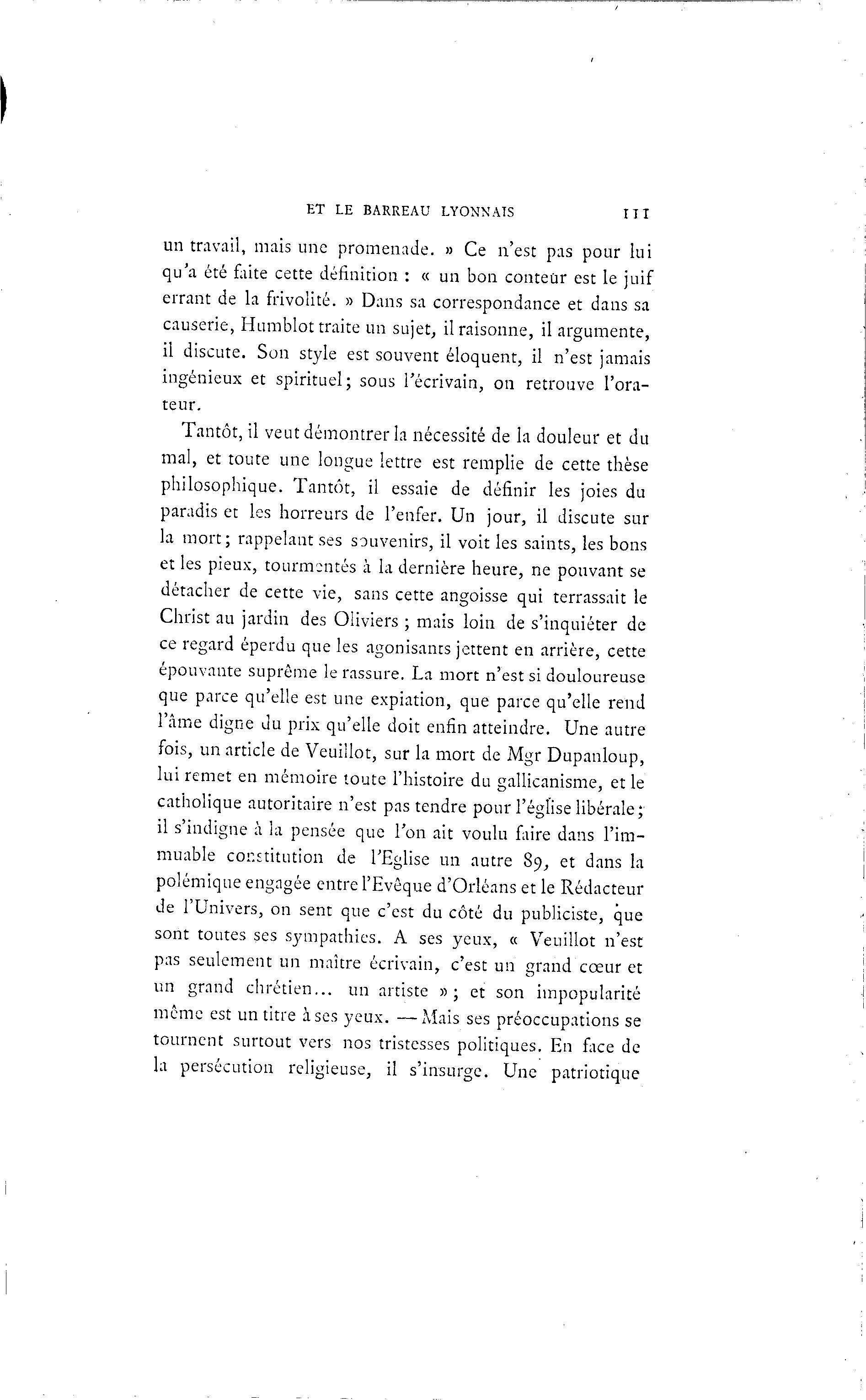 ET LE BARREAU LYONNAIS III un travail, mais une promenade. » Ce n'est pas pour lui qu'a été faite cette définition : « un bon conteur est le juif errant de la frivolité. » Dans sa correspondance et dans sa causerie, Humblot traite un sujet, il raisonne, il argumente, il discute. Son style est souvent éloquent, il n'est jamais ingénieux et spirituel; sous l'écrivain, on retrouve l'ora- teur. Tantôt, il veut démontrer la nécessité de la douleur et du mal, et toute une longue lettre est remplie de cette thèse philosophique. Tantôt, il essaie de définir les joies du paradis et les horreurs de l'enfer. Un jour, il discute sur la mort; rappelant ses souvenirs, il voit les saints, les bons et les pieux, tourmentés à la dernière heure, ne pouvant se détacher de cette vie, sans cette angoisse qui terrassait le Christ au jardin des Oliviers ; mais loin de s'inquiéter de ce regard éperdu que les agonisants jettent en arrière, cette épouvante suprême le rassure. La mort n'est si douloureuse que parce qu'elle est une expiation, que parce qu'elle rend l'âme digne du prix qu'elle doit enfin atteindre. Une autre fois, un article de Veuillot, sur la mort de Mgr Dupanloup, lui remet en mémoire toute l'histoire du gallicanisme, et le catholique autoritaire n'est pas tendre pour l'église libérale; il s'indigne à la pensée que l'on ait voulu faire dans l'im- muable constitution de l'Eglise un autre 89, et dans la polémique engagée entre l'Evêque d'Orléans et le Rédacteur de l'Univers, on sent que c'est du côté du publiciste, que sont toutes ses sympathies. A ses yeux, « Veuillot n'est pas seulement un maître écrivain, c'est un grand cœur et un grand chrétien... un artiste »; et son impopularité même est un titre à ses yeux. —Mais ses préoccupations se tournent surtout vers nos tristesses politiques. En face de la persécution religieuse, il s'insurge. Une patriotique