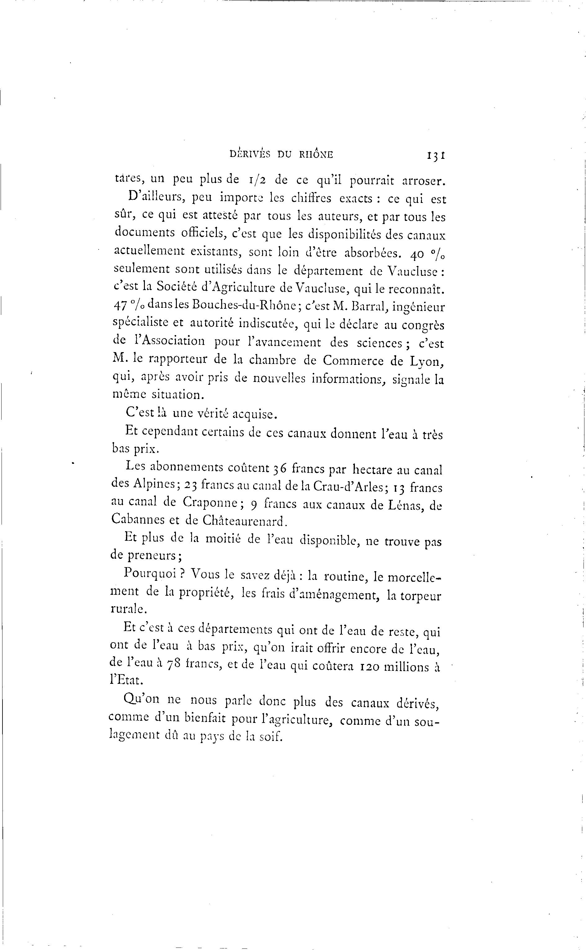 DERIVES DU RHÔNE I3I tires, un peu plus de 1/2 de ce qu'il pourrait arroser. D'ailleurs, peu importe les chiffres exacts : ce qui est sûr, ce qui est attesté par tous les auteurs, et par tous les documents officiels, c'est que les disponibilités des canaux actuellement existants, sont loin d'être absorbées. 40 % seulement sont utilisés dans le département de Vaucluse : c'est la Société d'Agriculture de Vaucluse, qui le reconnaît. 47 % dans les Bouches-du-Rhône; c'est M. Barrai, ingénieur spécialiste et autorité indiscutée, qui le déclare au congrès de l'Association pour l'avancement des sciences ; c'est M. le rapporteur de la chambre de Commerce de Lyon, qui, après avoir pris de nouvelles informations,, signale la même situation. C'est là une vérité acquise. Et cependant certains de ces canaux donnent l'eau à très bas prix. Les abonnements coûtent 36 francs par hectare au canal des Alpines; 23 francs au canal de la Crau-d'Arles; 13 francs au canal de Craponne ; 9 francs aux canaux de Lénas, de Cabannes et de Châteaurenard. Et plus de la moitié de l'eau disponible, ne trouve pas de preneurs ; Pourquoi ? Vous le savez déjà : la routine, le morcelle- ment de la propriété, les frais d'aménagement, la torpeur rurale. Et c'est à ces départements qui ont de l'eau de reste, qui ont de l'eau à bas prix, qu'on irait offrir encore de l'eau, de l'eau à 78 francs, et de l'eau qui coûtera 120 millions à l'Etat. Qu'on ne nous parle donc plus des canaux dérivés, comme d'un bienfait pour l'agriculture, comme d'un sou- lagement dû au pays de la soif.