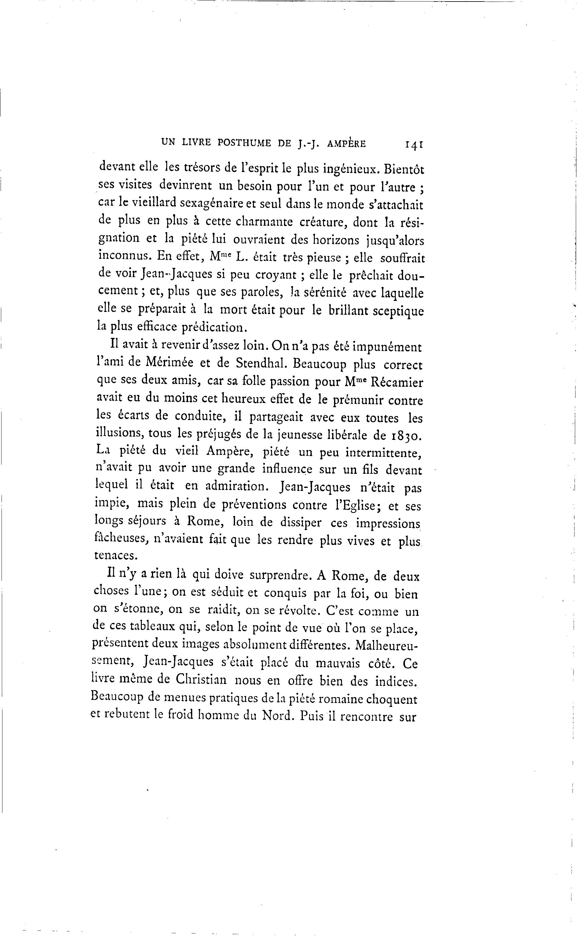 UN LIVRE POSTHUME DE J.-J. AMPERE 141 devant elle les trésors de l'esprit le plus ingénieux. Bientôt ses visites devinrent un besoin pour l'un et pour l'autre ; car le vieillard sexagénaire et seul dans le monde s'attachait de plus en plus à cette charmante créature, dont la rési- gnation et la piété lui ouvraient des horizons jusqu'alors inconnus. En effet, Mme L. était très pieuse ; elle souffrait de voir Jean-Jacques si peu croyant ; elle le prêchait dou- cement ; et, plus que ses paroles, !a sérénité avec laquelle elle se préparait à la mort était pour le brillant sceptique la plus efficace prédication. Il avait à revenir d'assez loin. On n'a pas été impunément l'ami de Mérimée et de Stendhal. Beaucoup plus correct que ses deux amis, car sa folle passion pour Mme Récamier avait eu du moins cet heureux effet de le prémunir contre les écarts de conduite, il partageait avec eux toutes les illusions, tous les préjugés de la jeunesse libérale de 1830. La piété du vieil Ampère, piété un peu intermittente, n'avait pu avoir une grande influence sur un fils devant lequel il était en admiration. Jean-Jacques n'était pas impie, mais plein de préventions contre l'Eglise; et ses longs séjours à Rome, loin de dissiper ces impressions fâcheuses, n'avaient fait que les rendre plus vives et plus tenaces. Il n'y a rien là qui doive surprendre. A Rome, de deux choses l'une; on est séduit et conquis par la foi, ou bien on s'étonne, on se raidit, on se révolte. C'est comme un de ces tableaux qui, selon le point de vue où l'on se place, présentent deux images absolument différentes. Malheureu- sement, Jean-Jacques s'était placé du mauvais côté. Ce livre même de Christian nous en offre bien des indices. Beaucoup de menues pratiques de la piété romaine choquent et rebutent le froid homme du Nord. Puis il rencontre sur