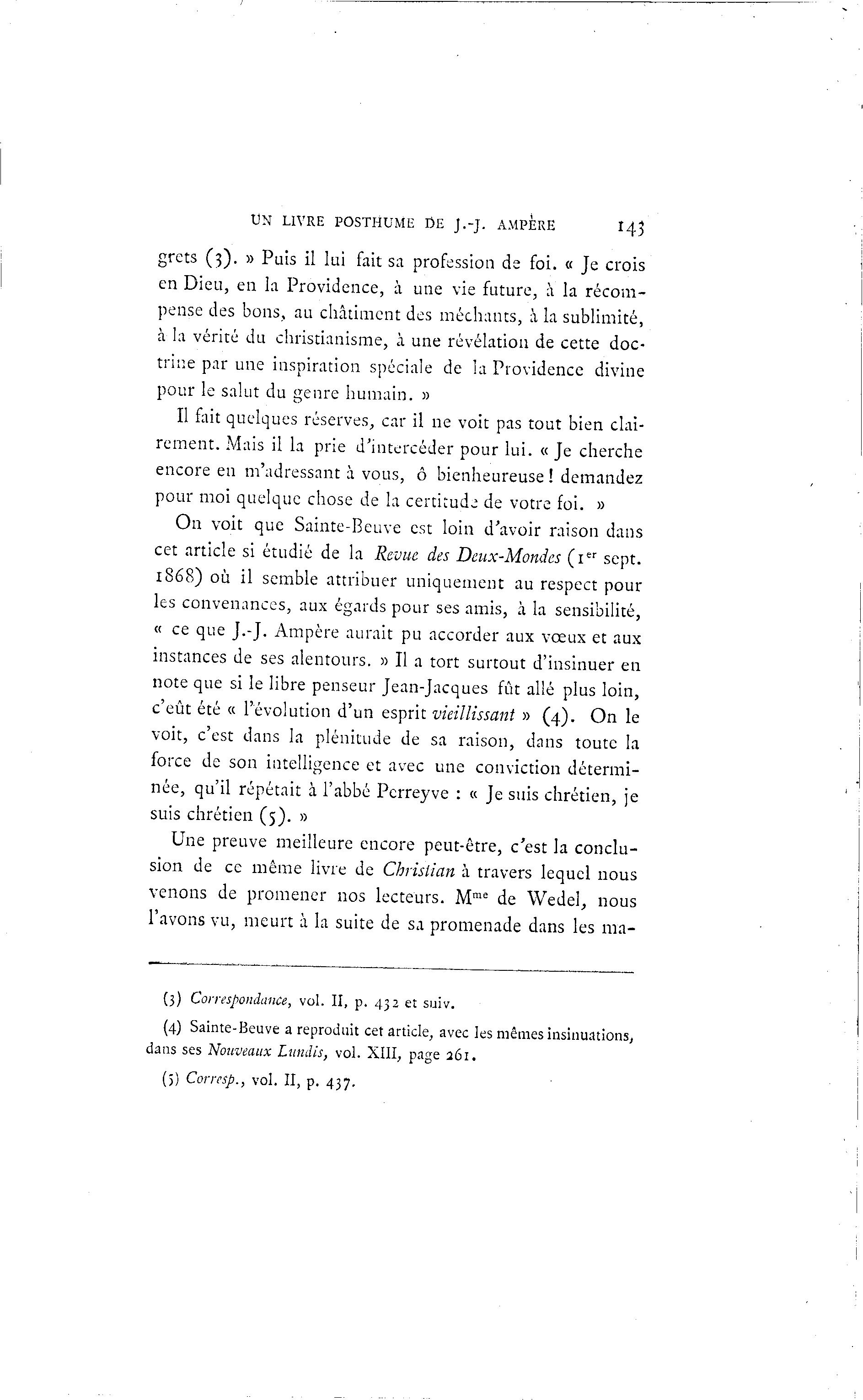 UN LIVRE POSTHUME DE J.-J. AMPERE I43 grets (3). » Puis il lui fait sa profession de foi. « Je crois en Dieu, en la Providence, à une vie future, à la récom- pense des bons, au châtiment des méchants, à la sublimité, à la vérité du christianisme, à une révélation de cette doc- trine par une inspiration spéciale de la Providence divine pour le salut du genre humain. » Il fait quelques réserves, car il ne voit pas tout bien clai- rement. Mais il la prie d'intercéder pour lui. « Je cherche encore en m'adressant à vous, ô bienheureuse ! demandez pour moi quelque chose de la certitude de votre foi. » On voit que Sainte-Beuve est loin d'avoir raison dans cet article si étudié de la Revue des Deux-Mondes ( i e r sept. 1868) où il semble attribuer uniquement au respect pour les convenances, aux égards pour ses amis, à la sensibilité, « ce que J.-J. Ampère aurait pu accorder aux vœux et aux instances de ses alentours. » Il a tort surtout d'insinuer en note que si le libre penseur Jean-Jacques fût allé plus loin, c'eût été « l'évolution d'un esprit vieillissant » (4). On le voit, c'est dans la plénitude de sa raison, dans toute la force de son intelligence et avec une conviction détermi- née, qu'il répétait à l'abbé Pcrreyve : « Je suis chrétien, je suis chrétien (5). » Une preuve meilleure encore peut-être, c'est la conclu- sion de ce même livre de Christian à travers lequel nous venons de promener nos lecteurs. Mme de Wedel, nous l'avons vu, meurt à la suite de sa promenade dans les ma- (3) Correspondance, vol. II, p. 432 et suiv. (4) Sainte-Beuve a reproduit cet article, avec les mêmes insinuations, dans ses Nouveaux Lundis, vol. XIII, page 261. (5) Corresp., vol. II, p. 437.