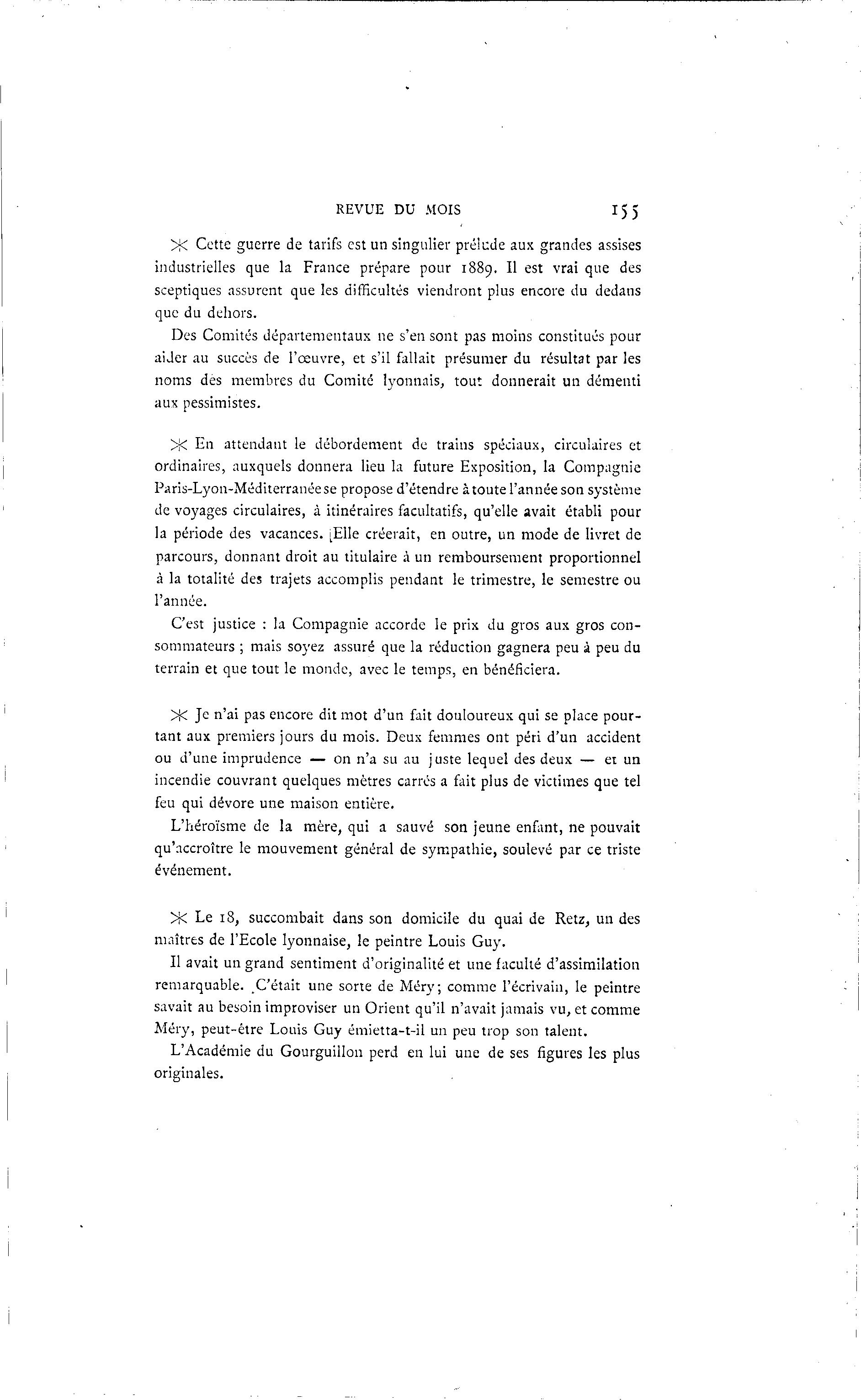 REVUE DU MOIS 15 5 >K Cette guerre de tarifs est un singulier prélude aux grandes assises industrielles que la France prépare pour 1889. Il est vrai que des sceptiques assurent que les difficultés viendront plus encore du dedans que du dehors. Des Comités départementaux ne s'en sont pas moins constitués pour aider au succès de l'œuvre, et s'il fallait présumer du résultat par les noms des membres du Comité lyonnais, tout donnerait un démenti aux pessimistes. >K En attendant le débordement de trains spéciaux, circulaires et ordinaires, auxquels donnera lieu la future Exposition, la Compagnie Paris-Lyon-Méditerranée se propose d'étendre à toute l'année son système de voyages circulaires, à itinéraires facultatifs, qu'elle avait établi pour la période des vacances. [Elle créerait, en outre, un mode de livret de parcours, donnant droit au titulaire à un remboursement proportionnel à la totalité des trajets accomplis pendant le trimestre, le semestre ou l'année. C'est justice : la Compagnie accorde le prix du gros aux gros con- sommateurs ; mais soyez assuré que la réduction gagnera peu à peu du terrain et que tout le monde, avec le temps, en bénéficiera. >j< Je n'ai pas encore dit mot d'un fait douloureux qui se place pour- tant aux premiers jours du mois. Deux femmes ont péri d'un accident ou d'une imprudence — on n'a su au juste lequel des deux — et un incendie couvrant quelques mètres carrés a fait plus de victimes que tel feu qui dévore une maison entière. L'héroïsme de la mère, qui a sauvé son jeune enfant, ne pouvait qu'accroître le mouvement général de sympathie, soulevé par ce triste événement. >K Le 18, succombait dans son domicile du quai de Retz, un des maîtres de l'Ecole lyonnaise, le peintre Louis Guy. Il avait un grand sentiment d'originalité et une faculté d'assimilation remarquable. C'était une sorte de Méry; comme l'écrivain, le peintre savait au besoin improviser un Orient qu'il n'avait jamais vu, et comme Méry, peut-être Louis Guy émietta-t-il un peu trop son talent. L'Académie du Gourguillon perd en lui une de ses figures les plus originales.