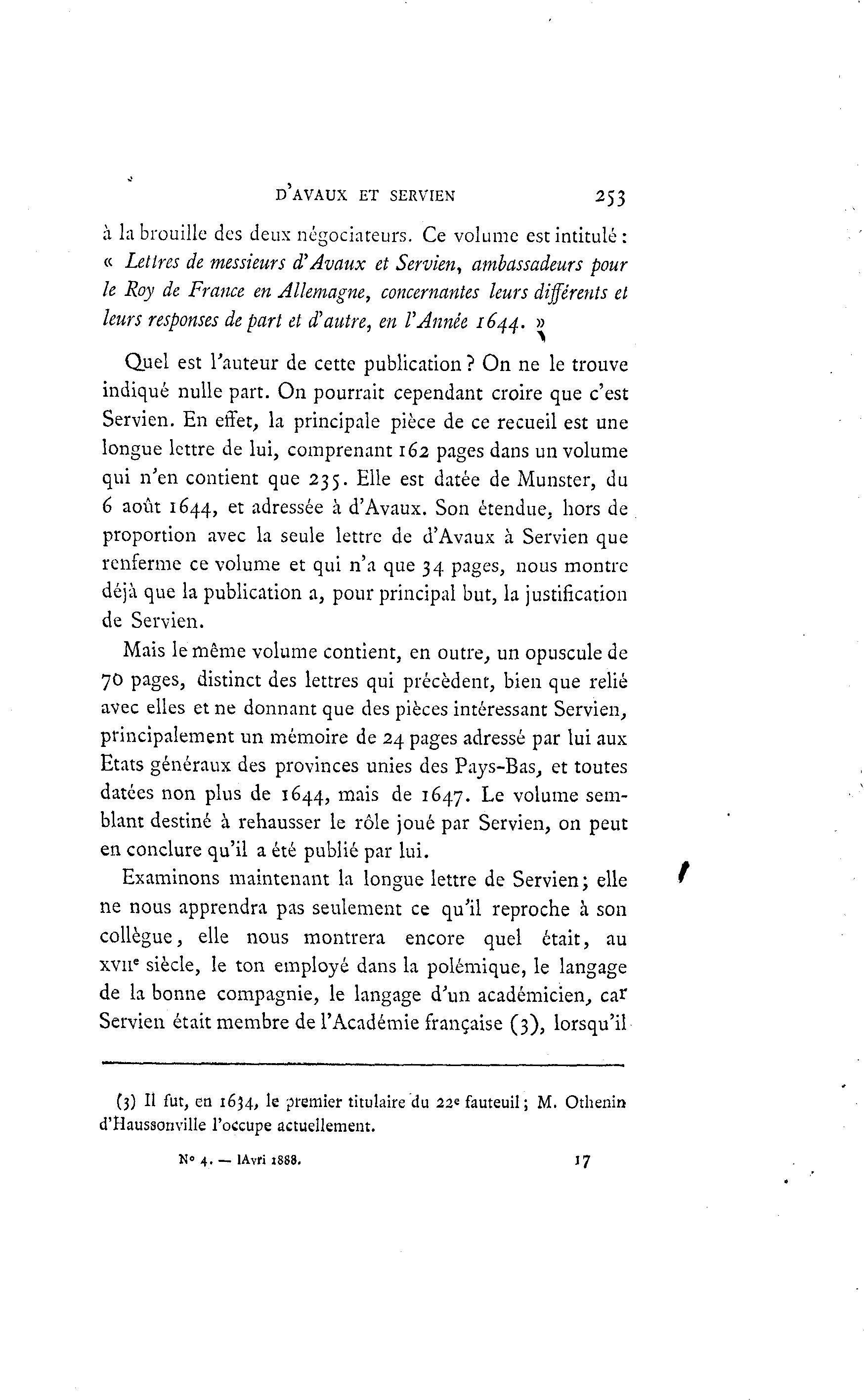 D'A VAUX ET SERVIEN 253 à la brouille des deux négociateurs. Ce volume est intitulé : « Lettres de messieurs d'Avaux et Servien, ambassadeurs pour le Roy de France en Allemagne, concernantes leurs différents et leurs responses de part et d'autre, en VAnnée 1644. » Quel est l'auteur de cette publication ? On ne le trouve indiqué nulle part. On pourrait cependant croire que c'est Servien. En effet, la principale pièce de ce recueil est une longue lettre de lui, comprenant 162 pages dans un volume qui n'en contient que 235. Elle est datée de Munster, du 6 août 1644, et adressée à d'Avaux. Son étendue, hors de proportion avec la seule lettre de d'Avaux à Servien que renferme ce volume et qui n'a que 34 pages, nous montre déjà que la publication a, pour principal but, la justification de Servien. Mais le même volume contient, en outre, un opuscule de 70 pages, distinct des lettres qui précèdent, bien que relié avec elles et ne donnant que des pièces intéressant Servien, principalement un mémoire de 24 pages adressé par lui aux Etats généraux des provinces unies des Pays-Bas, et toutes datées non plus de 1644, mais de 1647. Le volume sem- blant destiné à rehausser le rôle joué par Servien, on peut en conclure qu'il a été publié par lui. Examinons maintenant la longue lettre de Servien; elle ne nous apprendra pas seulement ce qu'il reproche à son collègue, elle nous montrera encore quel était, au xvn e siècle, le ton employé dans la polémique, le langage de la bonne compagnie, le langage d'un académicien, car Servien était membre de l'Académie française (3), lorsqu'il (3) Il fut, en 1634, le premier titulaire du 22« fauteuil; M. Othenin d'Haussonville l'occupe actuellement. N° 4 . — lAvri J888. 17