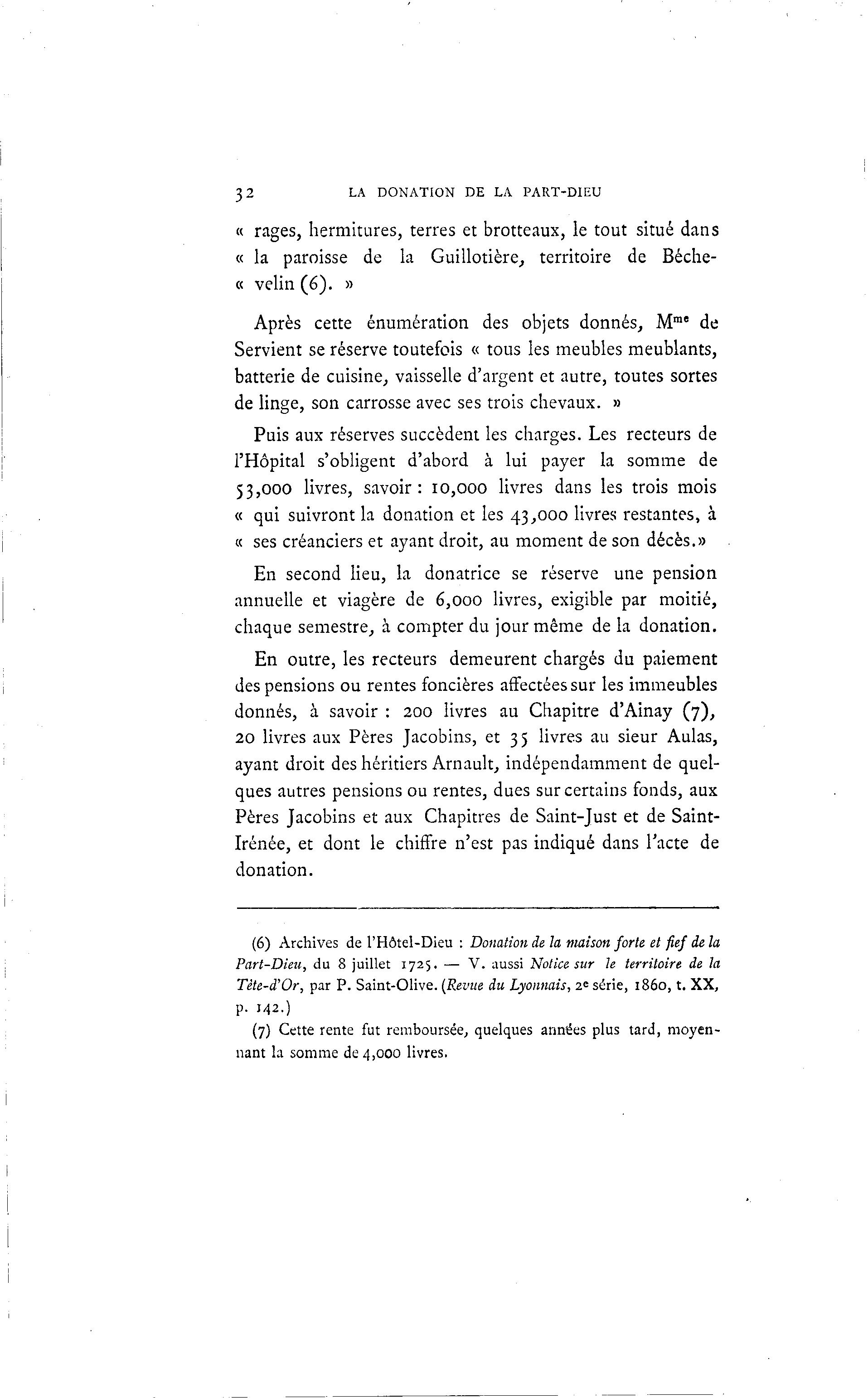 32 LA DONATION DE LA PART-DIEU « rages, hermitures, terres et brotteaux, le tout situé dans « la paroisse de la Guillotière, territoire de Béche- « velin (6). » Après cette énumération des objets donnés, Mme de Servient se réserve toutefois « tous les meubles meublants, batterie de cuisine, vaisselle d'argent et autre, toutes sortes de linge, son carrosse avec ses trois chevaux. » Puis aux réserves succèdent les charges. Les recteurs de l'Hôpital s'obligent d'abord à lui payer la somme de 53,000 livres, savoir: 10,000 livres dans les trois mois « qui suivront la donation et les 43,000 livres restantes, à « ses créanciers et ayant droit, au moment de son décès.» En second lieu, la donatrice se réserve une pension annuelle et viagère de 6,000 livres, exigible par moitié, chaque semestre, à compter du jour même de la donation. En outre, les recteurs demeurent chargés du paiement des pensions ou rentes foncières affectées sur les immeubles donnés, à savoir : 200 livres au Chapitre d'Ainay (7), 20 livres aux Pères Jacobins, et 35 livres au sieur Aulas, ayant droit des héritiers Arnault, indépendamment de quel- ques autres pensions ou rentes, dues sur certains fonds, aux Pères Jacobins et aux Chapitres de Saint-Just et de Saint- Irénée, et dont le chiffre n'est pas indiqué dans l'acte de donation. (6) Archives de l'Hôtel-Dieu : Donation de la maison forte et fief de la Part-Dieu, du 8 juillet 1725. — V. aussi Notice sur le territoire de la Téte-d'Or, par P. Saint-Olive. (Revue du Lyonnais, 2e série, 1860, t. XX, p. 142.) (7) Cette rente fut remboursée, quelques années plus tard, moyen- nant la somme de 4,000 livres.