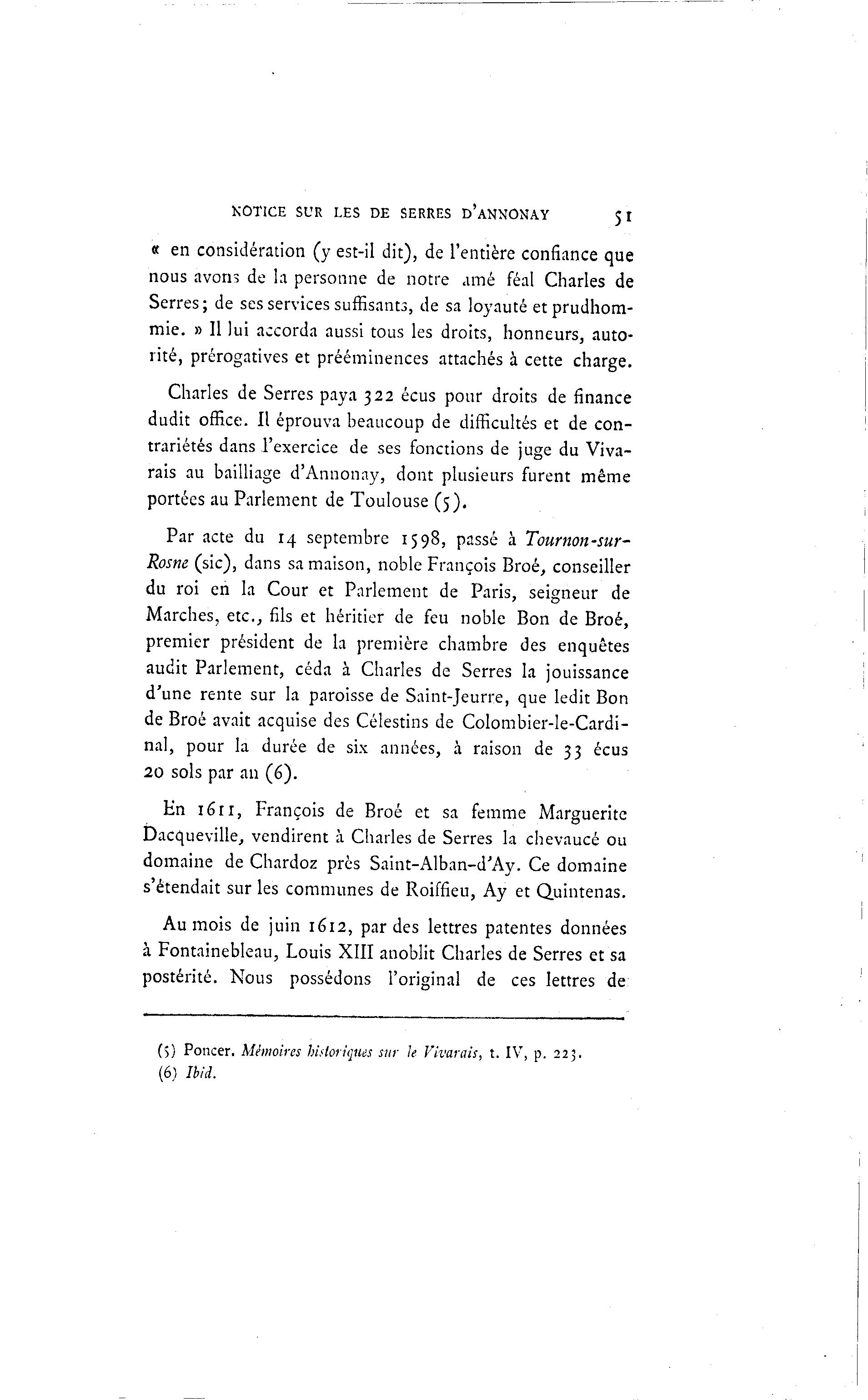 NOTICE SUR LES DE SERRES D ' A N N O N A Y 51 c en considération (y est-il dit), de l'entière confiance que e nous avons de la personne de notre amé féal Charles de Serres; de ses services suffisants, de sa loyauté etprudhom- mie. » Il lui accorda aussi tous les droits, honneurs, auto- rité, prérogatives et prééminences attachés à cette charge. Charles de Serres paya 322 écus pour droits de finance dudit office. Il éprouva beaucoup de difficultés et de con- trariétés dans l'exercice de ses fonctions de juge du Viva- rais au bailliage d'Annonay, dont plusieurs furent même portées au Parlement de Toulouse (5). Par acte du 14 septembre 1598, passé à Tournon-sur- Rosne (sic), dans sa maison, noble François Broé, conseiller du roi en la Cour et Parlement de Paris, seigneur de Marches, etc., fils et héritier de feu noble Bon de Broé, premier président de la première chambre des enquêtes audit Parlement, céda à Charles de Serres la jouissance d'une rente sur la paroisse de Saint-Jeurre, que ledit Bon de Broé avait acquise des Célestins de Colombier-le-Cardi- nal, pour la durée de six années, à raison de 33 écus 20 sols par an (6). En 1611, François de Broé et sa femme Marguerite Dacqueville, vendirent à Charles de Serres la chevaucé ou domaine de Chardoz près Saint-Alban-d'Ay. Ce domaine s'étendait sur les communes de Roiffieu, Ay et Quintenas. Au mois de juin 1612, par des lettres patentes données à Fontainebleau, Louis XIII anoblit Charles de Serres et sa postérité. Nous possédons l'original de ces lettres de (>) Poncer. Mémoires historiques sur le Vivarais, t. IV, p. 223. (6) Ibid.