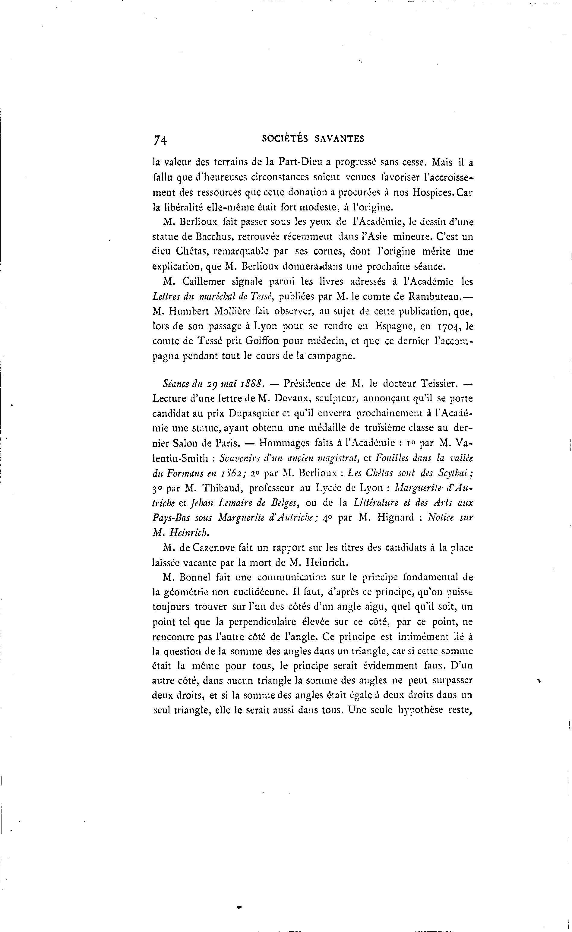 74 SOCIETES SAVANTES la valeur des terrains de la Part-Dieu a progressé sans cesse. Mais il a fallu que d'heureuses circonstances soient venues favoriser l'accroisse- ment des ressources que cette donation a procurées à nos Hospices. Car la libéralité elle-même était fort modeste, à l'origine. M. Berlioux fait passer sous les yeux de l'Académie, le dessin d'une statue de Bacchus, retrouvée récemmeut dans l'Asie mineure. C'est un dieu Chétas, remarquable par ses cornes, dont l'origine mérite une explication, que M. Berlioux donnera