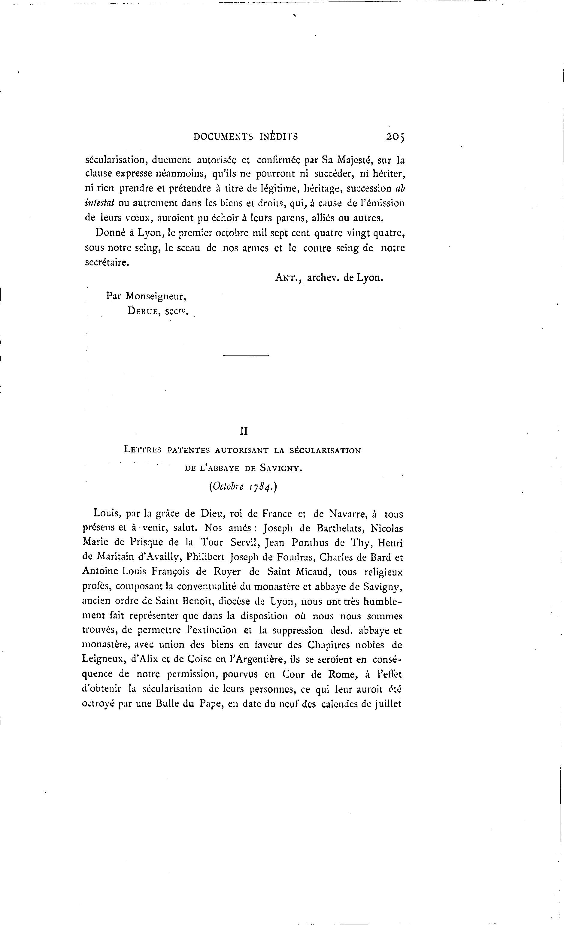 DOCUMENTS INEDITS 20) sécularisation, duement autorisée et confirmée par Sa Majesté, sur la clause expresse néanmoins, qu'ils ne pourront ni succéder, ni hériter, ni rien prendre et prétendre à titre de légitime, héritage, succession ai intestat ou autrement dans les biens et droits, qui, à cause de l'émission de leurs vœux, auroient pu échoir à leurs parens, alliés ou autres. Donné à Lyon, le premier octobre mil sept cent quatre vingt quatre, sous notre seing, le sceau de nos armes et le contre seing de notre secrétaire. ANT., archev. de Lyon. Par Monseigneur, DERUE, secre. II LETTRES PATENTES AUTORISANT LA SÉCULARISATION DE L'ABBAYE DE SAVIGNY. (Octobre 1784.) Louis, par la grâce de Dieu, roi de France et de Navarre, à tous présens et à venir, salut. Nos amés : Joseph de Barthelats, Nicolas Marie de Prisque de la Tour Servil, Jean Pomhus de Thy, Henri de Maritain d'Availly, Philibert Joseph de Foudras, Charles de Bard et Antoine Louis François de Royer de Saint Micaud, tous religieux profès, composant la conventualité du monastère et abbaye de Savigny, ancien ordre de Saint Benoit, diocèse de Lyon, nous ont très humble- ment fait représenter que dans la disposition où nous nous sommes trouvés, de permettre l'extinction et la suppression desd. abbaye et monastère, avec union des biens en faveur des Chapitres nobles de Leigneux, d'Alix et de Coise en l'Argentière, ils se seroient en consé- quence de notre permission, pourvus en Cour de Rome, à l'effet d'obtenir la sécularisation de leurs personnes, ce qui leur auroit été octroyé par une Bulle du Pape, en date du neuf des calendes de juillet