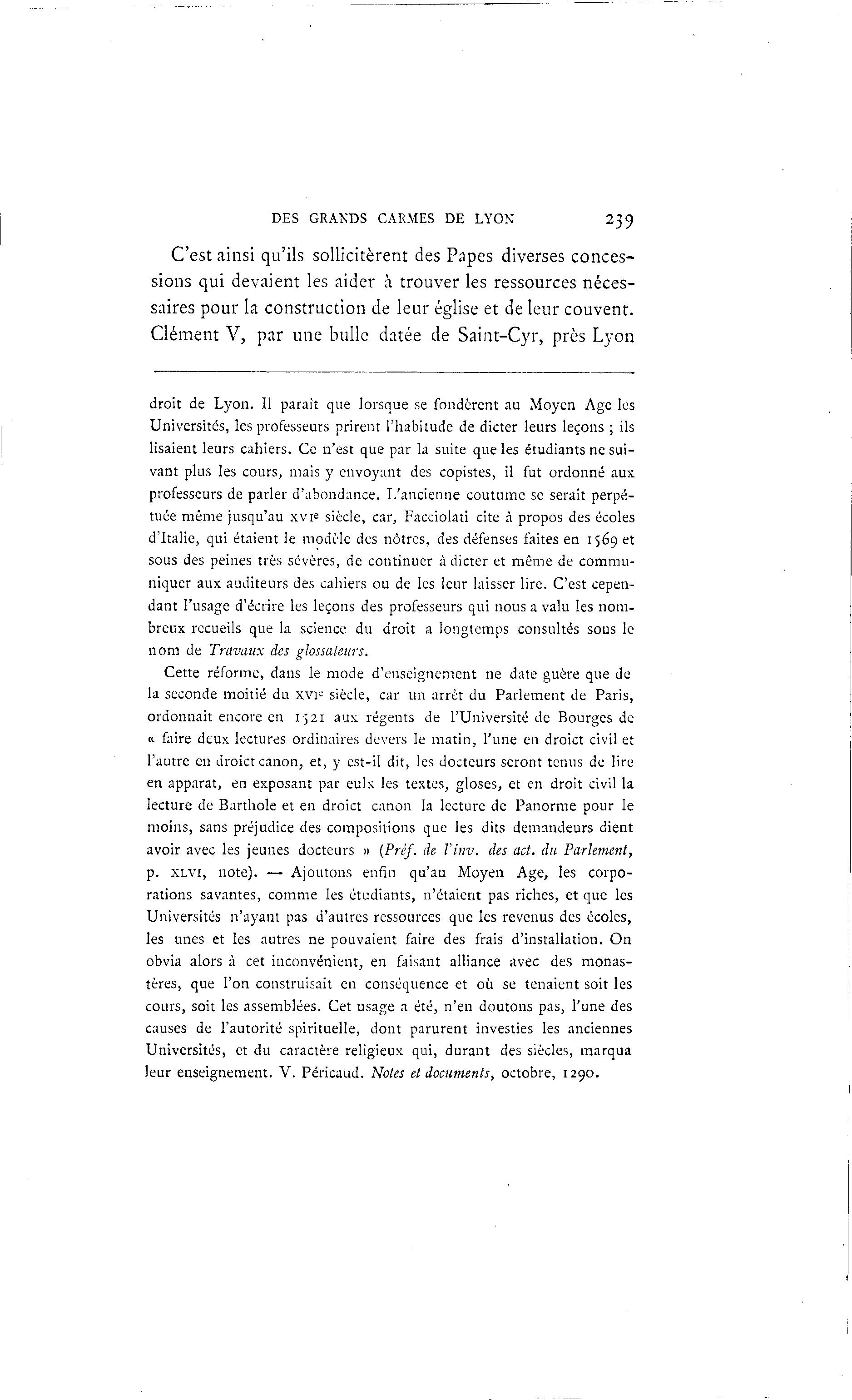 DES GRANDS CARMES DE LYON 239 C'est ainsi qu'ils sollicitèrent des Papes diverses conces- sions qui devaient les aider à trouver les ressources néces- saires pour la construction de leur église et de leur couvent. Clément V, par une bulle datée de Saint-Cyr, près Lyon droit de Lyon. Il parait que lorsque se fondèrent au Moyen Age les Universités, les professeurs prirent l'habitude de dicter leurs leçons ; ils lisaient leurs cahiers. Ce n'est que par la suite que les étudiants ne sui- vant plus les cours, mais y envoyant des copistes, il fut ordonné aux professeurs de parler d'abondance. L'ancienne coutume se serait perpé- tuée même jusqu'au xvi e siècle, car, Facciolati cite à propos des écoles d'Italie, qui étaient le modèle des nôtres, des défenses faites en 1569 et sous des peines très sévères, de continuer à dicter et même de commu- niquer aux auditeurs des cahiers ou de les leur laisser lire. C'est cepen- dant l'usage d'écrire les leçons des professeurs qui nous a valu les nom- breux recueils que la science du droit a longtemps consultés sous le nom de Travaux des glossaleurs. Cette réforme, dans le mode d'enseignement ne date guère que de la seconde moitié du XVIe siècle, car un arrêt du Parlement de Paris, ordonnait encore en 15 21 aux régents de l'Université de Bourges de » faire deux lectures ordinaires devers le matin, l'une en droict civil et l'autre en droict canon, et, y cst-il dit, les docteurs seront tenus de lire en apparat, en exposant par eulx les textes, gloses, et en droit civil la lecture de Barthole et en droict canon la lecture de Panorme pour le moins, sans préjudice des compositions que les dits demandeurs dient avoir avec les jeunes docteurs » (Préf. de l'itw. des act. du Parlement, p. XLVI, note). — Ajoutons enfin qu'au Moyen Age, les corpo- rations savantes, comme les étudiants, n'étaient pas riches, et que les Universités n'ayant pas d'autres ressources que les revenus des écoles, les unes et les autres ne pouvaient faire des frais d'installation. On obvia alors à cet inconvénient, en faisant alliance avec des monas- tères, que l'on construisait en conséquence et où se tenaient soit les cours, soit les assemblées. Cet usage a été, n'en doutons pas, l'une des causes de l'autorité spirituelle, dont parurent investies les anciennes Universités, et du caractère religieux qui, durant des siècles, marqua leur enseignement. V. Péricaud. Notes et documents, octobre, 1290.