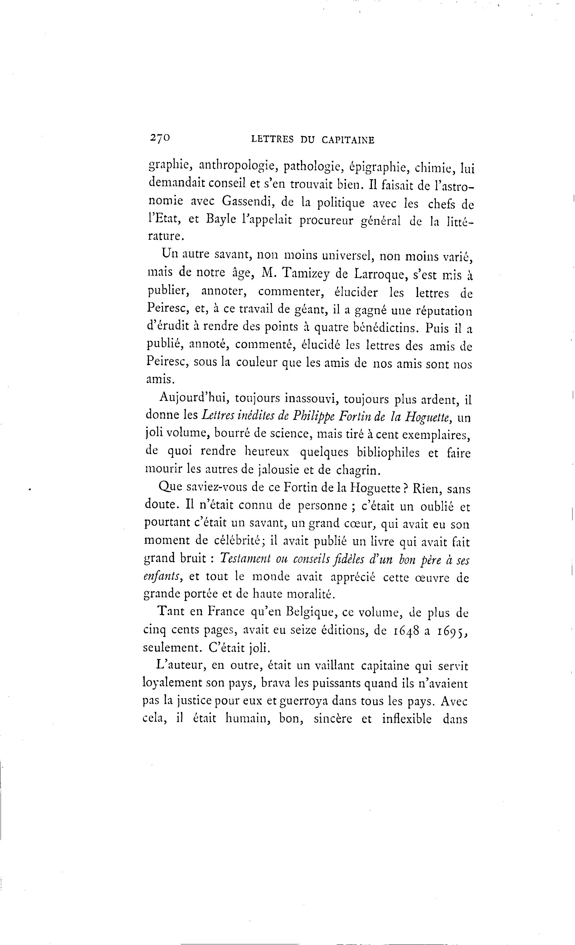 2JO LETTRES DU CAPITAINE graphie, anthropologie, pathologie, épigraphie, chimie, lui demandait conseil et s'en trouvait bien. Il faisait de l'astro- nomie avec Gassendi, de la politique avec les chefs de l'Etat, et Bayle l'appelait procureur général de la litté- rature. Un autre savant, non moins universel, non moins varié, mais de notre âge, M. Tamizey de Larroque, s'est mis à publier, annoter, commenter, élucider les lettres de Peiresc, et, à ce travail de géant, il a gagné une réputation d'érudit à rendre des points a quatre bénédictins. Puis il a publié, annoté, commenté, élucidé les lettres des amis de Peiresc, sous la couleur que les amis de nos amis sont nos amis. Aujourd'hui, toujours inassouvi, toujours plus ardent, il donne les Lettres inédites de Philippe Fortin de la Hoguette, un joli volume, bourré de science, mais tiré à cent exemplaires, de quoi rendre heureux quelques bibliophiles et faire mourir les autres de jalousie et de chagrin. Que saviez-vous de ce Fortin de la Hoguette ? Rien, sans doute. Il n'était connu de personne ; c'était un oublié et pourtant c'était un savant, un grand cœur, qui avait eu son moment de célébrité; il avait publié un livre qui avait fait grand bruit : Testament ou conseilsfidèlesd'un bon père à ses enfants, et tout le monde avait apprécié cette œuvre de grande portée et de haute moralité. Tant en France qu'en Belgique, ce volume, de plus de cinq cents pages, avait eu seize éditions, de 1648 a 1695, seulement. C'était joli. L'auteur, en outre, était un vaillant capitaine qui servit loyalement son pays, brava les puissants quand ils n'avaient pas la justice pour eux et guerroya dans tous les pays. Avec cela, il était humain, bon, sincère et inflexible dans