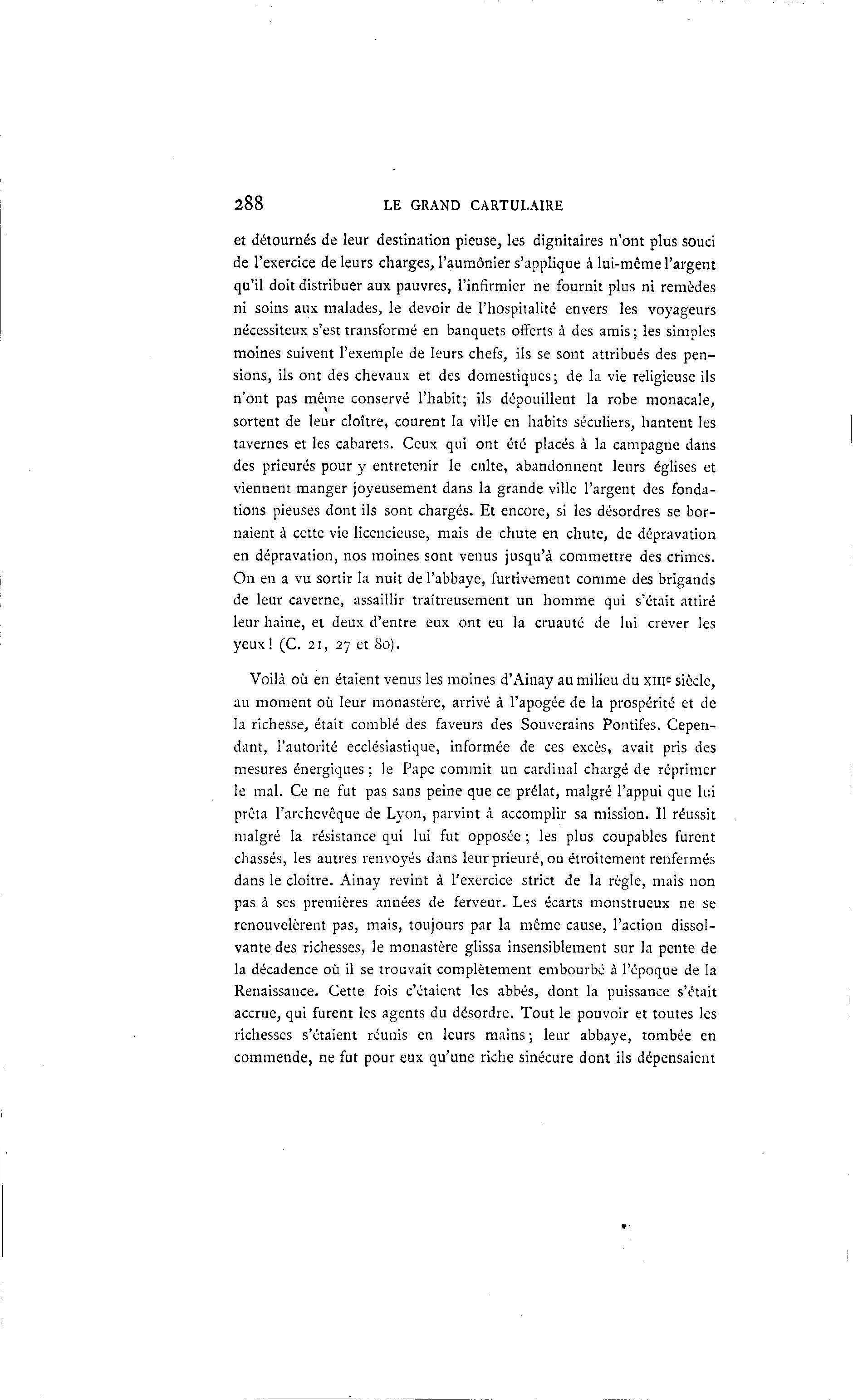 288 LE GRAND CARTUI.AIRE et détournés de leur destination pieuse, les dignitaires n'ont plus souci de l'exercice de leurs charges, l'aumônier s'applique à lui-même l'argent qu'il doit distribuer aux pauvres, l'infirmier ne fournit plus ni remèdes ni soins aux malades, le devoir de l'hospitalité envers les voyageurs nécessiteux s'est transformé en banquets offerts à des amis ; les simples moines suivent l'exemple de leurs chefs, ils se sont attribués des pen- sions, ils ont des chevaux et des domestiques; de la vie religieuse ils n'ont pas même conservé l'habit; ils dépouillent la robe monacale, sortent de leur cloître, courent la ville en habits séculiers, hantent les tavernes et les cabarets. Ceux qui ont été placés à la campagne dans des prieurés pour y entretenir le culte, abandonnent leurs églises et viennent manger joyeusement dans la grande ville l'argent des fonda- tions pieuses dont ils sont chargés. Et encore, si les désordres se bor- naient à cette vie licencieuse, mais de chute en chute, de dépravation en dépravation, nos moines sont venus jusqu'à commettre des crimes. On en a vu sortir la nuit de l'abbaye, furtivement comme des brigands de leur caverne, assaillir traîtreusement un homme qui s'était attiré leur haine, et deux d'entre eux ont eu la cruauté de lui crever les yeux ! (C. 21, 27 et 80). Voilà où en étaient venus les moines d'Ainay au milieu du xm e siècle, au moment où leur monastère, arrivé à l'apogée de la prospérité et de la richesse, était comblé des faveurs des Souverains Pontifes. Cepen- dant, l'autorité ecclésiastique, informée de ces excès, avait pris des mesures énergiques ; le Pape commit un cardinal chargé de réprimer le mal. Ce ne fut pas sans peine que ce prélat, malgré l'appui que lui prêta l'archevêque de Lyon, parvint à accomplir sa mission. Il réussit malgré la résistance qui lui fut opposée ; les plus coupables furent chassés, les autres renvoyés dans leur prieuré, ou étroitement renfermés dans le cloître. Ainay revint à l'exercice strict de la règle, mais non pas à ses premières années de ferveur. Les écarts monstrueux ne se renouvelèrent pas, mais, toujours par la même cause, l'action dissol- vante des richesses, le monastère glissa insensiblement sur la pente de la décadence où il se trouvait complètement embourbé à l'époque de la Renaissance. Cette fois c'étaient les abbés, dont la puissance s'était accrue, qui furent les agents du désordre. Tout le pouvoir et toutes les richesses s'étaient réunis en leurs mains ; leur abbaye, tombée en commende, ne fut pour eux qu'une riche sinécure dont ils dépensaient