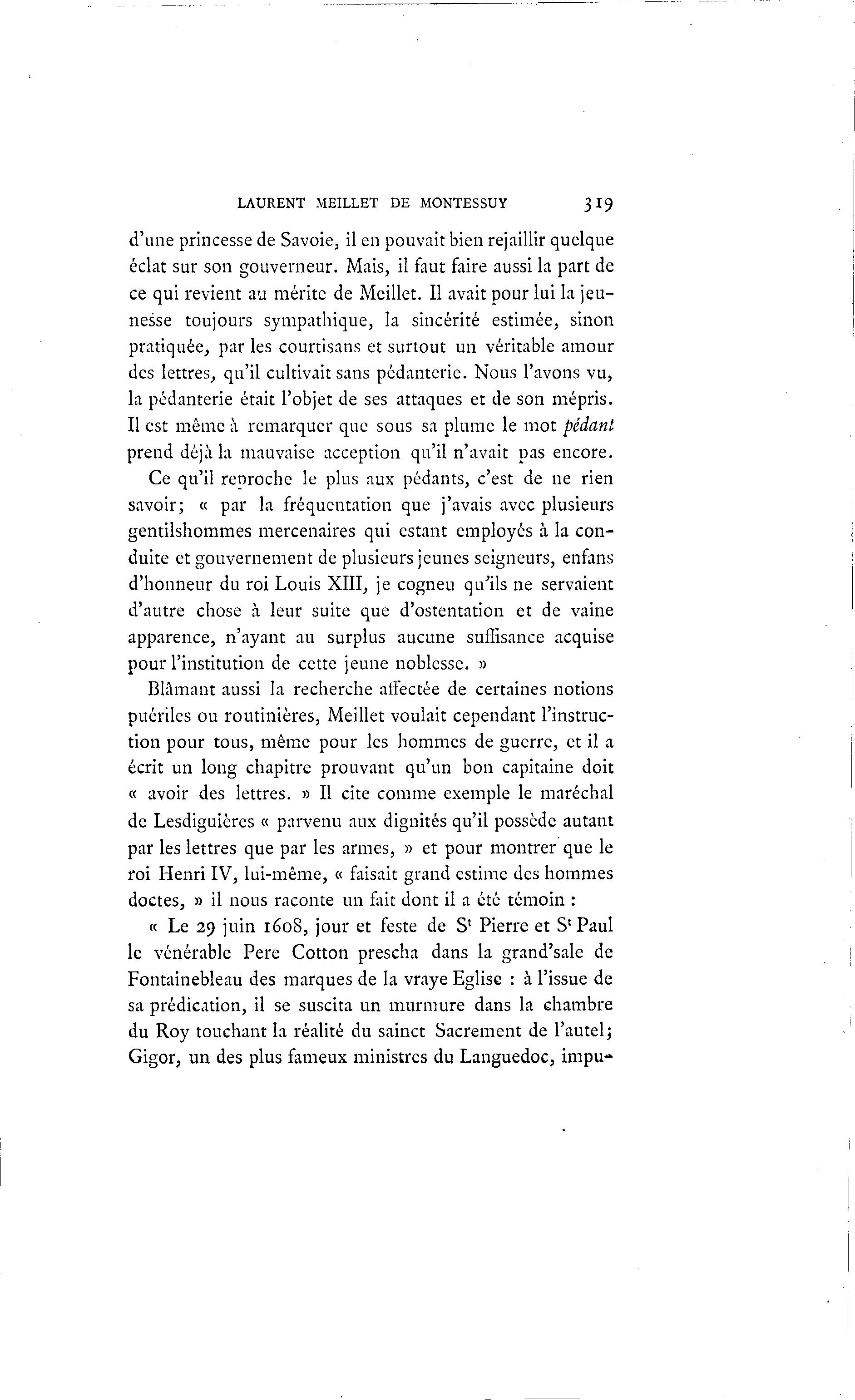 LAURENT MEILLET DE MONTESSUY 319 d'une princesse de Savoie, il en pouvait bien rejaillir quelque éclat sur son gouverneur. Mais, il faut faire aussi la part de ce qui revient au mérite de Meillet. Il avait pour lui la jeu- nesse toujours sympathique, la sincérité estimée, sinon pratiquée, par les courtisans et surtout un véritable amour des lettres, qu'il cultivait sans pédanterie. Nous l'avons vu, la pédanterie était l'objet de ses attaques et de son mépris. Il est même à remarquer que sous sa plume le mot pédant prend déjà la mauvaise acception qu'il n'avait pas encore. Ce qu'il renroche le plus aux pédants, c'est de ne rien savoir; « par la fréquentation que j'avais avec plusieurs gentilshommes mercenaires qui estant employés à la con- duite et gouvernement de plusieurs jeunes seigneurs, enfans d'honneur du roi Louis XIII, je cogneu qu'ils ne servaient d'autre chose à leur suite que d'ostentation et de vaine apparence, n'ayant au surplus aucune suffisance acquise pour l'institution de cette jeune noblesse. » Blâmant aussi la recherche affectée de certaines notions puériles ou routinières, Meillet voulait cependant l'instruc- tion pour tous, même pour les hommes de guerre, et il a écrit un long chapitre prouvant qu'un bon capitaine doit « avoir des lettres. » Il cite comme exemple le maréchal de Lesdiguières « parvenu aux dignités qu'il possède autant par les lettres que par les armes, » et pour montrer que le roi Henri IV, lui-même, « faisait grand estime des hommes doctes, » il nous raconte un fait dont il a été témoin : « Le 29 juin 1608, jour et feste de S1 Pierre et S'Paul le vénérable Père Cotton prescha dans la grand'sale de Fontainebleau des marques de la vraye Eglise : à l'issue de sa prédication, il se suscita un murmure dans la chambre du Roy touchant la réalité du sainct Sacrement de l'autel; Gigor, un des plus fameux ministres du Languedoc, impu-