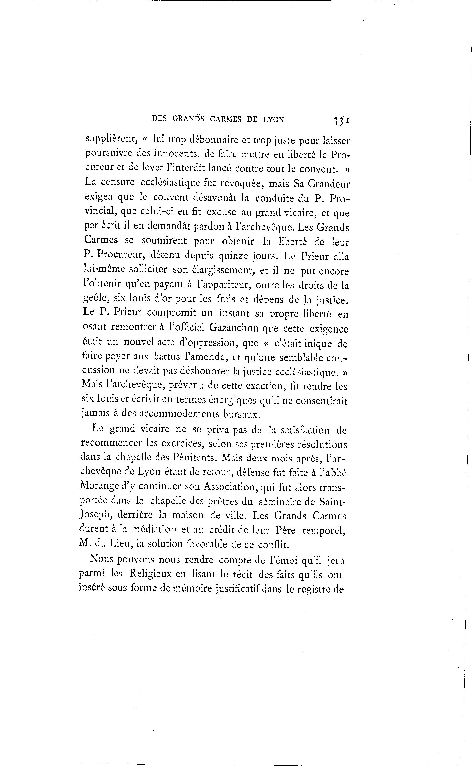 DES GRANDS CARMES DE LYON 33 I supplièrent, « lui trop débonnaire et trop juste pour laisser poursuivre des innocents, de faire mettre en liberté le Pro- cureur et de lever l'interdit lancé contre tout le couvent. » La censure ecclésiastique fut révoquée, mais Sa Grandeur exigea que le couvent désavouât la conduite du P. Pro- vincial, que celui-ci en fit excuse au grand vicaire, et que par écrit il en demandât pardon à l'archevêque. Les Grands Carmes se soumirent pour obtenir la liberté de leur P. Procureur, détenu depuis quinze jours. Le Prieur alla lui-même solliciter son élargissement, et il ne put encore l'obtenir qu'en payant à l'appariteur, outre les droits de la geôle, six louis d'or pour les frais et dépens de Ja justice. Le P. Prieur compromit un instant sa propre liberté en osant remontrer à l'official Gazanchon que cette exigence était un nouvel acte d'oppression, que « c'était inique de faire payer aux battus l'amende, et qu'une semblable con- cussion ne devait pas déshonorer la justice ecclésiastique. » Mais l'archevêque, prévenu de cette exaction, fit rendre les six louis et écrivit en termes énergiques qu'il ne consentirait jamais à des accommodements bursaux. Le grand vicaire ne se priva pas de la satisfaction de recommencer les exercices, selon ses premières résolutions dans la chapelle des Pénitents. Mais deux mois après, l'ar- chevêque de Lyon étant de retour, défense fat faite à l'abbé Moranged'3' continuer son Association, qui fut alors trans- portée dans la chapelle des prêtres du séminaire de Saint- Joseph, derrière la maison de ville. Les Grands Carmes durent à la médiation et au crédit de leur Père temporel, M. du Lieu, la solution favorable de ce conflit. Nous pouvons nous rendre compte de l'émoi qu'il jeta parmi les Religieux en lisant le récit des faits qu'ils ont inséré sous forme de mémoire justificatif dans le registre de