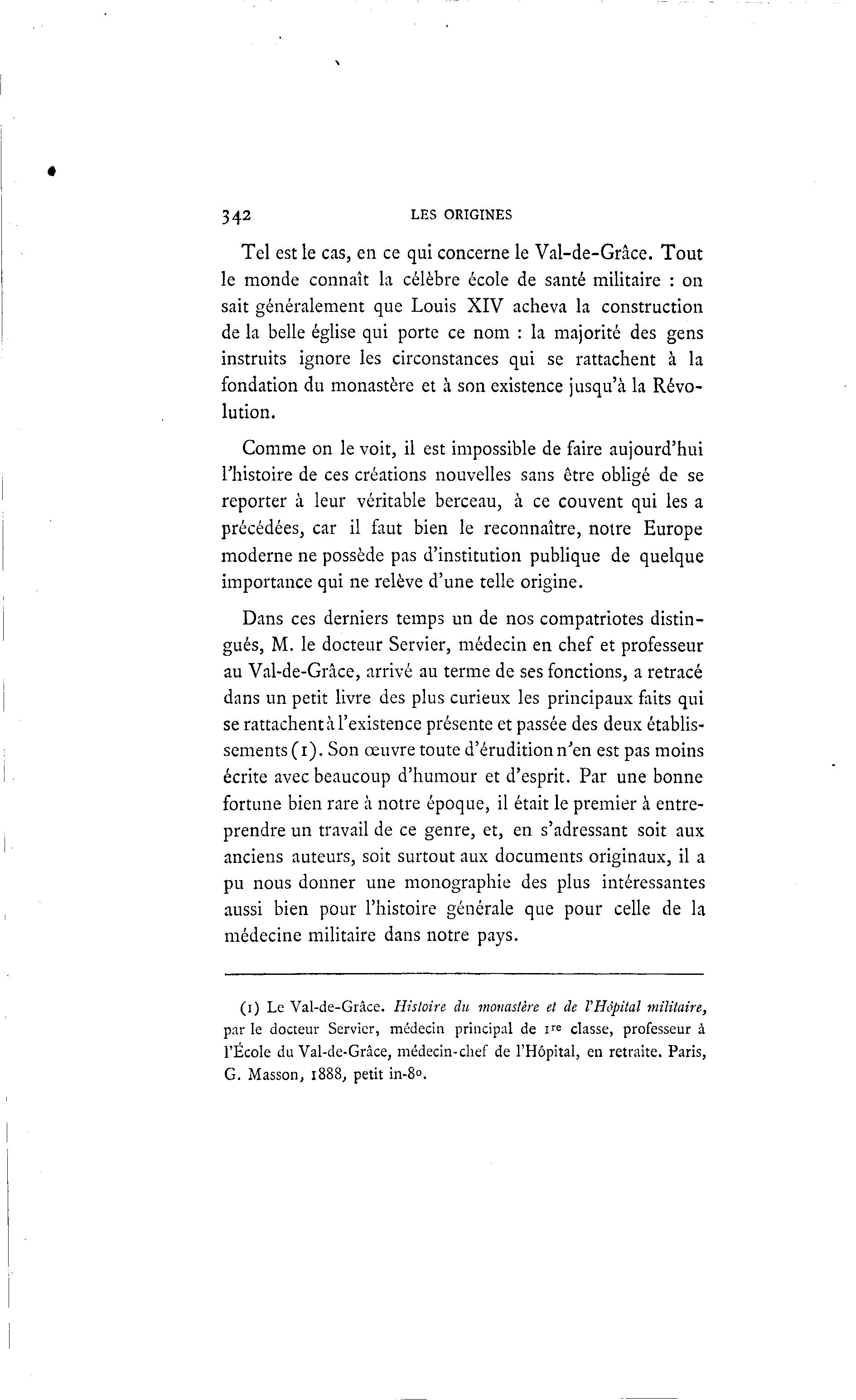 342 LES ORIGINES Tel est le cas, en ce qui concerne le Val-de-Grâce. Tout le monde connaît la célèbre école de santé militaire : on sait généralement que Louis XIV acheva la construction de la belle église qui porte ce nom : la majorité des gens instruits ignore les circonstances qui se rattachent à la fondation du monastère et à son existence jusqu'à la Révo- lution. Comme on le voit, il est impossible de faire aujourd'hui l'histoire de ces créations nouvelles sans être obligé de se reporter à leur véritable berceau, à ce couvent qui les a précédées, car il faut bien le reconnaître, notre Europe moderne ne possède pas d'institution publique de quelque importance qui ne relève d'une telle origine. Dans ces derniers temps un de nos compatriotes distin- gués, M. le docteur Servier, médecin en chef et professeur au Val-de-Grâce, arrivé au terme de ses fonctions, a retracé dans un petit livre des plus curieux les principaux faits qui se rattachent à l'existence présente et passée des deux établis- sements ( i ) . Son œuvre toute d'érudition n'en est pas moins écrite avec beaucoup d'humour et d'esprit. Par une bonne fortune bien rare à notre époque, il était le premier à entre- prendre un travail de ce genre, et, en s'adressant soit aux anciens auteurs, soit surtout aux documents originaux, il a pu nous donner une monographie des plus intéressantes aussi bien pour l'histoire générale que pour celle de la médecine militaire dans notre pays. (i) Le Val-de-Grâce. Histoire du monastère et de VHôpital militaire, par le docteur Servier, médecin principal de i re classe, professeur à l'École du Val-de-Grâce, médecin-chef de l'Hôpital, en retraite. Paris, G. Masson, 1888, petit in-8°.