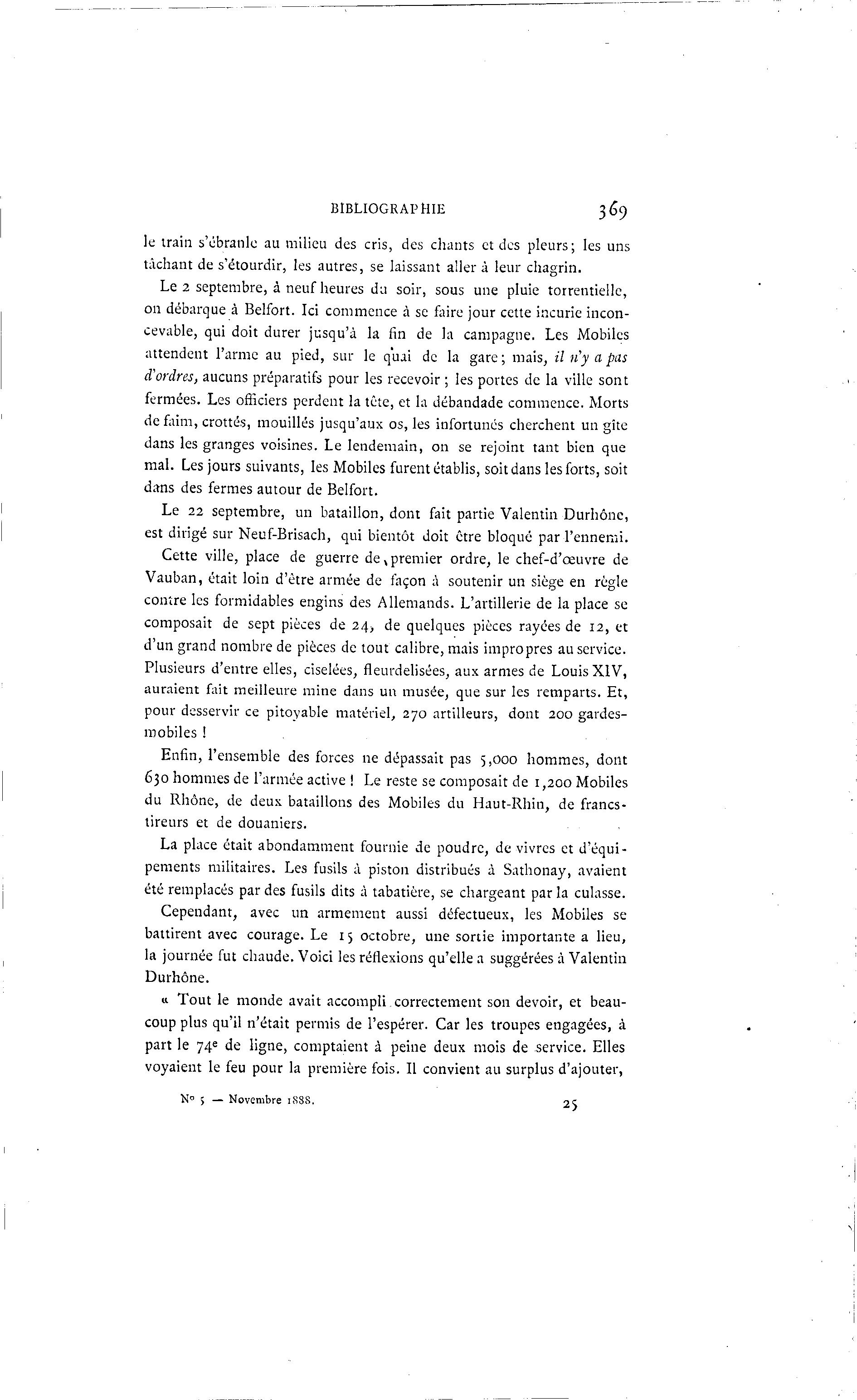 BIBLIOGRAPHIE 369 le train s'ébranle au milieu des cris, des chants et des pleurs; les uns tâchant de s'étourdir, les autres, se laissant aller à leur chagrin. Le 2 septembre, à neuf heures du soir, sous une pluie torrentielle, on débarque à Belfort. Ici commence à se faire jour cette incurie incon- cevable, qui doit durer jusqu'à la fin de la campagne. Les Mobiles attendent l'arme au pied, sur le quai de la gare; mais, il n'y a pas d'ordres, aucuns préparatifs pour les recevoir ; les portes de la ville sont fermées. Les officiers perdent la tête, et la débandade commence. Morts de faim, crottés, mouillés jusqu'aux os, les infortunés cherchent un gîte dans les granges voisines. Le lendemain, on se rejoint tant bien que mal. Les jours suivants, les Mobiles furent établis, soit dans les forts, soit dans des fermes autour de Belfort. Le 22 septembre, un bataillon, dont fait partie Valentin Durhône, est dirigé sur Neuf-Brisach, qui bientôt doit être bloqué par l'ennemi. Cette ville, place de guerre de ( premier ordre, le chef-d'œuvre de Vauban, était loin d'être armée de façon à soutenir un siège en règle contre les formidables engins des Allemands. L'artillerie de la place se composait de sept pièces de 24, de quelques pièces rayées de 12, et d'un grand nombre de pièces de tout calibre, mais impropres au service. Plusieurs d'entre elles, ciselées, fleurdelisées, aux armes de Louis XIV, auraient fait meilleure mine dans un musée, que sur les remparts. Et, pour desservir ce pitoyable matériel, 270 artilleurs, dont 200 gardes- mobiles ! Enfin, l'ensemble des forces ne dépassait pas 5,000 hommes, dont 630 hommes de l'armée active ! Le reste se composait de 1,200 Mobiles du Rhône, de deux bataillons des Mobiles du Haut-Rhin, de francs- tireurs et de douaniers. La place était abondamment fournie de poudre, de vivres et d'équi- pements militaires. Les fusils à piston distribués à Sathonay, avaient été remplacés par des fusils dits à tabatière, se chargeant par la culasse. Cependant, avec un armement aussi défectueux, les Mobiles se battirent avec courage. Le 15 octobre, une sortie importante a lieu, la journée fut chaude. Voici les réflexions qu'elle a suggérées à Valentin Durhône. « Tout le monde avait accompli. correctement son devoir, et beau- coup plus qu'il n'était permis de l'espérer. Car les troupes engagées, à part le 74 e de ligne, comptaient à peine deux mois de service. Elles voyaient le feu pour la première fois. Il convient au surplus d'ajouter, N° 5 — Novembre iSSS. 25