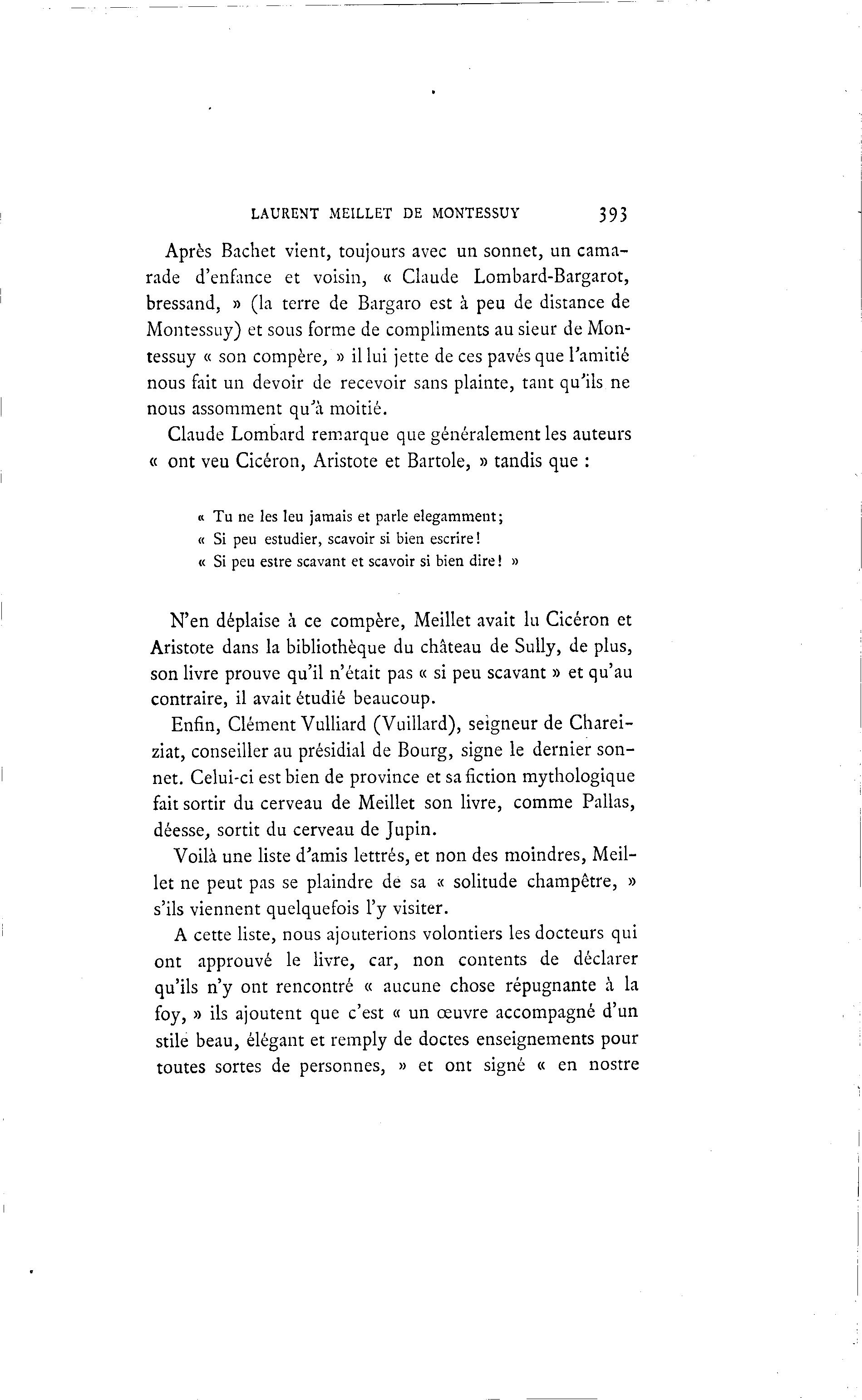 LAURENT MEILLET DE MONTESSUY 393 Après Bachet vient, toujours avec un sonnet, un cama- rade d'enfance et voisin, « Claude Lombard-Bargarot, bressand, » (la terre de Bargaro est à peu de distance de Montessuy) et sous forme de compliments au sieur de Mon- tessuy « son compère, » il lui jette de ces pavés que l'amitié nous fait un devoir de recevoir sans plainte, tant qu'ils ne nous assomment qu'à moitié. Claude Lombard remarque que généralement les auteurs « ont veu Cicéron, Aristote et Bartole, » tandis que : « Tu ne les leu jamais et parle élégamment; « Si peu estudier, scavoir si bien escrire ! « Si peu estre scavant et scavoir si bien dire ! » N'en déplaise à ce compère, Meillet avait lu Cicéron et Aristote dans la bibliothèque du château de Sully, de plus, son livre prouve qu'il n'était pas « si peu scavant » et qu'au contraire, il avait étudié beaucoup. Enfin, Clément Vulliard (Vuillard), seigneur de Charei- ziat, conseiller au présidial de Bourg, signe le dernier son- net. Celui-ci est bien de province et sa fiction mythologique fait sortir du cerveau de Meillet son livre, comme Pallas, déesse, sortit du cerveau de Jupin. Voilà une liste d'amis lettrés, et non des moindres, Meil- let ne peut pas se plaindre de sa ; solitude champêtre, » < s'ils viennent quelquefois l'y visiter. A cette liste, nous ajouterions volontiers les docteurs qui ont approuvé le livre, car, non contents de déclarer qu'ils n'y ont rencontré « aucune chose répugnante à la foy, » ils ajoutent que c'est « un œuvre accompagné d'un stile beau, élégant et remply de doctes enseignements pour toutes sortes de personnes, » et ont signé « en nostre
