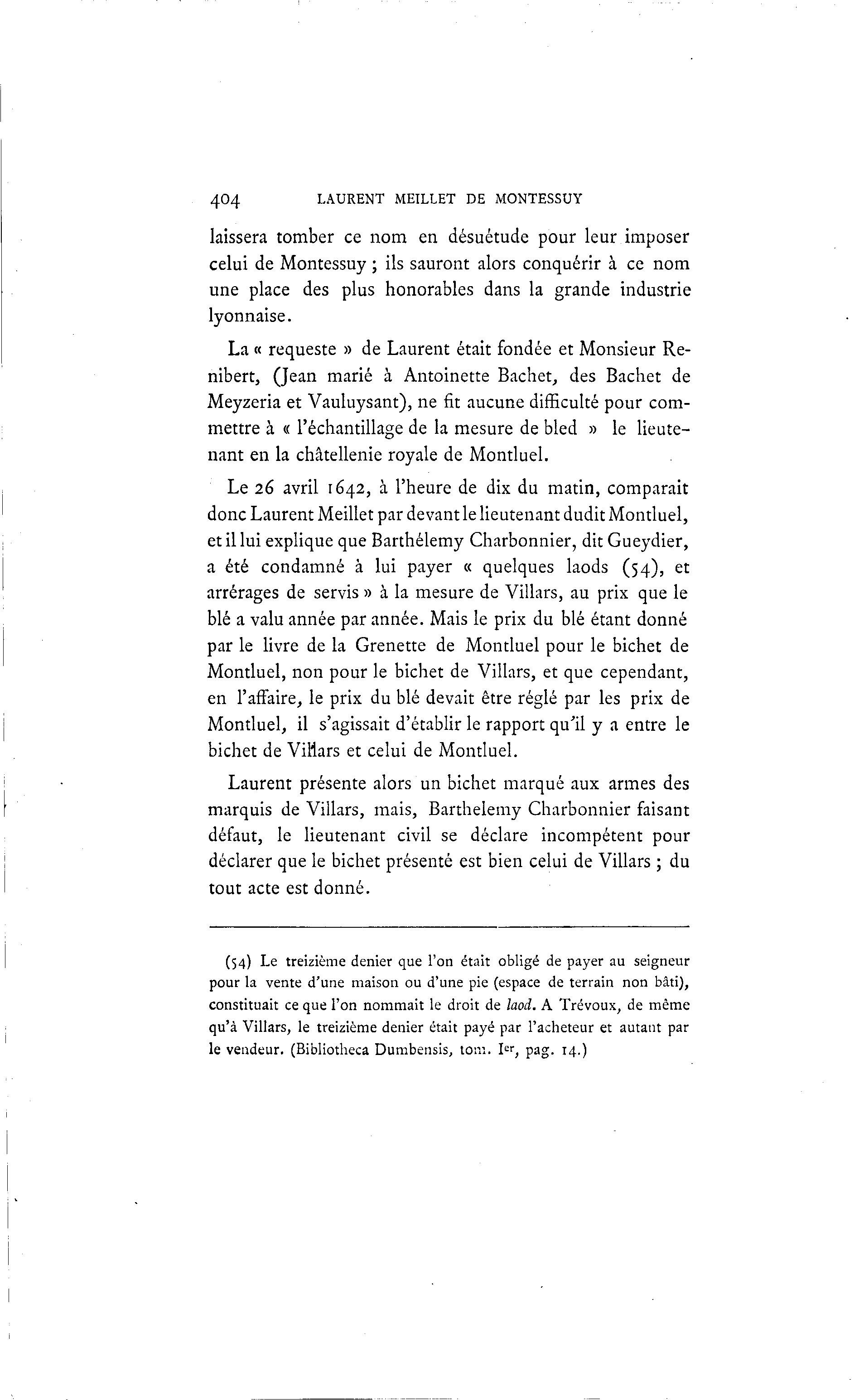 404 LAURENT MEILLET DE MONTESSUY laissera tomber ce nom en désuétude pour leur imposer celui de Montessuy ; ils sauront alors conquérir à ce nom une place des plus honorables dans la grande industrie lyonnaise. La « requeste » de Laurent était fondée et Monsieur Re- nibert, (Jean marié à Antoinette Bachet, des Bachet de Meyzeria et Vauluysant), ne fit aucune difficulté pour com- mettre à « l'échantillage de la mesure de bled » le lieute- nant en la châtellenie royale de Montluel. Le 26 avril 1642, à l'heure de dix du matin, comparait donc Laurent Meillet par devant le lieutenant dudit Montluel, et il lui explique que Barthélémy Charbonnier, dit Gueydier, a été condamné à lui payer « quelques laods (54), et arrérages de servis » à la mesure de Villars, au prix que le blé a valu année par année. Mais le prix du blé étant donné par le livre de la Grenette de Montluel pour le bichet de Montluel, non pour le bichet de Villars, et que cependant, en l'affaire, le prix du blé devait être réglé par les prix de Montluel, il s'agissait d'établir le rapport qu'il y a entre le bichet de Villars et celui de Montluel. Laurent présente alors un bichet marqué aux armes des marquis de Villars, mais, Barthélémy Charbonnier faisant défaut, le lieutenant civil se déclare incompétent pour déclarer que le bichet présenté est bien celui de Villars ; du tout acte est donné. (54) Le treizième denier que l'on était obligé de payer au seigneur pour la vente d'une maison ou d'une pie (espace de terrain non bâti), constituait ce que l'on nommait le droit de laoi. A Trévoux, de même qu'à Villars, le treizième denier était payé par l'acheteur et autant par le vendeur. (Bibliotheca Dumbensis, ton:. I e r , pag. 14.)