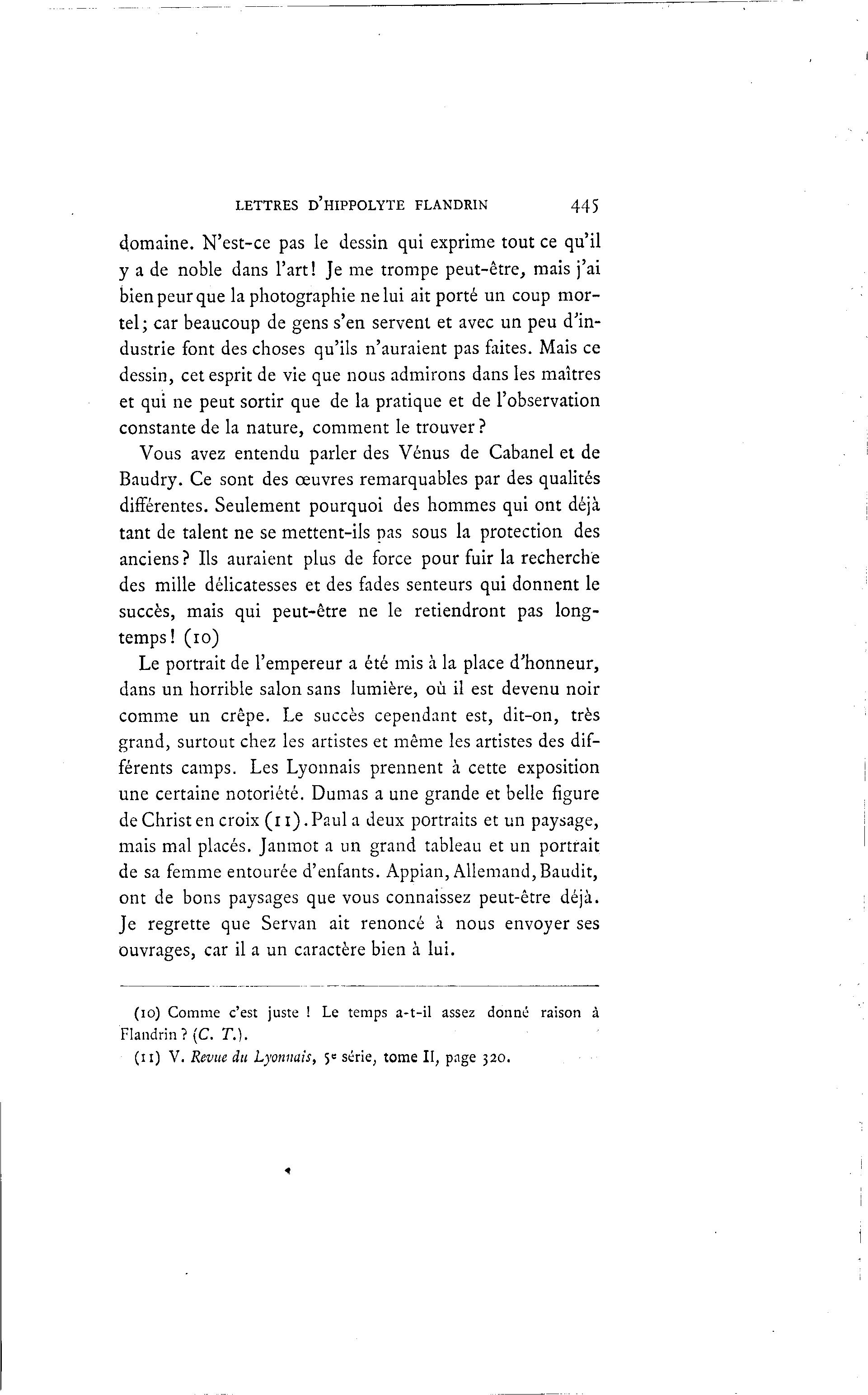 LETTRES D'HIPPOLYTE FLANDRIN 445 domaine. N'est-ce pas le dessin qui exprime tout ce qu'il y a de noble dans l'art! Je me trompe peut-être, mais j'ai bien peur que la photographie ne lui ait porté un coup mor- tel; car beaucoup de gens s'en servent et avec un peu d'in- dustrie font des choses qu'ils n'auraient pas faites. Mais ce dessin, cet esprit de vie que nous admirons dans les maîtres et qui ne peut sortir que de la pratique et de l'observation constante de la nature, comment le trouver ? Vous avez entendu parler des Vénus de Cabanel et de Baudry. Ce sont des œuvres remarquables par des qualités différentes. Seulement pourquoi des hommes qui ont déjà tant de talent ne se mettent-ils pas sous la protection des anciens ? Ils auraient plus de force pour fuir la recherche des mille délicatesses et des fades senteurs qui donnent le succès, mais qui peut-être ne le retiendront pas long- temps! (10) Le portrait de l'empereur a été mis à la place d'honneur, dans un horrible salon sans lumière, où il est devenu noir comme un crêpe. Le succès cependant est, dit-on, très grand, surtout chez les artistes et même les artistes des dif- férents camps. Les Lyonnais prennent à cette exposition une certaine notoriété. Dumas a une grande et belle figure de Christ en croix ( i i ) . Paul a deux portraits et un paysage, mais mal placés. Janmot a un grand tableau et un portrait de sa femme entourée d'enfants. Appian, Allemand,Baudit, ont de bons paysages que vous connaissez peut-être déjà . Je regrette que Servan ait renoncé à nous envoyer ses ouvrages, car il a un caractère bien à lui. (10) Comme c'est juste ! Le temps a-t-il assez donné raison à Flandrin ? (C. T.). ( i l ) V. Revue du Lyonnais, 5= série, tome II, page 320.