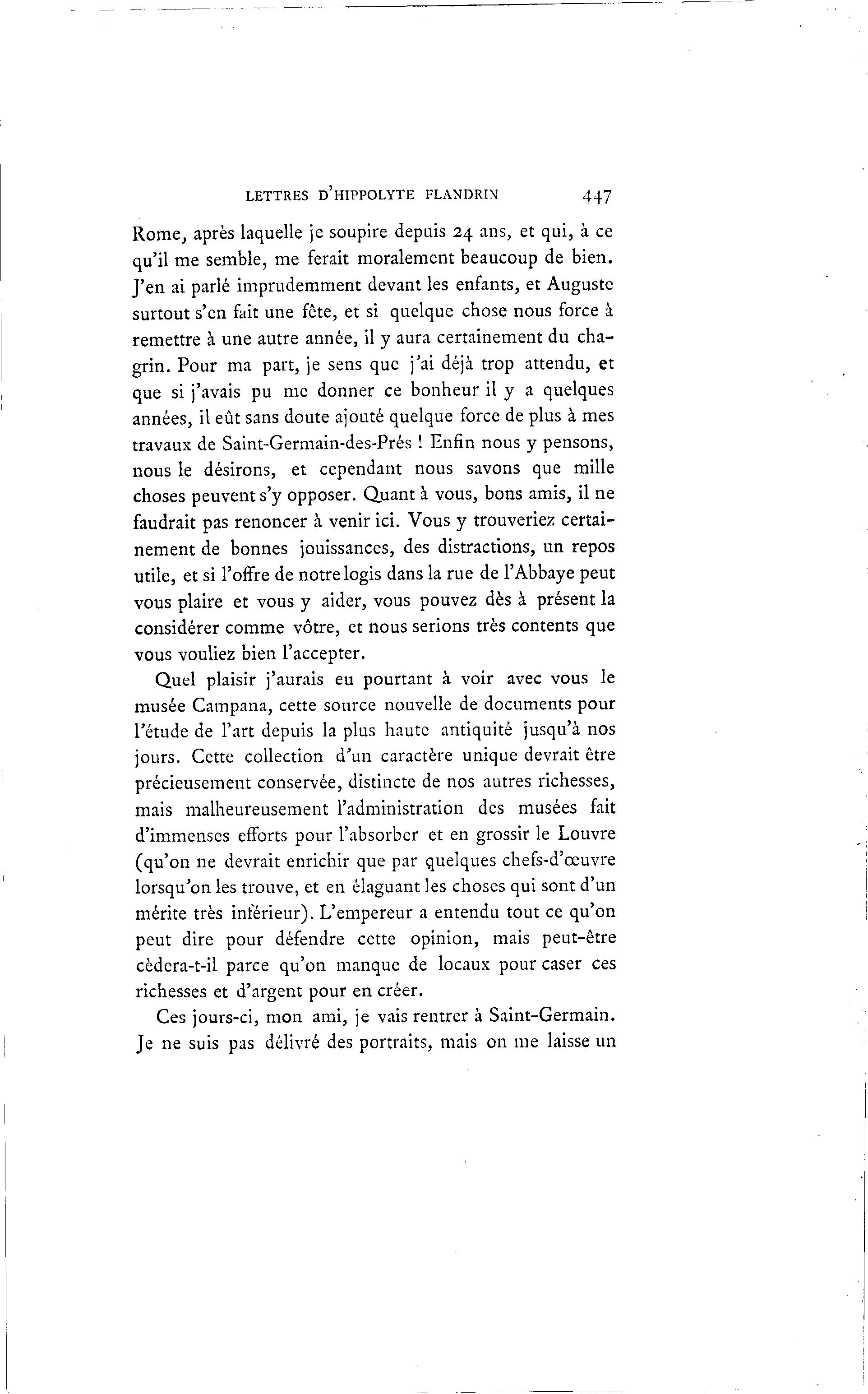 LETTRES D'HIPPOLYTE FLANDRIN 447 Rome, après laquelle je soupire depuis 24 ans, et qui, à ce qu'il me semble, me ferait moralement beaucoup de bien. J'en ai parlé imprudemment devant les enfants, et Auguste surtout s'en fait une fête, et si quelque chose nous force à remettre à une autre année, il y aura certainement du cha- grin. Pour ma part, je sens que j'ai déjà trop attendu, et que si j'avais pu me donner ce bonheur il y a quelques années, il eût sans doute ajouté quelque force de plus à mes travaux de Saint-Germain-des-Prés ! Enfin nous y pensons, nous le désirons, et cependant nous savons que mille choses peuvent s'y opposer. Quant à vous, bons amis, il ne faudrait pas renoncer à venir ici. Vous y trouveriez certai- nement de bonnes jouissances, des distractions, un repos utile, et si l'offre de notre logis dans la rue de l'Abbaye peut vous plaire et vous y aider, vous pouvez dès à présent la considérer comme vôtre, et nous serions très contents que vous vouliez bien l'accepter. Quel plaisir j'aurais eu pourtant à voir avec vous le musée Campana, cette source nouvelle de documents pour l'étude de l'art depuis la plus haute antiquité jusqu'à nos jours. Cette collection d'un caractère unique devrait être précieusement conservée, distincte de nos autres richesses, mais malheureusement l'administration des musées fait d'immenses efforts pour l'absorber et en grossir le Louvre (qu'on ne devrait enrichir que par quelques chefs-d'œuvre lorsqu'on les trouve, et en élaguant les choses qui sont d'un mérite très inférieur). L'empereur a entendu tout ce qu'on peut dire pour défendre cette opinion, mais peut-être cèdera-t-il parce qu'on manque de locaux pour caser ces richesses et d'argent pour en créer. Ces jours-ci, mon ami, je vais rentrer à Saint-Germain. Je ne suis pas délivré des portraits, mais on me laisse un