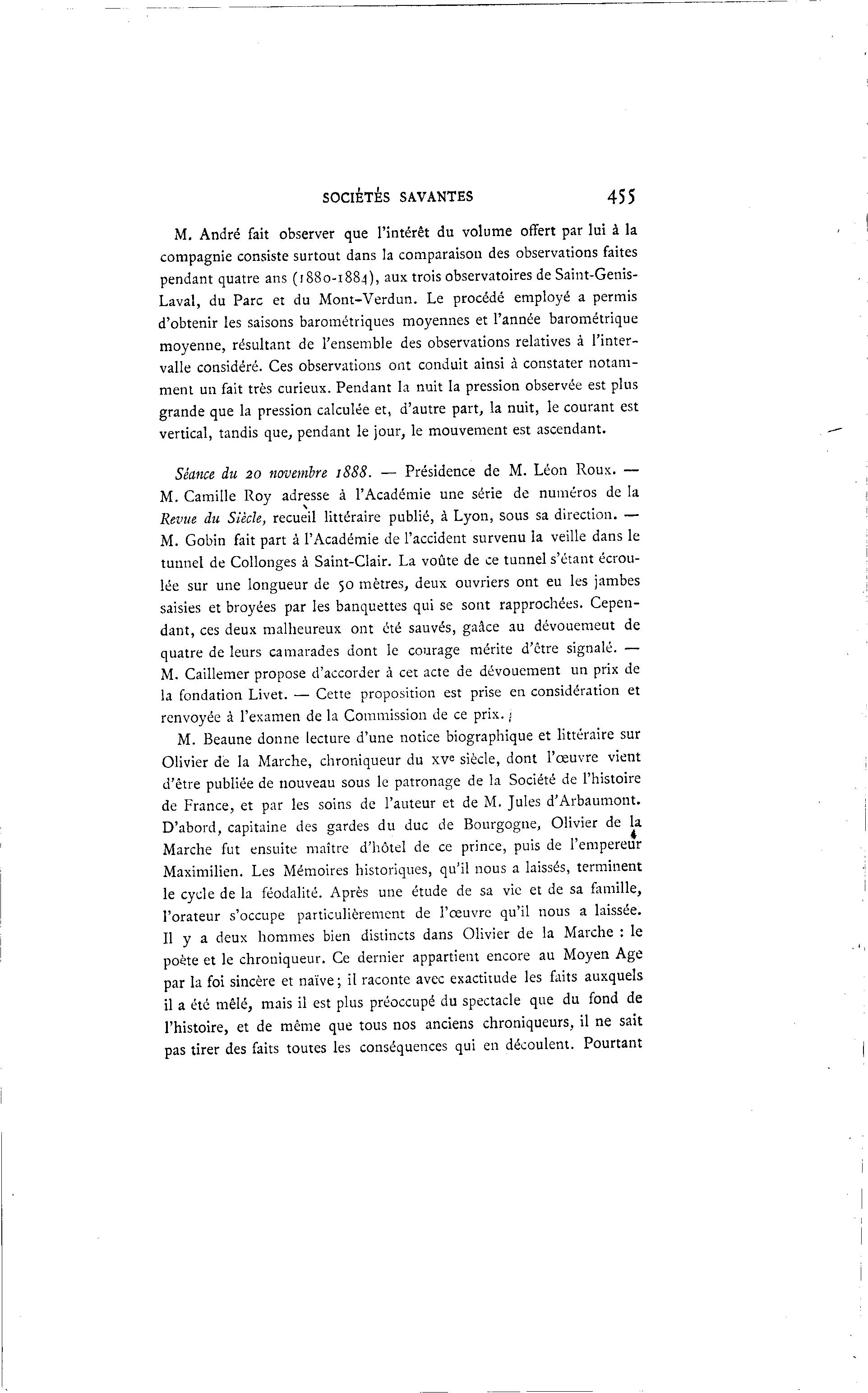 SOCIÉTÉS SAVANTES 455 M. André fait observer que l'intérêt du volume offert par lui à la compagnie consiste surtout dans la comparaison des observations faites pendant quatre ans (1880-1884), aux trois observatoires de Saint-Genis- Laval, du Parc et du Mont-Verdun. Le procédé employé a permis d'obtenir les saisons barométriques moyennes et l'année barométrique moyenne, résultant de l'ensemble des observations relatives à l'inter- valle considéré. Ces observations ont conduit ainsi à constater notam- ment un fait très curieux. Pendant la nuit la pression observée est plus grande que la pression calculée et, d'autre part, la nuit, le courant est vertical, tandis que, pendant le jour, le mouvement est ascendant. Séance du 20 novembre 1888. — Présidence de M. Léon Roux. — M. Camille Roy adresse à l'Académie une série de numéros de la Revue du Siècle, recueil littéraire publié, à Lyon, sous sa direction. — M. Gobin fait part à l'Académie de l'accident survenu la veille dans le tunnel de Collonges à Saint-Clair. La voûte de ce tunnel s'étant écrou- lée sur une longueur de 50 mètres, deux ouvriers ont eu les jambes saisies et broyées par les banquettes qui se sont rapprochées. Cepen- dant, ces deux malheureux ont été sauvés, gaâce au dévouemeut de quatre de leurs camarades dont le courage mérite d'être signalé. — M. Caillemer propose d'accorder à cet acte de dévouement un prix de la fondation Livet. — Cette proposition est prise en considération et renvoyée à l'examen de la Commission de ce prix. ! M. Beaune donne lecture d'une notice biographique et littéraire sur Olivier de la Marche, chroniqueur du xv e siècle, dont l'œuvre vient d'être publiée de nouveau sous le patronage de la Société de l'histoire de France, et par les soins de l'auteur et de M. Jules d'Arbaumont. D'abord, capitaine des gardes du duc de Bourgogne, Olivier de la Marche fut ensuite maître d'hôtel de ce prince, puis de l'empereur Maximilien. Les Mémoires historiques, qu'il nous a laissés, terminent le cycle de la féodalité. Après une étude de sa vie et de sa famille, l'orateur s'occupe particulièrement de l'œuvre qu'il nous a laissée. Il y a deux hommes bien distincts dans Olivier de la Marche : le poète et le chroniqueur. Ce dernier appartient encore au Moyen Age par la foi sincère et naïve ; il raconte avec exactitude les faits auxquels il a été mêlé, mais il est plus préoccupé du spectacle que du fond de l'histoire, et de même que tous nos anciens chroniqueurs, il ne sait pas tirer des faits toutes les conséquences qui en découlent. Pourtant