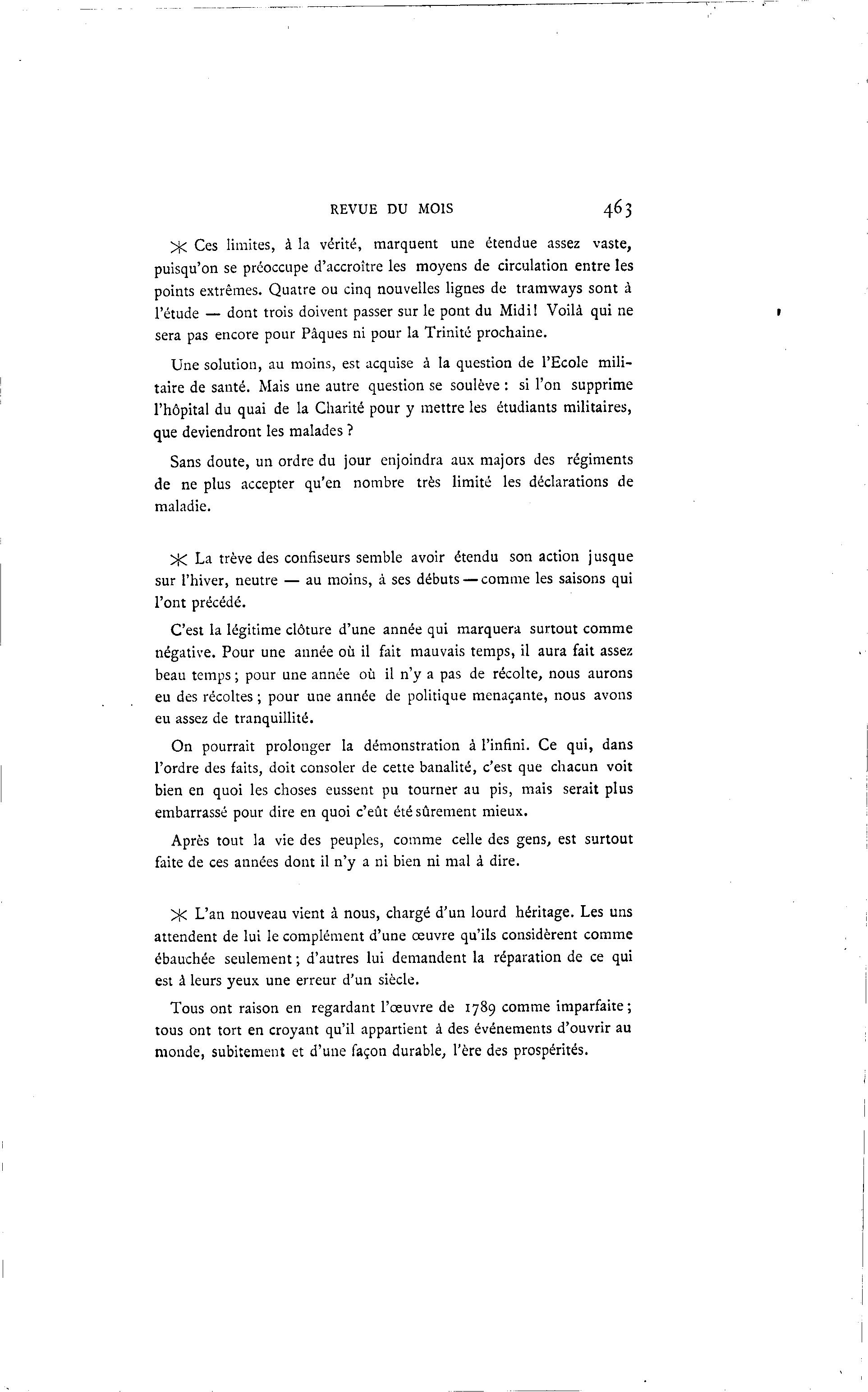 REVUE DU MOIS 463 X Ces limites, à la vérité, marquent une étendue assez vaste, puisqu'on se préoccupe d'accroître les moyens de circulation entre les points extrêmes. Quatre ou cinq nouvelles lignes de tramways sont à l'étude — dont trois doivent passer sur le pont du Midi! Voilà qui ne sera pas encore pour Pâques ni pour la Trinité prochaine. Une solution, au moins, est acquise à la question de l'Ecole mili- taire de santé. Mais une autre question se soulève : si l'on supprime l'hôpital du quai de la Charité pour y mettre les étudiants militaires, que deviendront les malades ? Sans doute, un ordre du jour enjoindra aux majors des régiments de ne plus accepter qu'en nombre très limité les déclarations de maladie. >K La trêve des confiseurs semble avoir étendu son action jusque sur l'hiver, neutre — au moins, à ses débuts — comme les saisons qui l'ont précédé. C'est la légitime clôture d'une année qui marquera surtout comme négative. Pour une année où il fait mauvais temps, il aura fait assez beau temps ; pour une année où il n'y a pas de récolte, nous aurons eu des récoltes ; pour une année de politique menaçante, nous avons eu assez de tranquillité. On pourrait prolonger la démonstration à l'infini. Ce qui, dans l'ordre des faits, doit consoler de cette banalité, c'est que chacun voit bien en quoi les choses eussent pu tourner au pis, mais serait plus embarrassé pour dire en quoi c'eût été sûrement mieux. Après tout la vie des peuples, comme celle des gens, est surtout faite de ces années dont il n'y a ni bien ni mal à dire. yfi. L'an nouveau vient à nous, chargé d'un lourd héritage. Les uns attendent de lui le complément d'une oeuvre qu'ils considèrent comme ébauchée seulement ; d'autres lui demandent la réparation de ce qui est à leurs yeux une erreur d'un siècle. Tous ont raison en regardant l'œuvre de 1789 comme imparfaite; tous ont tort en croyant qu'il appartient à des événements d'ouvrir au monde, subitement et d'une façon durable, l'ère des prospérités.