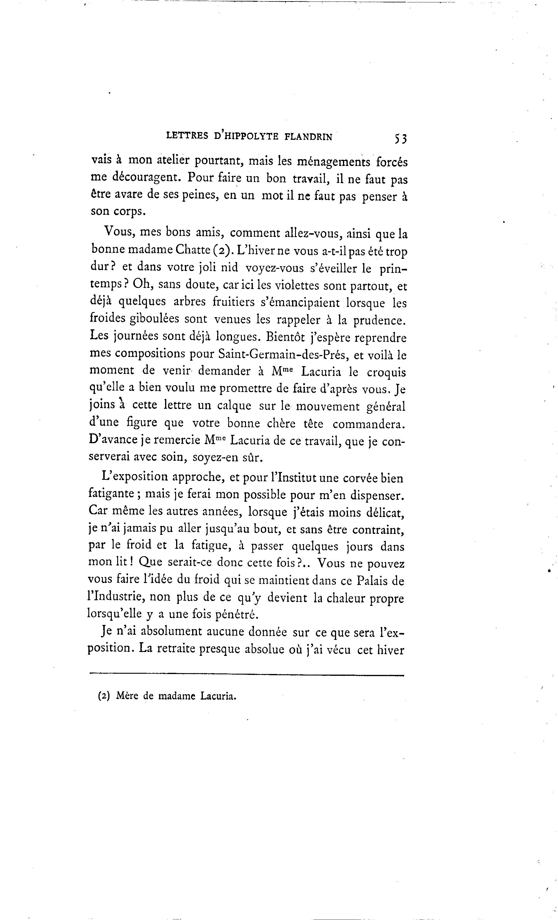 LETTRES D'HIPPOLYTE FLANDRIN 53 vais à mon atelier pourtant, mais les ménagements forcés me découragent. Pour faire un bon travail, il ne faut pas être avare de ses peines, en un mot il ne faut pas penser à son corps. Vous, mes bons amis, comment allez-vous, ainsi que la bonne madame Chatte (2). L'hiverné vous a-t-ilpas été trop dur? et dans votre joli nid voyez-vous s'éveiller le prin- temps? Oh, sans doute, car ici les violettes sont partout, et déjà quelques arbres fruitiers s'émancipaient lorsque les froides giboulées sont venues les rappeler à la prudence. Les journées sont déjà longues. Bientôt j'espère reprendre mes compositions pour Saint-Germain-des-Prés, et voilà le moment de venir demander à Mme Lacuria le croquis qu'elle a bien voulu me promettre de faire d'après vous. Je joins à cette lettre un calque sur le mouvement général d'une figure que votre bonne chère tête commandera. D'avance je remercie Mme Lacuria de ce travail, que je con- serverai avec soin, soyez-en sûr. L'exposition approche, et pour l'Institut une corvée bien fatigante ; mais je ferai mon possible pour m'en dispenser. Car même les autres années, lorsque j'étais moins délicat, je n'ai jamais pu aller jusqu'au bout, et sans être contraint, par le froid et la fatigue, à passer quelques jours dans mon lit! Que serait-ce donc cette fois?.. Vous ne pouvez vous faire l'idée du froid qui se maintient dans ce Palais de l'Industrie, non plus de ce qu'y devient la chaleur propre lorsqu'elle y a une fois pénétré. Je n'ai absolument aucune donnée sur ce que sera l'ex- position. La retraite presque absolue où j'ai vécu cet hiver (2) Mère de madame Lacuria.