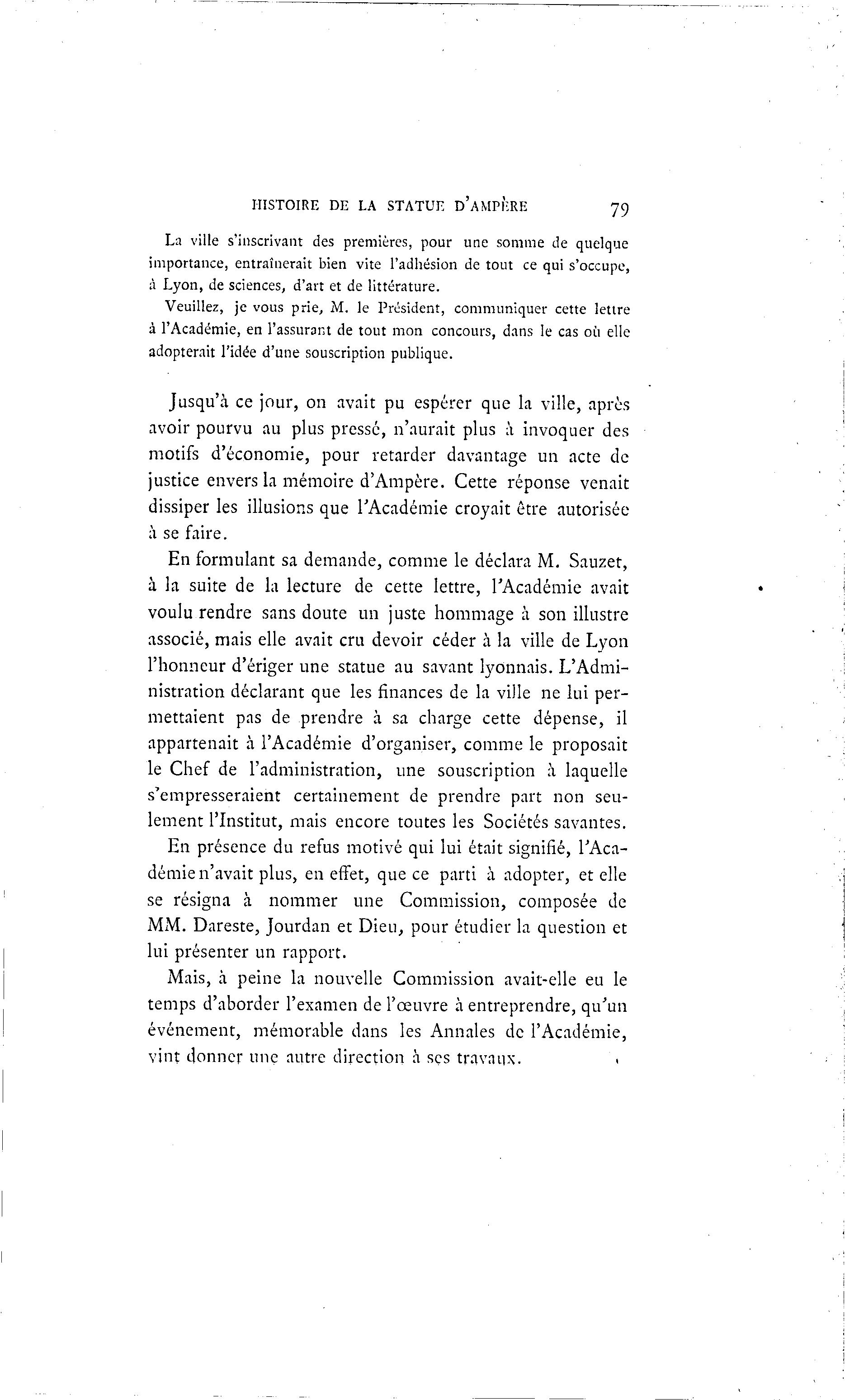 HISTOIRE DE LA STATUE D'AMPÈRE 79 La ville s'inscrivant des premières, pour une somme de quelque importance, entraînerait bien vite l'adhésion de tout ce qui s'occupe, à Lyon, de sciences, d'art et de littérature. Veuillez, je vous prie, M. le Président, communiquer cette lettre à l'Académie, en l'assurant de tout mon concours, dans le cas où elle adopterait l'idée d'une souscription publique. Jusqu'à ce jour, on avait pu espérer que la ville, après avoir pourvu au plus pressé, n'aurait plus à invoquer des motifs d'économie, pour retarder davantage un acte de justice envers la mémoire d'Ampère. Cette réponse venait dissiper les illusions que l'Académie croyait être autorisée à se faire. En formulant sa demande, comme le déclara M. Sauzet, à la suite de la lecture de cette lettre, l'Académie avait voulu rendre sans doute un juste hommage à son illustre associé, mais elle avait cru devoir céder à la ville de Lyon l'honneur d'ériger une statue au savant lyonnais. L'Admi- nistration déclarant que les finances de la ville ne lui per- mettaient pas de prendre à sa charge cette dépense, il appartenait à l'Académie d'organiser, comme le proposait le Chef de l'administration, une souscription à laquelle s'empresseraient certainement de prendre part non seu- lement l'Institut, mais encore toutes les Sociétés savantes. En présence du refus motivé qui lui était signifié, l'Aca- démie n'avait plus, en effet, que ce parti à adopter, et elle se résigna à nommer une Commission, composée de MM. Dareste, Jourdan et Dieu, pour étudier la question et lui présenter un rapport. Mais, à peine la nouvelle Commission avait-elle eu le temps d'aborder l'examen de l'œuvre à entreprendre, qu'un événement, mémorable dans les Annales de l'Académie, vint donner une autre direction à sçs travaux. «