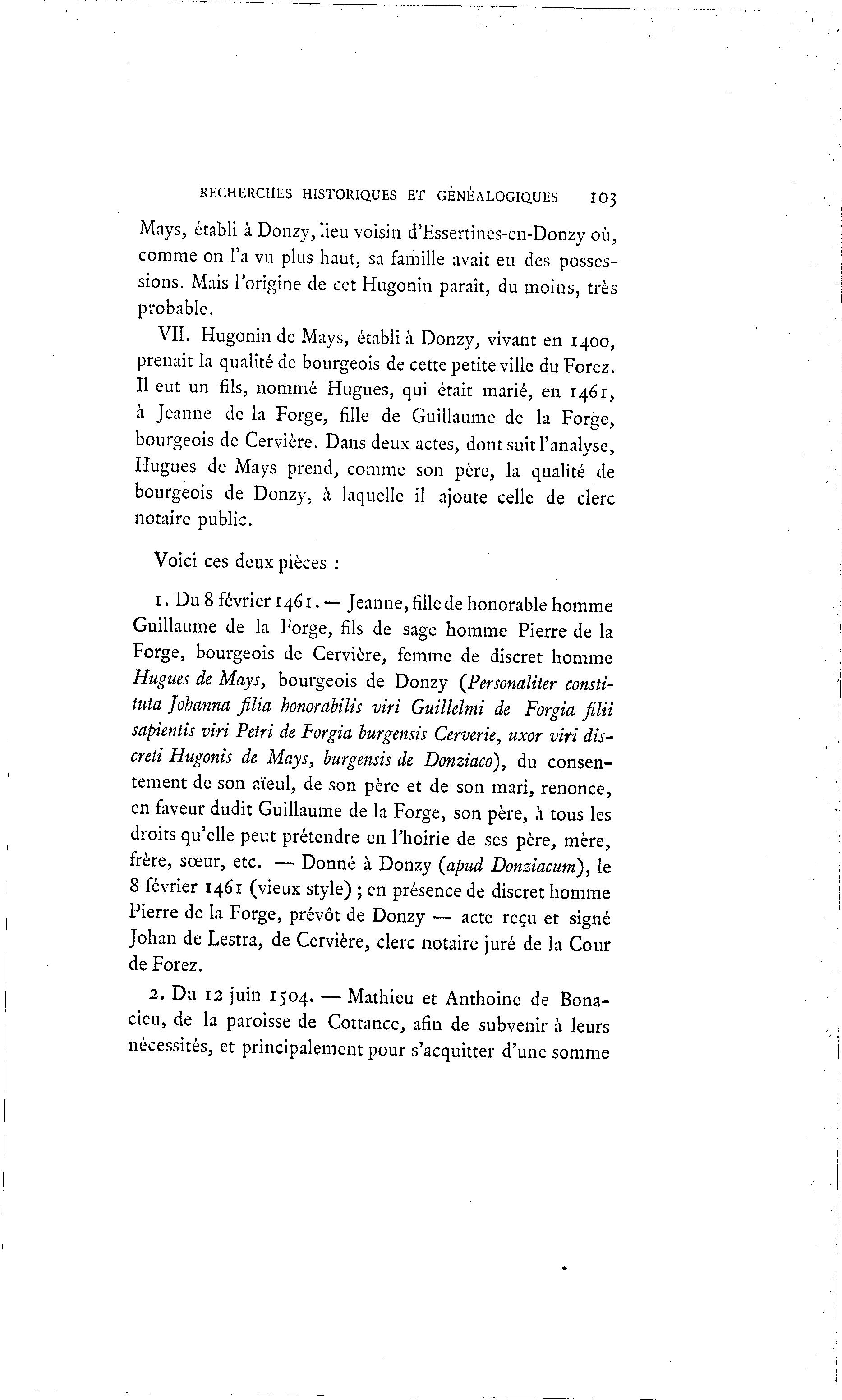 RECHERCHES HISTORIQUES ET GENEALOGIQUES IO3 Mays, établi à Donzy, lieu voisin d'Essertines-en-Donzy où, comme on l'a vu plus haut, sa famille avait eu des posses- sions. Mais l'origine de cet Hugonin paraît, du moins, très probable. VII. Hugonin de Mays, établi à Donzy, vivant en 1400, prenait la qualité de bourgeois de cette petite ville du Forez. Il eut un fils, nommé Hugues, qui était marié, en 1461, à Jeanne de la Forge, fille de Guillaume de la Forge, bourgeois de Cervière. Dans deux actes, dont suit l'analyse, Hugues de Ma ys prend, comme son père, la qualité de bourgeois de Donzy, à laquelle il ajoute celle de clerc notaire public. Voici ces deux pièces : 1. Du 8 février 1461.— Jeanne,fillede honorable homme Guillaume de la Forge, fils de sage homme Pierre de la Forge, bourgeois de Cervière, femme de discret homme Hugues de Mays, bourgeois de Donzy (Personaliter consti- tuta Johanna filia honorabilis viri Guillelmi de Forgia filii sapientis viri Pétri de Forgia burgensis Cerverie, uxor viri dis- creti Hugonis de Mays, burgensis de Donziaco), du consen- tement de son aïeul, de son père et de son mari, renonce, en faveur dudit Guillaume de la Forge, son père, à tous les droits qu'elle peut prétendre en l'hoirie de ses père, mère, frère, sœur, etc. — Donné à Donzy (apud Donziacunî), le 8 février 1461 (vieux style) ; en présence de discret homme Pierre de la Forge, prévôt de Donzy — acte reçu et signé Johan de Lestra, de Cervière, clerc notaire juré de la Cour de Forez. 2. Du 12 juin 1504. — Mathieu et Anthoine de Bona- cieu, de la paroisse de Cottance, afin de subvenir à leurs nécessités, et principalement pour s'acquitter d'une somme
