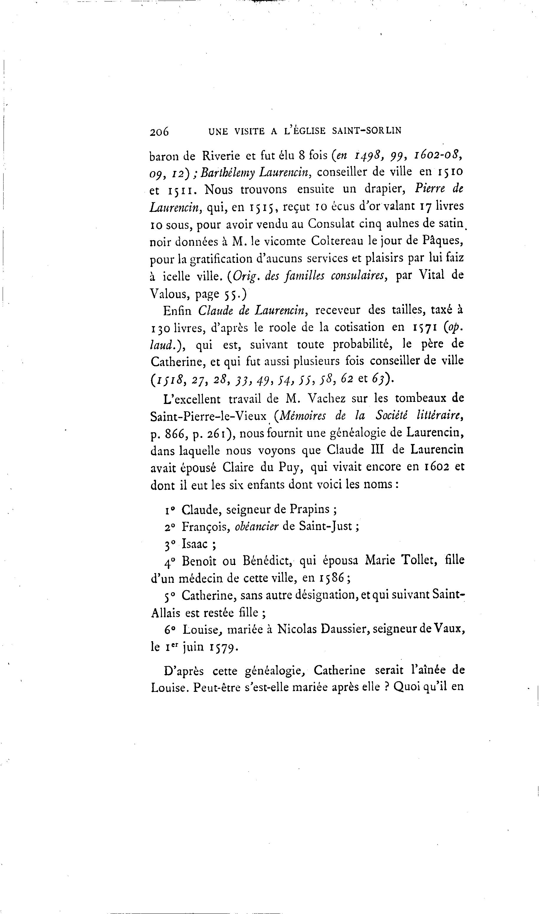 206 UNE VISITE A L'ÉGLISE SAINT-SORLIN baron de Riverie et fut élu 8 fois (en 1498, <)<), 1602-08, 09, 12) ; Barthélémy Laurencin, conseiller de ville en 1510 et 1511. Nous trouvons ensuite un drapier, Pierre de Laurencin, qui, en 1515, reçut 10 écus d'or valant 17 livres 10 sous, pour avoir vendu au Consulat cinq aulnes de satin. noir données à M. le vicomte Coltereau le jour de Pâques, pour la gratification d'aucuns services et plaisirs par lui faiz à icelle ville. (Orig. des familles consulaires, par Vital de Valous, page 55.) Enfin Claude de Laurencin, receveur des tailles, taxé à 130 livres, d'après le roole de la cotisation en 1571 (op. laud.), qui est, suivant toute probabilité, le père de Catherine, et qui fut aussi plusieurs fois conseiller de ville (1S18, 27, 28, 33, 4% 54, 55, 5$, 62 et 63). L'excellent travail de M. Vachez sur les tombeaux de Saint-Pierre-le-Vieux (Mémoires de la Société littéraire, p. 866, p. 261), nous fournit une généalogie de Laurencin, dans laquelle nous voyons que Claude III de Laurencin avait épousé Claire du Puy, qui vivait encore en 1602 et dont il eut les six enfants dont voici les noms : i" Claude, seigneur de Prapins ; 2° François, obèancier de Saint-Just ; 30 Isaac ; 40 Benoît ou Bénédict, qui épousa Marie Tollet, fille d'un médecin de cette ville, en 1586 ; S ° Catherine, sans autre désignation, et qui suivant Saint- Allais est restée fille ; 6° Louise, mariée à Nicolas Daussier, seigneur de Vaux, le I er juin 1579. D'après cette généalogie, Catherine serait l'aînée de Louise. Peut-être s'est-elle mariée après elle ? Quoi qu'il en