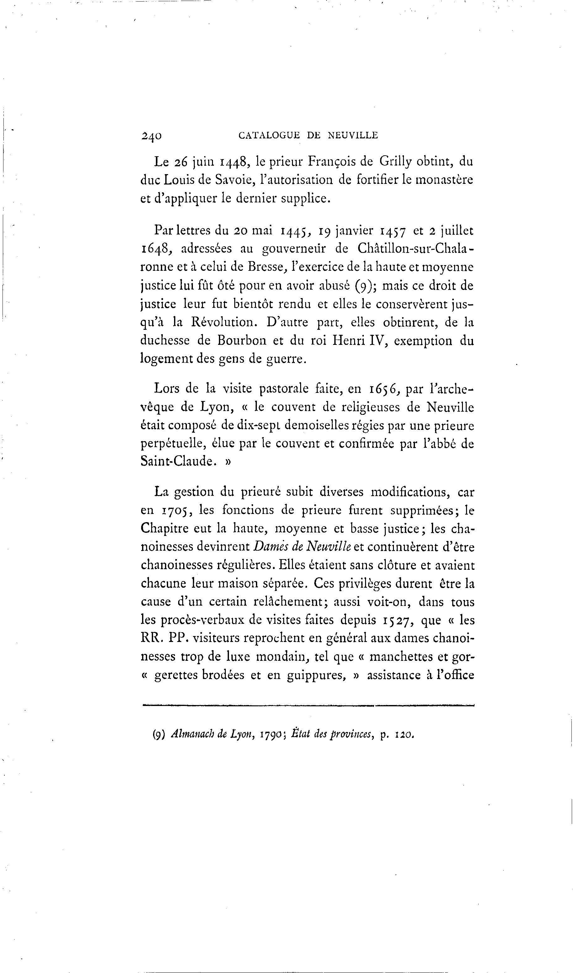 240 CATALOGUE DE NEUVILLE Le 26 juin 1448, le prieur François de Grilly obtint, du duc Louis de Savoie, l'autorisation de fortifier le monastère et d'appliquer le dernier supplice. Par lettres du 20 mai 1445, 19 janvier 1457 et 2 juillet 1648, adressées au gouverneur de Châtillon-sur-Chala- ronne et à celui de Bresse, l'exercice de la haute et moyenne justice lui fût ôté pour en avoir abusé (9); mais ce droit de justice leur fut bientôt rendu et elles le conservèrent jus- qu'à la Révolution. D'autre part, elles obtinrent, de la duchesse de Bourbon et du roi Henri IV, exemption du logement des gens de guerre. Lors de la visite pastorale faite, en 1656, par l'arche- vêque de Lyon, « le couvent de religieuses de Neuville était composé de dix-sept demoiselles régies par une prieure perpétuelle, élue par le couvent et confirmée par l'abbé de Saint-Claude. » La gestion du prieuré subit diverses modifications, car en 1705, les fonctions de prieure furent supprimées; le Chapitre eut la haute, moyenne et basse justice; les cha- noinesses devinrent Damés de Neuville et continuèrent d'être chanoinesses régulières. Elles étaient sans clôture et avaient chacune leur maison séparée. Ces privilèges durent être la cause d'un certain relâchement; aussi voit-on, dans tous les procès-verbaux de visites faites depuis 1527, que « les RR. PP. visiteurs reprochent en général aux dames chanoi- nesses trop de luxe mondain, tel que « manchettes et gor- « gerettes brodées et en guippures, » assistance à l'office (9) Almanach de Lyon, 1790; État des provinces, p. 120.