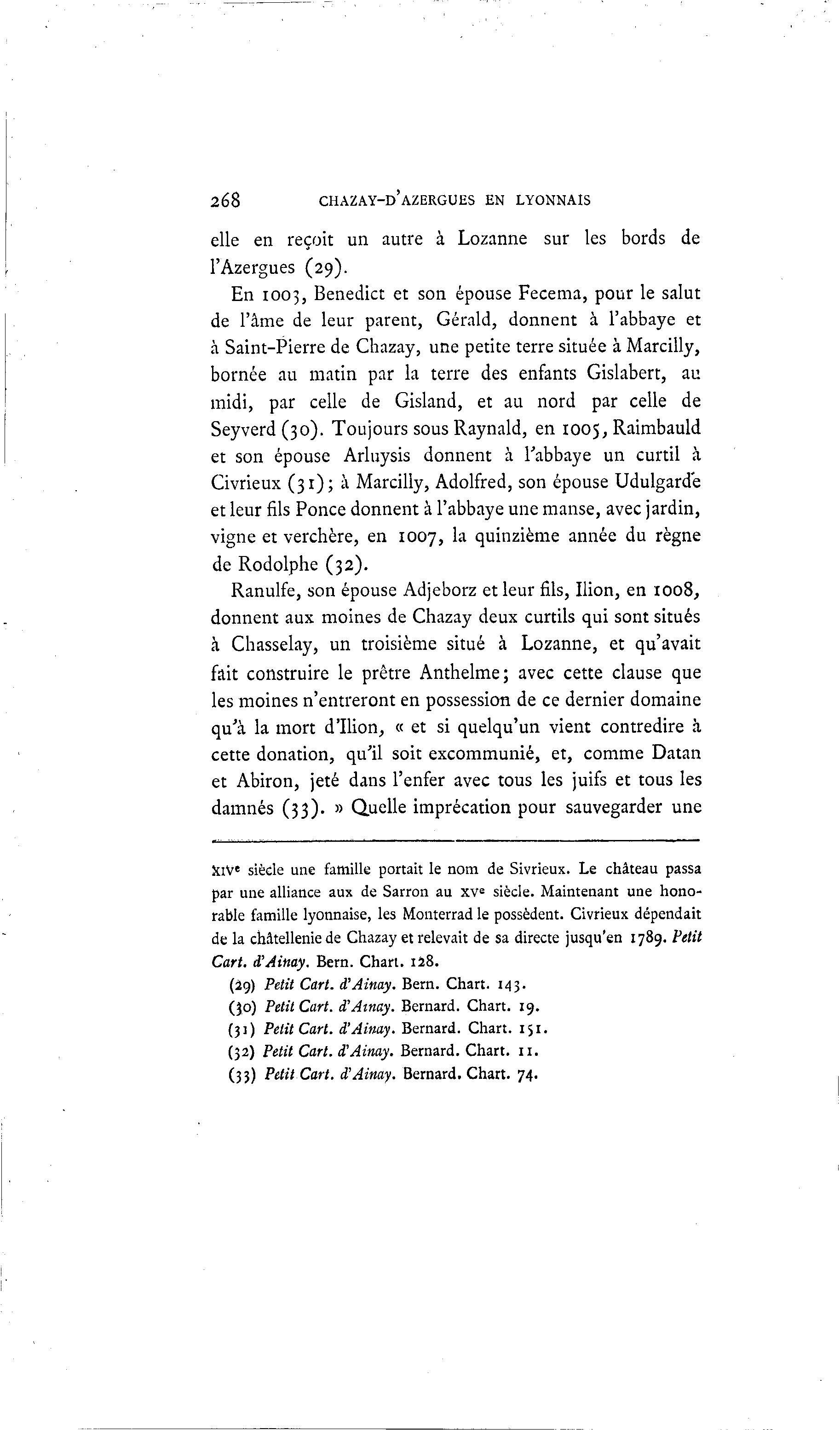 268 CHAZAY-D'AZERGUES EN LYONNAIS elle en reçoit un autre à Lozanne sur les bords de l'Azergues (29). En 1003, Benedict et son épouse Fecema, pour le salut de l'âme de leur parent, Gérald, donnent à l'abbaye et à Saint-Pierre de Chazay, une petite terre située à Marcilly, bornée au matin par la terre des enfants Gislabert, au midi, par celle de Gisland, et au nord par celle de Seyverd (30). Toujours sous Raynald, en 1005, Raimbauld et son épouse Arluysis donnent à l'abbaye un curtil à Civrieux (31); à Marcilly, Adolfred, son épouse Udulgarde et leur fils Ponce donnent à l'abbaye une manse, avec jardin, vigne et verchère, en 1007, la quinzième année du règne de Rodolphe (32). Ranulfe, son épouse Adjeborz et leur fils, Ilion, en 1008, donnent aux moines de Chazay deux curtils qui sont situés à Chasselay, un troisième situé à Lozanne, et qu'avait fait construire le prêtre Anthelme; avec cette clause que les moines n'entreront en possession de ce dernier domaine qu'à la mort d'Ilion, « et si quelqu'un vient contredire à cette donation, qu'il soit excommunié, et, comme Datan et Abiron, jeté dans l'enfer avec tous les juifs et tous les damnés (33). » Quelle imprécation pour sauvegarder une XIVe sièele une famille portait le nom de Sivrieux. Le château passa par une alliance aux de Sarron au XVe siècle. Maintenant une hono- rable famille lyonnaise, les Mouterrad le possèdent. Civrieux dépendait de la châtellenie de Chazay et relevait de sa directe jusqu'en 1789. Petit Cart. d'Ainay. Bern. Chart. 128. (29) Petit Cart. d'Ainay. Bern. Chart. 143. (30) Petit Cart. d'Ainay. Bernard. Chart. 19. (31) Petit Cart. d'Ainay. Bernard. Chart. 151. (32) Petit Cart. d'Ainay. Bernard. Chart. 11. (33) Petit Cart. d'Ainay. Bernard. Chart. 74.