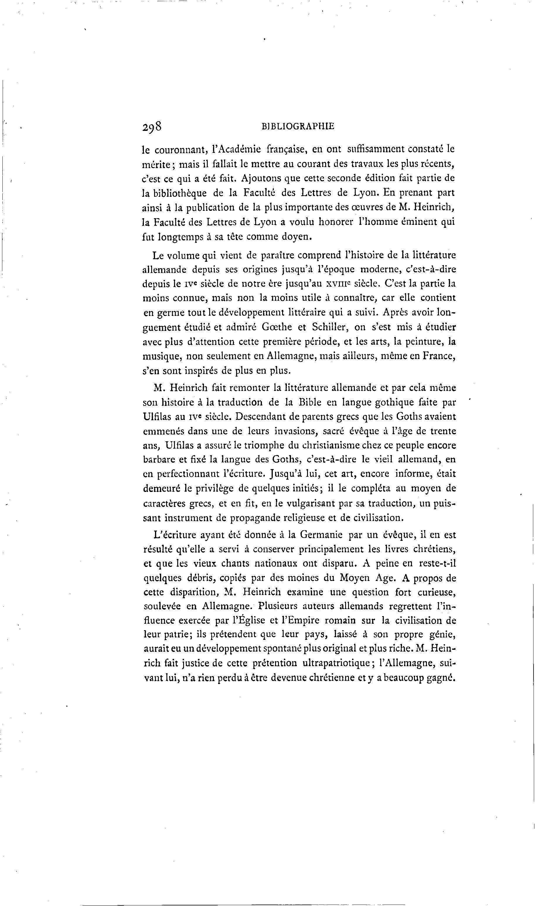 298 BIBLIOGRAPHIE le couronnant, l'Académie française, en ont suffisamment constaté le mérite ; mais il fallait le mettre au courant des travaux les plus récents, c'est ce qui a été fait. Ajoutons que cette seconde édition fait partie de la bibliothèque de la Faculté des Lettres de Lyon. En prenant part ainsi à la publication de la plus importante des œuvres de M. Heinrich, la Faculté des Lettres de Lyon a voulu honorer l'homme éminent qui fut longtemps à sa tête comme doyen. Le volume qui vient de paraître comprend l'histoire de la littérature allemande depuis ses origines jusqu'à l'époque moderne, c'est-à -dire depuis le iv<= siècle de notre ère jusqu'au XVIIF siècle. C'est la partie la moins connue, mais non la moins utile à connaître, car elle contient en germe tout le développement littéraire qui a suivi. Après avoir lon- guement étudié et admiré Gœthe et Schiller, on s'est mis à étudier avec plus d'attention cette première période, et les arts, la peinture, la musique, non seulement en Allemagne, mais ailleurs, même en France, s'en sont inspirés de plus en plus. M. Heinrich fait remonter la littérature allemande et par cela même sou histoire à la traduction de la Bible en langue gothique faite par Ulfilas au iv= siècle. Descendant de parents grecs que les Goths avaient emmenés dans une de leurs invasions, sacré évêque à l'âge de trente ans, Ulfilas a assuré le triomphe du christianisme chez ce peuple encore barbare et fixé la langue des Goths, c'est-à -dire le vieil allemand, en en perfectionnant l'écriture. Jusqu'à lui, cet art, encore informe, était demeuré le privilège de quelques initiés ; il le compléta au moyen de caractères grecs, et en fit, en le vulgarisant par sa traduction, un puis- sant instrument de propagande religieuse et de civilisation. L'écriture ayant été donnée à la Germanie par un évêque, il en est résulté qu'elle a servi à conserver principalement les livres chrétiens, et que les vieux chants nationaux ont disparu. A peine en reste-t-il quelques débris, copiés par des moines du Moyen Age. A propos de cette disparition, M. Heinrich examine une question fort curieuse, soulevée en Allemagne. Plusieurs auteurs allemands regrettent l'in- fluence exercée par l'Eglise et l'Empire romain sur la civilisation de leur patrie; ils prétendent que leur pays, laissé à son propre génie, aurait eu un développement spontané plus original et plus riche. M. Hein- rich fait justice de cette prétention ultrapatriotique ; l'Allemagne, sui- vant lui, n'a rien perdu à être devenue chrétienne et y a beaucoup gagné.