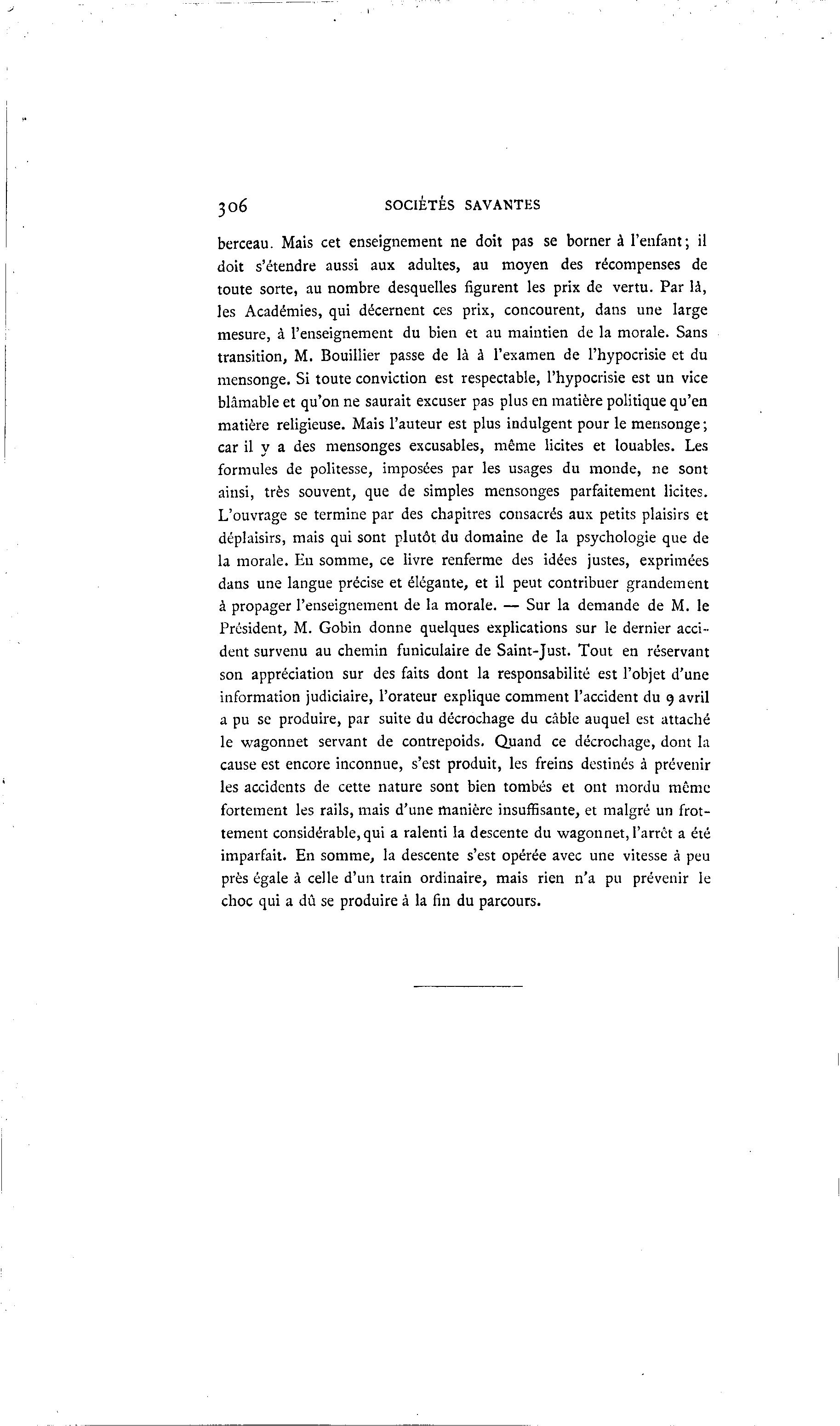 30e SOCIÉTÉS SAVANTES berceau. Mais cet enseignement ne doit pas se borner à l'enfant; il doit s'étendre aussi aux adultes, au moyen des récompenses de toute sorte, au nombre desquelles figurent les prix de vertu. Par là , les Académies, qui décernent ces prix, concourent, dans une large mesure, à l'enseignement du bien et au maintien de la morale. Sans transition, M. Bouillier passe de là à l'examen de l'hypocrisie et du mensonge. Si toute conviction est respectable, l'hypocrisie est un vice blâmable et qu'on ne saurait excuser pas plus en matière politique qu'en matière religieuse. Mais l'auteur est plus indulgent pour le mensonge ; car il y a des mensonges excusables, même licites et louables. Les formules de politesse, imposées par les usages du monde, ne sont ainsi, très souvent, que de simples mensonges parfaitement licites. L'ouvrage se termine par des chapitres consacrés aux petits plaisirs et déplaisirs, mais qui sont plutôt du domaine de la psychologie que de la morale. Eu somme, ce livre renferme des idées justes, exprimées dans une langue précise et élégante, et il peut contribuer grandement à propager l'enseignement de la morale. — Sur la demande de M. le Président, M. Gobin donne quelques explications sur le dernier acci- dent survenu au chemin funiculaire de Saint-Just. Tout en réservant son appréciation sur des faits dont la responsabilité est l'objet d'une information judiciaire, l'orateur explique comment l'accident du 9 avril a pu se produire, par suite du décrochage du câble auquel est attaché le wagonnet servant de contrepoids. Quand ce décrochage, dont la cause est encore inconnue, s'est produit, les freins destinés à prévenir les accidents de cette nature sont bien tombés et ont mordu même fortement les rails, mais d'une manière insuffisante, et malgré un frot- tement considérable, qui a ralenti la descente du wagonnet, l'arrêt a été imparfait. En somme, la descente s'est opérée avec une vitesse à peu près égale à celle d'un train ordinaire, mais rien n'a pu prévenir le choc qui a dû se produire à la fin du parcours.