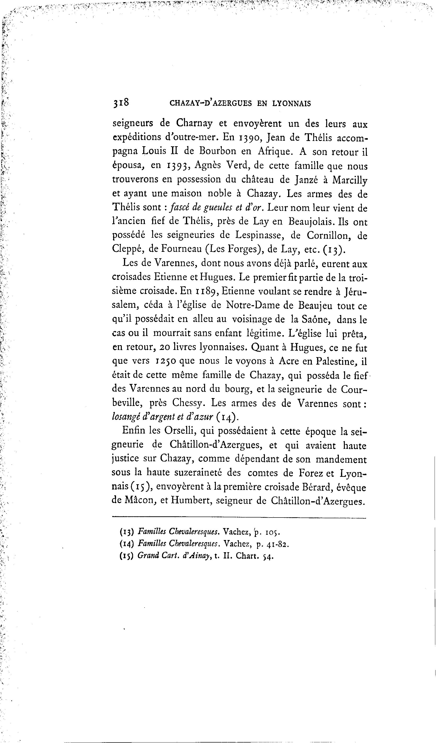 318 CHAZAY-D'AZERGUES EN LYONNAIS seigneurs de Charnay et envoyèrent un des leurs aux expéditions d'outre-mer. En 1390, Jean de Thélis accom- pagna Louis II de Bourbon en Afrique. A son retour il épousa, en 1393, Agnès Verd, de cette famille que nous trouverons en possession du château de Janzé à Marcilly et ayant une maison noble à Chazay. Les armes des de Thélis sont : fascé de gueules et d'or. Leur nom leur vient de l'ancien fief de Thélis, près de Lay en Beaujolais. Ils ont possédé les seigneuries de Lespinasse, de Cornillon, de Cleppé, de Fourneau (Les Forges), de Lay, etc. (13). Les de Varennes, dont nous avons déjà parlé, eurent aux croisades Etienne et Hugues. Le premierfitpartie de la troi- sième croisade. En 1189, Etienne voulant se rendre à Jéru- salem, céda à l'église de Notre-Dame de Beau jeu tout ce qu'il possédait en alleu au voisinage de la Saône, dans le cas ou il mourrait sans enfant légitime. L'église lui prêta, en retour, 20 livres lyonnaises. Quant à Hugues, ce ne fut que vers 1250 que nous le voyons à Acre en Palestine, il était de cette même famille de Chazay, qui posséda le fief des Varennes au nord du bourg, et la seigneurie de Cour- beville, près Chessy. Les armes des de Varennes sont : losange d'argent et d'azur (14). Enfin les Orselli, qui possédaient à cette époque la sei- gneurie de Châtillon-d'Azergues, et qui avaient haute justice sur Chazay, comme dépendant de son mandement sous la haute suzeraineté des comtes de Forez et Lyon- nais (15), envoyèrent à la première croisade Bérard, évêque de Mâcon, et Humbert, seigneur de Châtillon-d'Azergues. (13) Familles Chevaleresques. Vachez, 'p. 105. (14) Familles Chevaleresques. Vachez, p. 41-82. (15) Grand Cart. d'Ainay,i. II. Chart. 54.