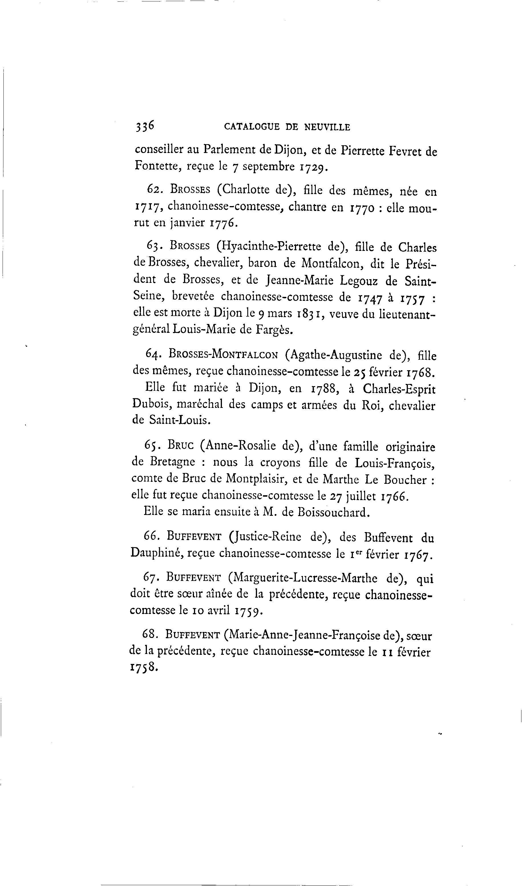 336 CATALOGUE DE NEUVILLE conseiller au Parlement de Dijon, et de Pierrette Fevret de Fontette, reçue le 7 septembre 1729. 62. BROSSES (Charlotte de), fille des mêmes, née en 1717, chanoinesse-comtesse, chantre en 1770 : elle mou- rut en janvier 1776. 63. BROSSES (Hyacinthe-Pierrette de), fille de Charles de Brosses, chevalier, baron de Montfalcon, dit le Prési- dent de Brosses, et de Jeanne-Marie Legouz de Saint- Seine, brevetée chanoinesse-comtesse de 1747 à 1757 : elle est morte à Dijon le 9 mars 1831, veuve du lieutenant- général Louis-Marie de Fargès. 64. BROSSES-MONTFALCON (Agathe-Augustine de), fille des mêmes, reçue chanoinesse-comtesse le 25 février 1768. Elle fut mariée à Dijon, en 1788, à Charles-Esprit Dubois, maréchal des camps et armées du Roi, chevalier de Saint-Louis. 65. BRUC (Anne-Rosalie de), d'une famille originaire de Bretagne : nous la croyons fille de Louis-François, comte de Bruc de Montplaisir, et de Marthe Le Boucher : elle fut reçue chanoinesse-comtesse le 27 juillet 1766. Elle se maria ensuite à M. de Boissouchard. 66. BUFFEVENT (Justice-Reine de), des Buffevent du Dauphiné, reçue chanoinesse-comtesse le Ier février 1767. 67. BUFFEVENT (Marguerite-Lucresse-Marthe de), qui doit être sœur aînée de la précédente, reçue chanoinesse- comtesse le 10 avril 1759. 68. BUFFEVENT (Marie-Anne-Jeanne-Françoise de), sœur de la précédente, reçue chanoinesse-comtesse le 11 février 1758.