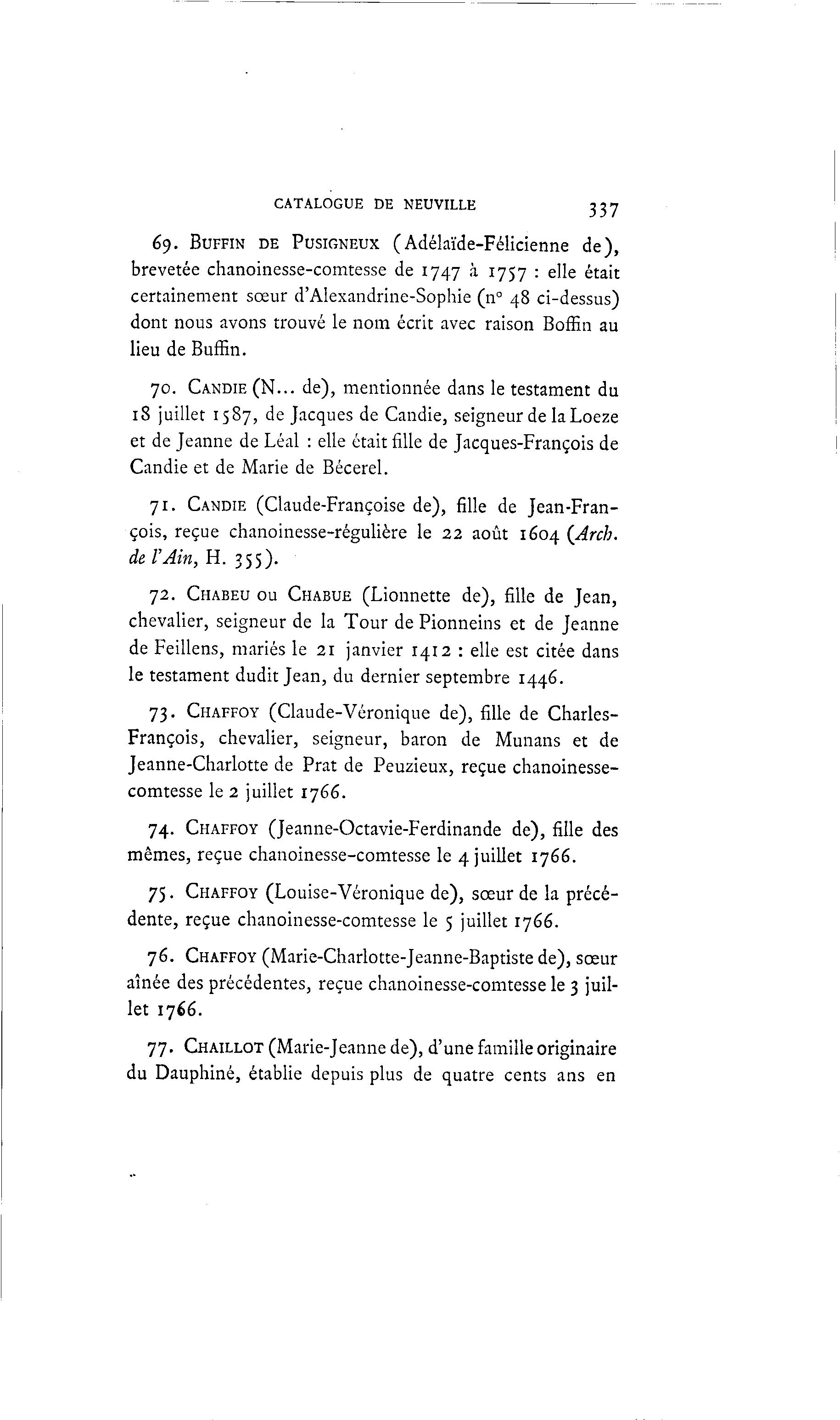 CATALOGUE DE NEUVILLE 337 69. BUFFIN DE PUSIGNEUX (Adélaïde-Félicienne d e ) , brevetée chanoinesse-comtesse de 1747 à 1757 : elle était certainement sÅ“ur d'Alexandrine-Sophie (n° 48 ci-dessus) dont nous avons trouvé le nom écrit avec raison Boffin au lieu de Buffin. 70. CANDIE (N... de), mentionnée dans le testament du 18 juillet 1587, de Jacques de Candie, seigneur de laLoeze et de Jeanne de Léal : elle était fille de Jacques-François de Candie et de Marie de Bécerel. 71. CANDIE (Claude-Françoise de), fille de Jean-Fran- çois, reçue chanoinesse-régulière le 22 août 1604 (Arch. de. ïAin, H. 355). 72. CHABEU ou CHABUE (Lionnette de), fille de Jean, chevalier, seigneur de la Tour de Pionneins et de Jeanne de Feillens, mariés le 21 janvier 1412 : elle est citée dans le testament dudit Jean, du dernier septembre 1446. 73. CHAFFOY (Claude-Véronique de), fille de Charles- François, chevalier, seigneur, baron de Munans et de Jeanne-Charlotte de Prat de Peuzieux, reçue chanoinesse- comtesse le 2 juillet 1766. 74. CHAFFOY (Jeanne-Octavie-Ferdinande de), fille des mêmes, reçue chanoinesse-comtesse le 4 juillet 1766. 75. CHAFFOY (Louise-Véronique de), sÅ“ur de la précé- dente, reçue chanoinesse-comtesse le 5 juillet 1766. 76. CHAFFOY (Marie-Charlotte-Jeanne-Baptiste de), sÅ“ur aînée des précédentes, reçue chanoinesse-comtesse le 3 juil- let ÃJ66. 77. CHAILLOT (Marie-Jeanne de), d'une famille originaire du Dauphiné, établie depuis plus de quatre cents ans en