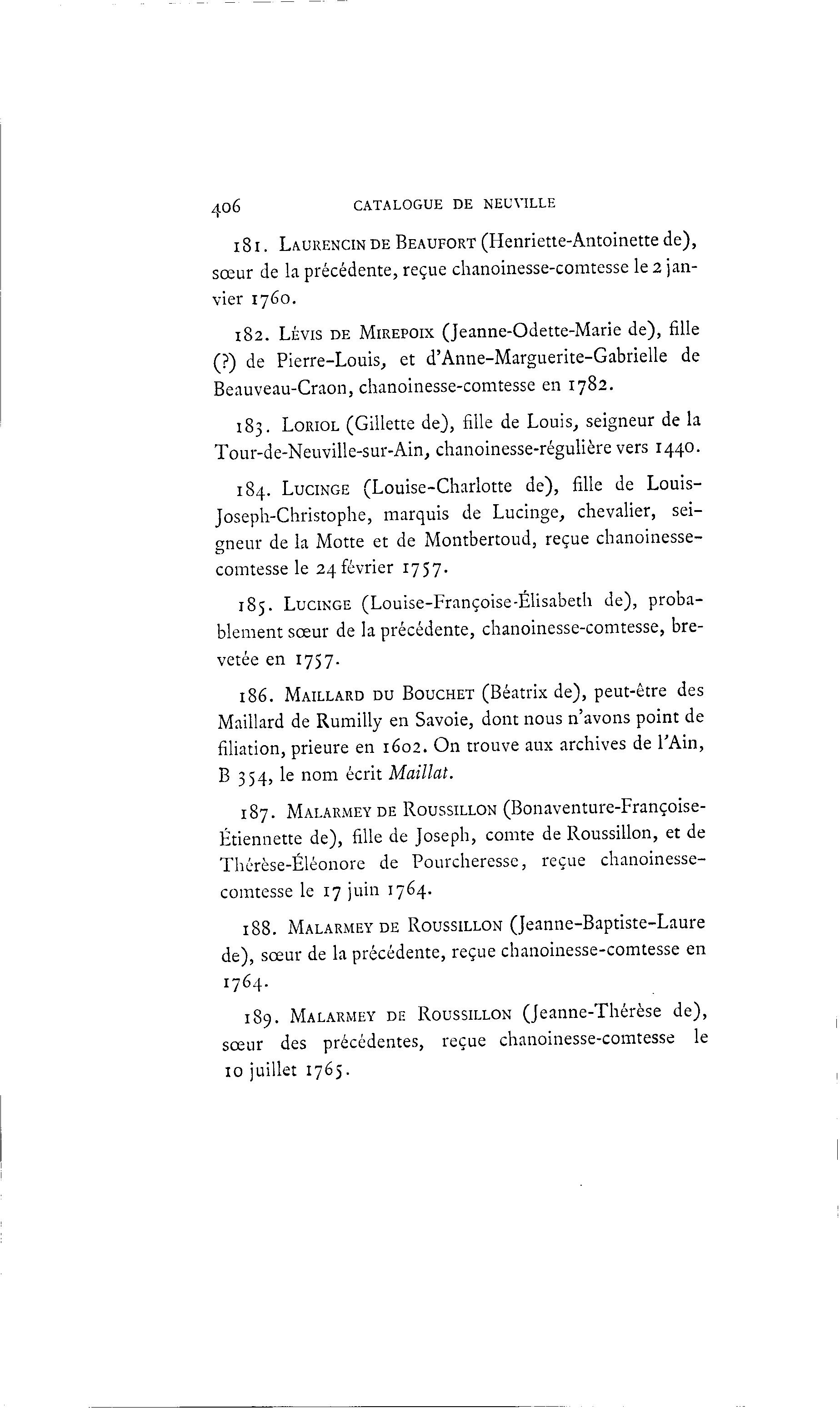 406 CATALOGUE DE NEUVILLE 181. LAURENCIN DE BEAUFORT (Henriette-Antoinette de), sœur de la précédente, reçue chanoinesse-comtesse le 2 jan- vier 1760. 182. LÉvis DE MIREPOIX (Jeanne-Odette-Marie de), fille (?) de Pierre-Louis, et d'Anne-Marguerite-Gabrielle de Beauveau-Craon, chanoinesse-comtesse en 1782. 183. LORIOL (Gillette de), fille de Louis, seigneur de la Tour-de-Neuville-sur-Ain, chanoinesse-régulière vers 1440. 184. LUCINGE (Louise-Charlotte de), fille de Louis- Joseph-Christophe, marquis de Lucinge, chevalier, sei- gneur de la Motte et de Montbertoud, reçue chanoinesse- comtesse le 24 février 1757. 185. LUCINGE (Louise-Françoise-Elisabeth de), proba- blement sœur de la précédente, chanoinesse-comtesse, bre- vetée en 1757. 186. MAILLARD DU BOUCHET (Béatrix de), peut-être des Maillard de Rumilly en Savoie, dont nous n'avons point de filiation, prieure en 1602. On trouve aux archives de l'Ain, B 354, le nom écrit Maillât. 187. MALARMEY DE ROUSSILLON (Bonaventure-Françoise- Étiennette de), fille de Joseph, comte de Roussillon, et de Thérèse-Eléonore de Pourcheresse, reçue chanoinesse- comtesse le 17 juin 1764. 188. MALARMEY DE ROUSSILLON (Jeanne-Baptiste-Laure de), sœur de la précédente, reçue chanoinesse-comtesse en 1764. 189. MALARMEY DE ROUSSILLON (Jeanne-Thérèse de), sœur des précédentes, reçue chanoinesse-comtesse le 10 juillet 1765.