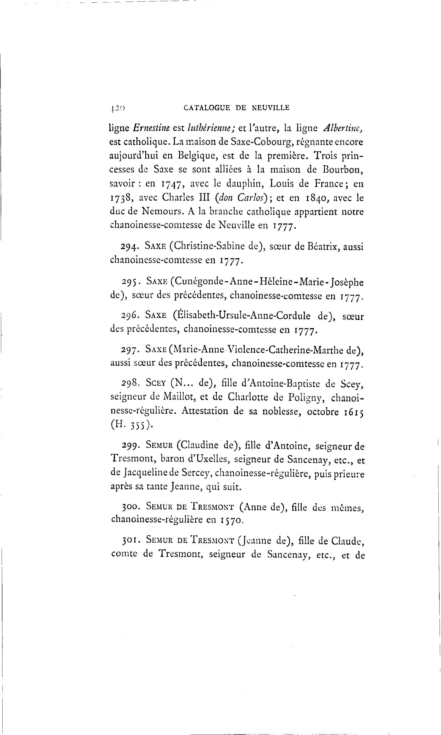 p() CATALOGUE DE NEUVILLE ligne Emestine est luthérienne; et l'autre, la ligne Albertine, est catholique. La maison de Saxe-Cobourg, régnante encore aujourd'hui en Belgique, est de la première. Trois prin- cesses de Saxe se sont alliées à la maison de Bourbon, savoir: en 1747, avec le dauphin, Louis de France; en 1738, avec Charles III (don Carlos); et en 1840,, avec le duc de Nemours. A la branche catholique appartient notre chanoinesse-comtesse de Neuville en T777. 294. SAXE (Christine-Sabine de), sœur de Béatrix, aussi chanoinesse-comtesse en 1777. 295. SAXE (Cunégonde-Anne-Héleine-Marie-Josèphe de), sœur des précédentes, chanoinesse-comtesse en 1777. 296. SAXE (Élisabeth-Ursule-Anne-Cordule de), sœur des précédentes, chanoinesse-comtesse en 1777. 297. SAXE (Marie-Anne Violence-Catherine-Marthe de), aussi sœur des précédentes, chanoinesse-comtesse en 1777. 298. SCEY ( N . . . de), fille d'Antoine-Baptiste de Scey, seigneur de Maillot, et de Charlotte de Poligny, chanoi- nesse-régulière. Attestation de sa noblesse, octobre 1615 (H. 355). 299. SEMUR (Claudine de), fille d'Antoine, seigneur de Tresmont, baron d'Uxelles, seigneur de Sancenay, etc., et de Jacqueline de Sercey, chanoinesse-régulière, puis prieure après sa tante Jeanne, qui suit. 300. SEMUR DE TRESMONT (Anne de), fille des mêmes, chanoinesse-régulière en 1570. 301. SEMUR DE TRESMONT (Jeanne de), fille de Claude, comte de Tresmont, seigneur de Sancenay, etc., et de