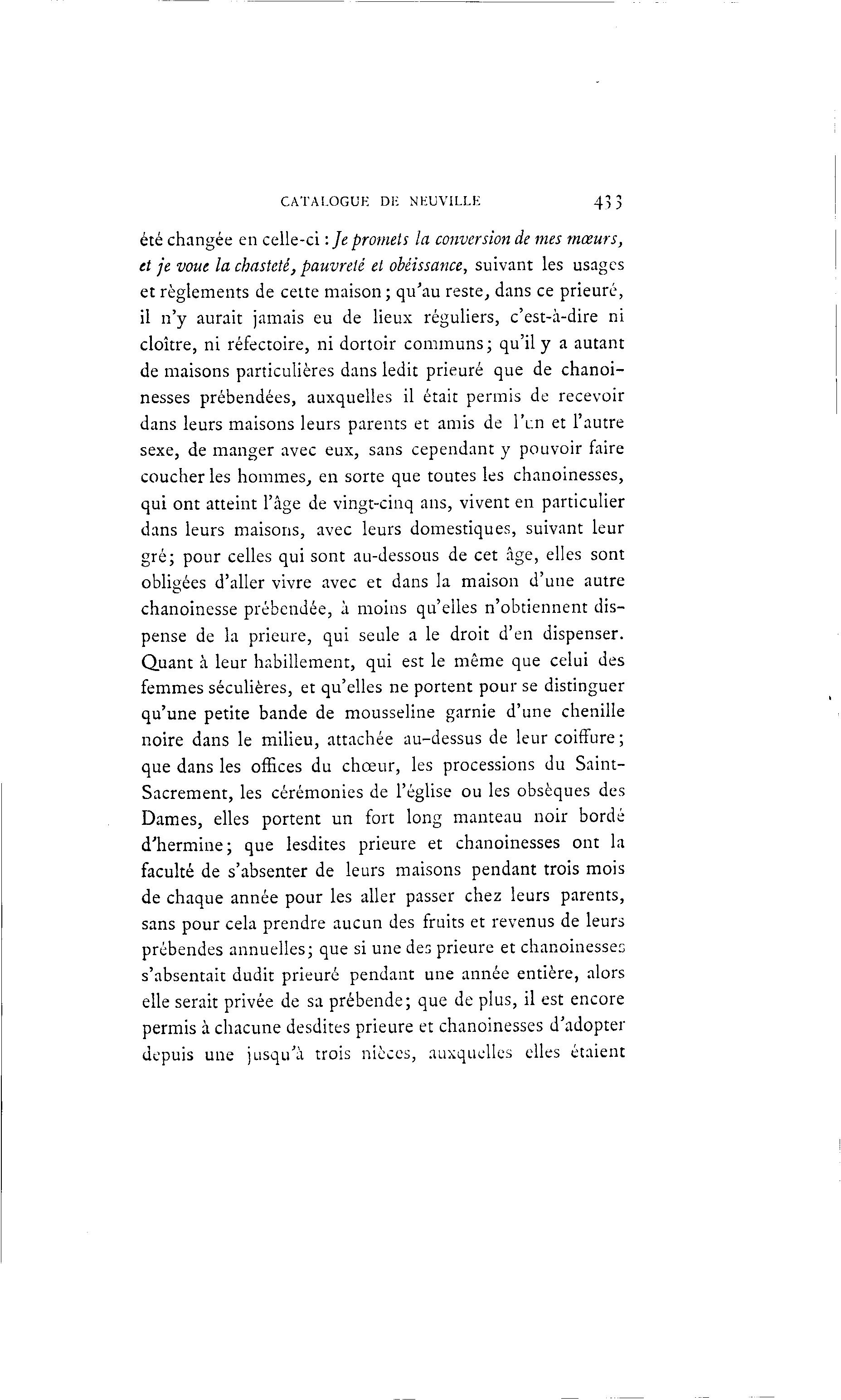 CATAI-OGUK DH NEUVILLE 43 3 été changée en celle-ci : Je promets la conversion de mes mœurs, et je voue la chasteté, pauvreté el obéissance, suivant les usages et règlements de cette maison ; qu'au reste, dans ce prieuré, il n'y aurait jamais eu de lieux réguliers, c'est-à -dire ni cloître, ni réfectoire, ni dortoir communs; qu'il y a autant de maisons particulières dans ledit prieuré que de chanoi- nesses prébendées, auxquelles il était permis de recevoir dans leurs maisons leurs parents et amis de l'un et l'autre sexe, de manger avec eux, sans cependant y pouvoir faire coucher les hommes, en sorte que toutes les chanoinesses, qui ont atteint l'âge de vingt-cinq ans, vivent en particulier dans leurs maisons, avec leurs domestiques, suivant leur gré; pour celles qui sont au-dessous de cet âge, elles sont obligées d'aller vivre avec et dans la maison d'une autre chanoinesse prébendée, à moins qu'elles n'obtiennent dis- pense de la prieure, qui seule a le droit d'en dispenser. Quant à leur habillement, qui est le même que celui des femmes séculières, et qu'elles ne portent pour se distinguer qu'une petite bande de mousseline garnie d'une chenille noire dans le milieu, attachée au-dessus de leur coiffure ; que dans les offices du chœur, les processions du Saint- Sacrement, les cérémonies de l'église ou les obsèques des Dames, elles portent un fort long manteau noir bordé d'hermine; que lesdites prieure et chanoinesses ont la faculté de s'absenter de leurs maisons pendant trois mois de chaque année pour les aller passer chez leurs parents, sans pour cela prendre aucun des fruits et revenus de leurs prébendes annuelles; que si une des prieure et chanoinesses s'absentait dudit prieuré pendant une année entière, alors elle serait privée de sa prébende; que de plus, il est encore permis à chacune desdites prieure et chanoinesses d'adopter depuis une jusqu'à trois nièces, auxquelles elles étaient