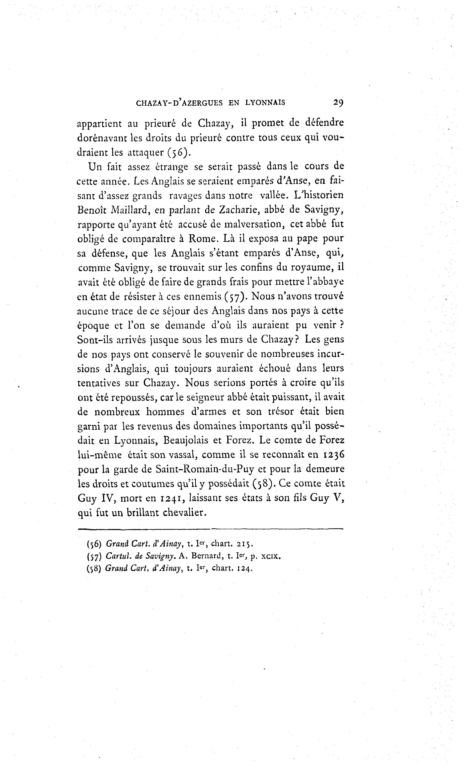 CHAZAY-D'AZERGUES EN LYONNAIS 2<) appartient au prieuré de Chazay, il promet de défendre dorénavant les droits du prieuré contre tous ceux qui vou- draient les attaquer (56). Un fait assez étrange se serait passé dans le cours de cette année. Les Anglais se seraient emparés d'Anse, en fai- sant d'assez grands ravages dans notre vallée. L'historien Benoît Maillard, en parlant de Zacharie, abbé de Savigny, rapporte qu'ayant été accusé de malversation, cet abbé fut obligé de comparaître à Rome. Là il exposa au pape pour sa défense, que les Anglais s'étant emparés d'Anse, qui, comme Savigny, se trouvait sur les confins du royaume, il avait été obligé de faire de grands frais pour mettre l'abbaye en état de résister à ces ennemis (57). Nous n'avons trouvé aucune trace de ce séjour des Anglais dans nos pays à cette époque et l'on se demande d'où ils auraient pu venir ? Sont-ils arrivés jusque sous les murs de Chazay? Les gens de nos pays ont conservé le souvenir de nombreuses incur- sions d'Anglais, qui toujours auraient échoué dans leurs tentatives sur Chazay. Nous serions portés à croire qu'ils ont été repoussés, car le seigneur abbé était puissant, il avait de nombreux hommes d'armes et son trésor était bien garni par les revenus des domaines importants qu'il possé- dait en Lyonnais, Beaujolais et Forez. Le comte de Forez lui-même était son vassal, comme il se reconnaît en 1236 pour la garde de Saint-Romain-du-Puy et pour la demeure les droits et coutumes qu'il y possédait (58). Ce comte était Guy IV, mort en 1241, laissant ses états à son fils Guy V, qui fut un brillant chevalier. (56) Grand Cari. d'Ainay, t. I e r , chart. 215. (57) Cartul. de Savigny. A. Bernard, t. I » , p. xcix. (58) Grand Cart. d'Ainay, t. I e r , chart. 124.