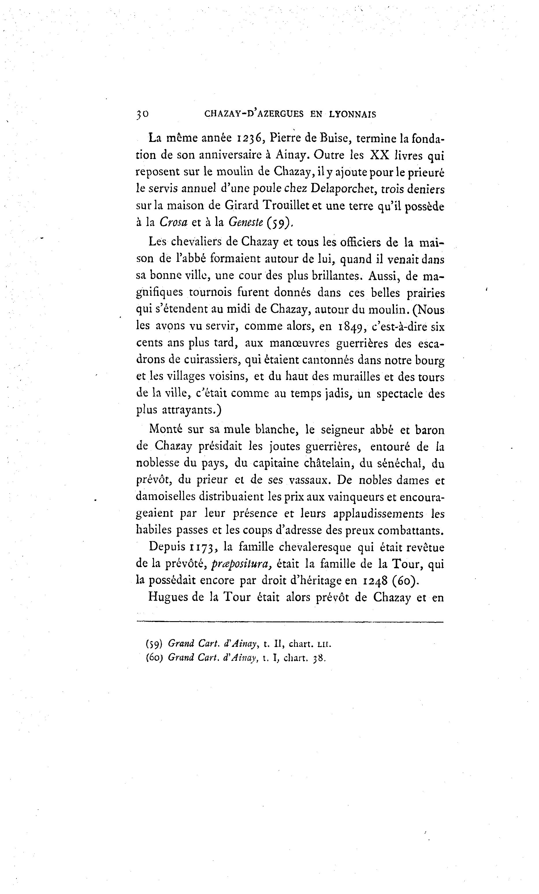 30 CHAZAY-D'AZERGUES EN LYONNAIS La même année 1236, Pierre deBuise, termine la fonda- tion de son anniversaire à Ainay. Outre les XX livres qui reposent sur le moulin de Chazay, il y ajoute pour le prieuré le servis annuel d'une poule chez Delaporchet, trois deniers sur la maison de Girard Trouillet et une terre qu'il possède à la Crosa et à la Geneste (59). Les chevaliers de Chazay et tous les officiers de la mai- son de l'abbé formaient autour de lui, quand il venait dans sa bonne ville, une cour des plus brillantes. Aussi, de ma- gnifiques tournois furent donnés dans ces belles prairies qui s'étendent au midi de Chazay, autour du moulin. (Nous les avons vu servir, comme alors, en 1849, c'est-à -dire six cents ans plus tard, aux manœuvres guerrières des esca- drons de cuirassiers, qui étaient cantonnés dans notre bourg et les villages voisins, et du haut des murailles et des tours de la ville, c'était comme au temps jadis, un spectacle des plus attrayants.) Monté sur sa mule blanche, le seigneur abbé et baron de Chazay présidait les joutes guerrières, entouré de la noblesse du pays, du capitaine châtelain, du sénéchal, du prévôt, du prieur el de ses vassaux. De nobles dames et damoiselles distribuaient les prix aux vainqueurs et encoura- geaient par leur présence et leurs applaudissements les habiles passes et les coups d'adresse des preux combattants. Depuis 1173, la famille chevaleresque qui était revêtue de la prévôté, prœpositura, était la famille de la Tour, qui la possédait encore par droit d'héritage en 1248 (60). Hugues de la Tour était alors prévôt de Chazay et en (59) Grand Cart. £ Ainay, t. II, chart. LU. (60) Grand Cart. d'Ainay, t. I, chart. 38.