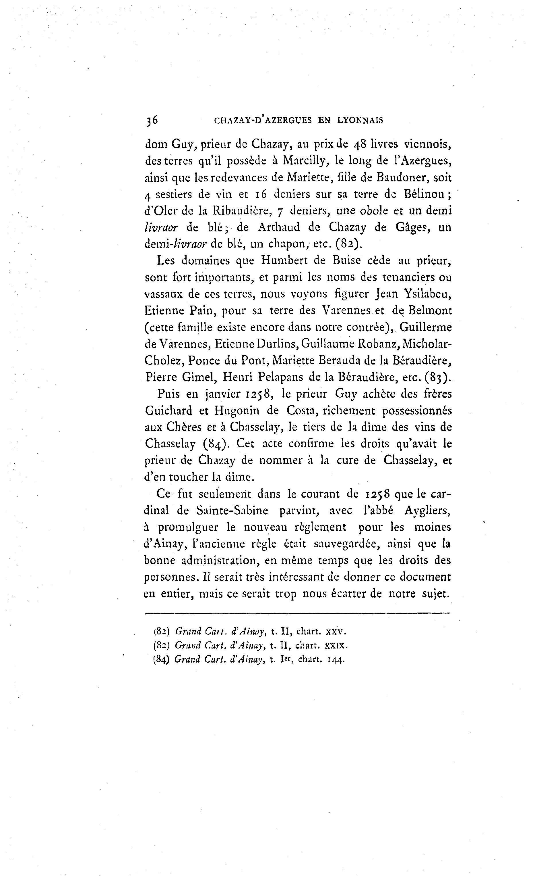 36 CHAZAY-D'AZERGUES EN LYONNAIS dom Guy, prieur de Chazay, au prix de 48 livres viennois, des terres qu'il possède à Marcilly, le long de l'Azergues, ainsi que les redevances de Mariette, fille de Baudoner, soit 4 sestiers de vin et 16 deniers sur sa terre de Bêlinon ; d'Oler de la Ribaudière, 7 deniers, une obole et un demi livraor de blé; de Arthaud de Chazay de Gage?, un à emi-livraor de blé, un chapon, etc. (82). Les domaines que Humbert de Buise cède au prieur, sont fort importants, et parmi les noms des tenanciers ou vassaux de ces terres, nous voyons figurer Jean Ysilabeu, Etienne Pain, pour sa terre des Varennes et de Belmont (cette famille existe encore dans notre contrée), Guillerme de Varennes, Etienne Durlins, Guillaume Robanz, Micholar- Cholez, Ponce du Pont, Mariette Berauda de la Béraudière, Pierre Gimel, Henri Pelapans de la Béraudière, etc. (83). Puis en janvier 1258, le prieur Guy achète des frères Guichard et Hugonin de Costa, richement possessionnés aux Chères et à Chasselay, le tiers de la dîme des vins de Chasselay (84). Cet acte confirme les droits qu'avait le prieur de Chazay de nommer à la cure de Chasselay, et d'en toucher la dîme. Ce fut seulement dans le courant de 1258 que le car- dinal de Sainte-Sabine parvint, avec l'abbé AygHers, à promulguer le nouveau règlement pour les moines d'Ainay, l'ancienne règle était sauvegardée, ainsi que la bonne administration, en même temps que les droits des personnes. Il serait très intéressant de donner ce document en entier, mais ce serait trop nous écarter de notre sujet. (82) Grand Cari. d'Ainay, t. II, chart. xxv. (82) Grand Cart. d'Ainay, t. II, chart. xxix. (84) Grand Cart. d'Ainay, t. h', chart. 144.