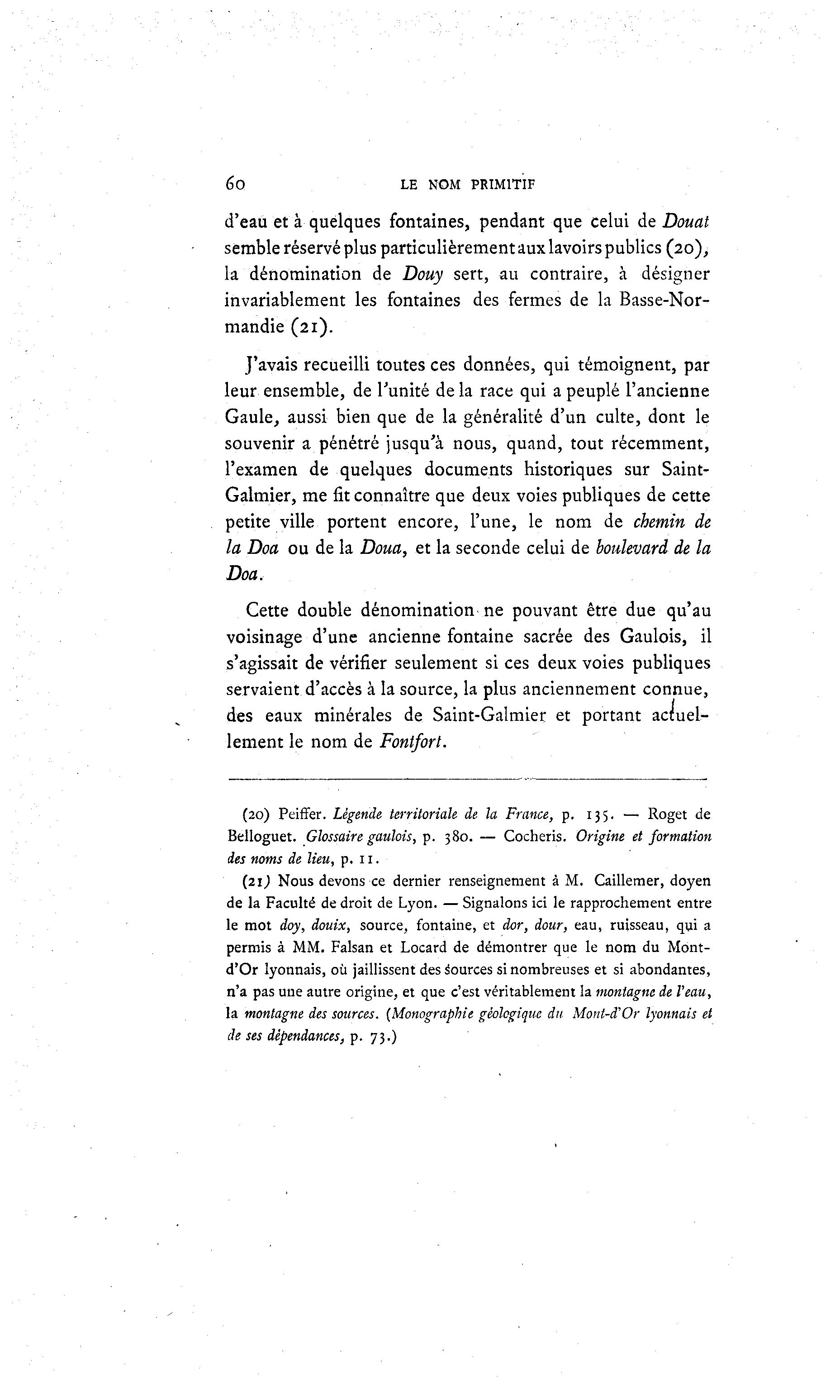 6o LE NOM PRIMITIF d'eau et à quelques fontaines, pendant que celui de Douât semble réservé plus particulièrement aux lavoirs publics (20), la dénomination de Douy sert, au contraire, à désigner invariablement les fontaines des fermes de la Basse-Nor- mandie (21). J'avais recueilli toutes ces données, qui témoignent, par leur ensemble, de l'unité de la race qui a peuplé l'ancienne Gaule, aussi bien que de la généralité d'un culte, dont le souvenir a pénétré jusqu'à nous, quand, tout récemment, l'examen de quelques documents historiques sur Saint- Galmier, me fit connaître que deux voies publiques de cette petite ville portent encore, l'une, le nom de chemin de la Doa ou de la Doua, et la seconde celui de boulevard de la Doa. Cette double dénomination ne pouvant être due qu'au voisinage d'une ancienne fontaine sacrée des Gaulois, il s'agissait de vérifier seulement si ces deux voies publiques servaient d'accès à la source, la plus anciennement connue, des eaux minérales de Saint-Galmier et portant actuel- lement le nom de Fontforl. (20) Peiffer. Légende territoriale de la France, p. 135. — Roget de Belloguet. Glossaire gaulois, p. 380. — Cocheris. Origine et formation des noms de lieu, p. 11. (21,) Nous devons ce dernier renseignement à M. Caillemer, doyen de la Faculté de droit de Lyon. — Signalons ici le rapprochement entre le mot doy, douix, source, fontaine, et dor, dour, eau, ruisseau, qui a permis à MM. Faisan et Locard de démontrer que le nom du Mont- d'Or lyonnais, où jaillissent des Sources si nombreuses et si abondantes, n'a pas une autre origine, et que c'est véritablement la montagne de Veau, la montagne des sources. (Monographie géologique du Mont-d'Or lyonnais et de ses dépendances, p. 73.)