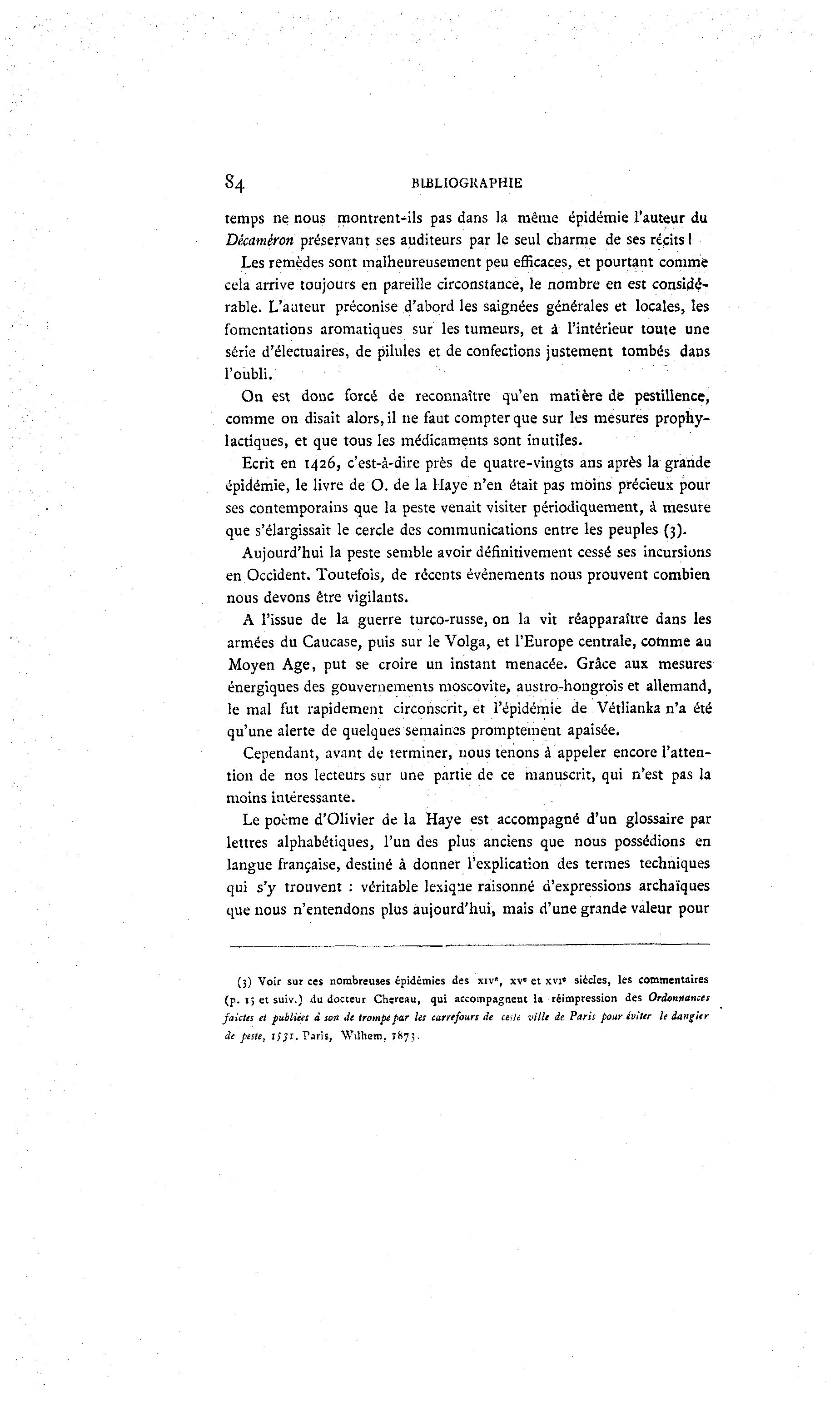 84 BIBLIOGRAPHIE temps ne nous montrent^ils pas dans la même épidémie l'auteur du Dêcaméron préservant ses auditeurs par le seul charme de ses récits I Les remèdes sont malheureusement peu efficaces, et pourtant comme cela arrive toujours en pareille circonstance, le nombre en est considé- rable. L'auteur préconise d'abord les saignées générales et locales, les fomentations aromatiques sur les tumeurs, et à l'intérieur toute une série d'électuaires, de pilules et de confections justement tombés dans l'oubli. On est donc forcé de reconnaître qu'en matière de pestillence, comme on disait alors, il ne faut compter que sur les mesures prophy- lactiques, et que tous les médicaments sont inutiles. Ecrit en 1426, c'est-à -dire près de quatre-vingts ans après la grande épidémie, le livre de O. de la Haye n'en était pas moins précieux pour ses contemporains que la peste venait visiter périodiquement, à mesure que s'élargissait le cercle des communications entre les peuples (3). Aujourd'hui la peste semble avoir définitivement cessé ses incursions en Occident. Toutefois, de récents événements nous prouvent combien nous devons être vigilants. A l'issue de la guerre turco-russe, on la vit réapparaître dans les armées du Caucase, puis sur le Volga, et l'Europe centrale, comme au Moyen Age, put se croire un instant menacée. Grâce aux mesures énergiques des gouvernements moscovite, austro-hongrois et allemand, le mal fut rapidement circonscrit, et l'épidémie de Vétlianka n'a été qu'une alerte de quelques semaines promptement apaisée. Cependant, avant de terminer, nous tenons à appeler encore l'atten- tion de nos lecteurs sur une partie de ce manuscrit, qui n'est pas la moins intéressante. Le poème d'Olivier de la Haye est accompagné d'un glossaire par lettres alphabétiques, l'un des plus anciens que nous possédions en langue française, destiné à donner l'explication des termes techniques qui s'y trouvent : véritable lexique raisonné d'expressions archaïques que nous n'entendons plus aujourd'hui, mais d'une grande valeur pour (3) Voir sur ces nombreuses épidémies des xiv", xv e et xvi e siècles, les commentaires ( p . i , et suiv.) du docteur Chereau, qui accompagnent la réimpression des Ordonnancer fautes et publiées à son de trompe par les carrefours de cette ville de Paris pour éviter le dangitr de peste, lljt. Paris, AV-dhem, 1873.