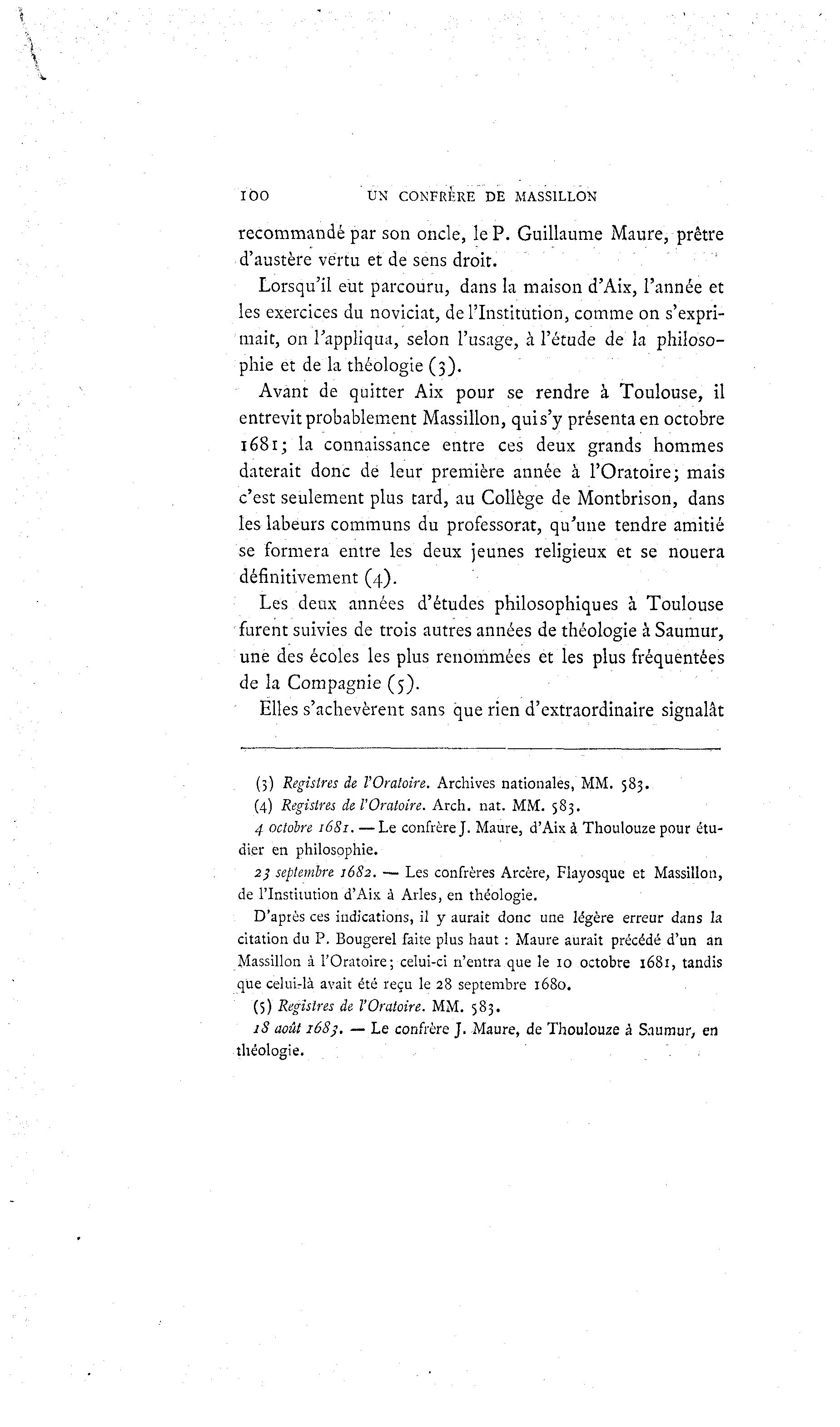 IÔO UN CONFRÈRE DE MASSILLON recommandé par son oncle, le P. Guillaume Maure, prêtre d'austère vertu et de sens droit. Lorsqu'il eut parcouru, dans la maison d'Aix, l'année et les exercices du noviciat, de l'Institution, comme on s'expri- mait, on l'appliqua, selon l'usage, à l'étude de la philoso- phie et de la théologie (3). Avant de quitter Aix pour se rendre à Toulouse, il entrevit probablement Massillon, quis'y présenta en octobre 1681; la connaissance entre ces deux grands hommes daterait donc dé leur première année à l'Oratoire; mais c'est seulement plus tard, au Collège de Montbrison, dans les labeurs communs du professorat, qu'une tendre amitié se formera entre les deux jeunes religieux et se nouera définitivement (4). Les deux années d'études philosophiques à Toulouse furent suivies de trois autres années de théologie à Saumur, une des écoles les plus renommées et les plus fréquentées de la Compagnie (5). Elles s'achevèrent sans que rien d'extraordinaire signalât (3) Registres de l'Oratoire. Archives nationales, MM. 583. (4) Registres de l'Oratoire. Arch. nat. MM. 583. 4 octobre 1681. —Le confrère J. Maure, d'Aix à Thoulouze pour étu- dier en philosophie. 2_; septembre 1682. — Les confrères Arcère, Flayosque et Massillon, de l'Institution d'Aix à Arles, en théologie. D'après ces indications, il y aurait donc une légère erreur dans la citation du P. Bougerel faite plus haut : Maure aurait précédé d'un an Massillon à l'Oratoire; celui-ci n'entra que le 10 octobre 1681, tandis que celuirlà avait été reçu le 28 septembre 1680. (5) Registres de l'Oratoire. MM. 583. 18 août 168}. — Le confrère J. Maure, de Thoulouze à Saumur, en théologie.
